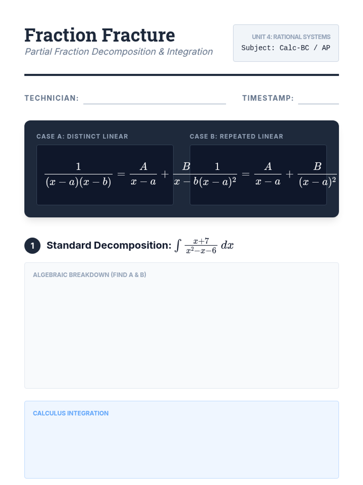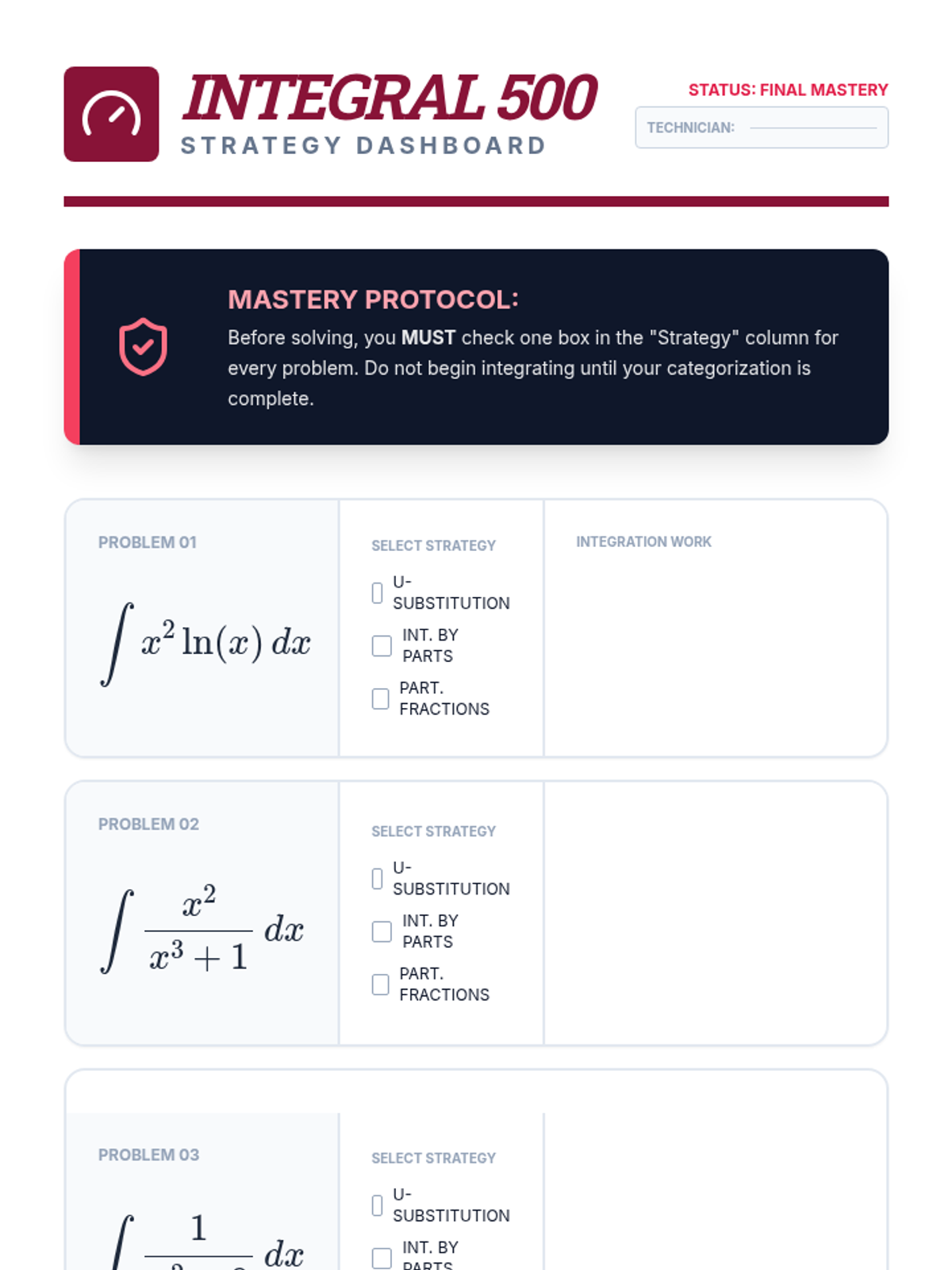 This calculus sequence focuses on mastering complex integration techniques beyond basic antiderivatives. Students learn to navigate Advanced Substitution, Integration by Parts, the Tabular Method, and Partial Fraction Decomposition through a strategy-first lens, culminating in a mastery-based mixed practice challenge.
