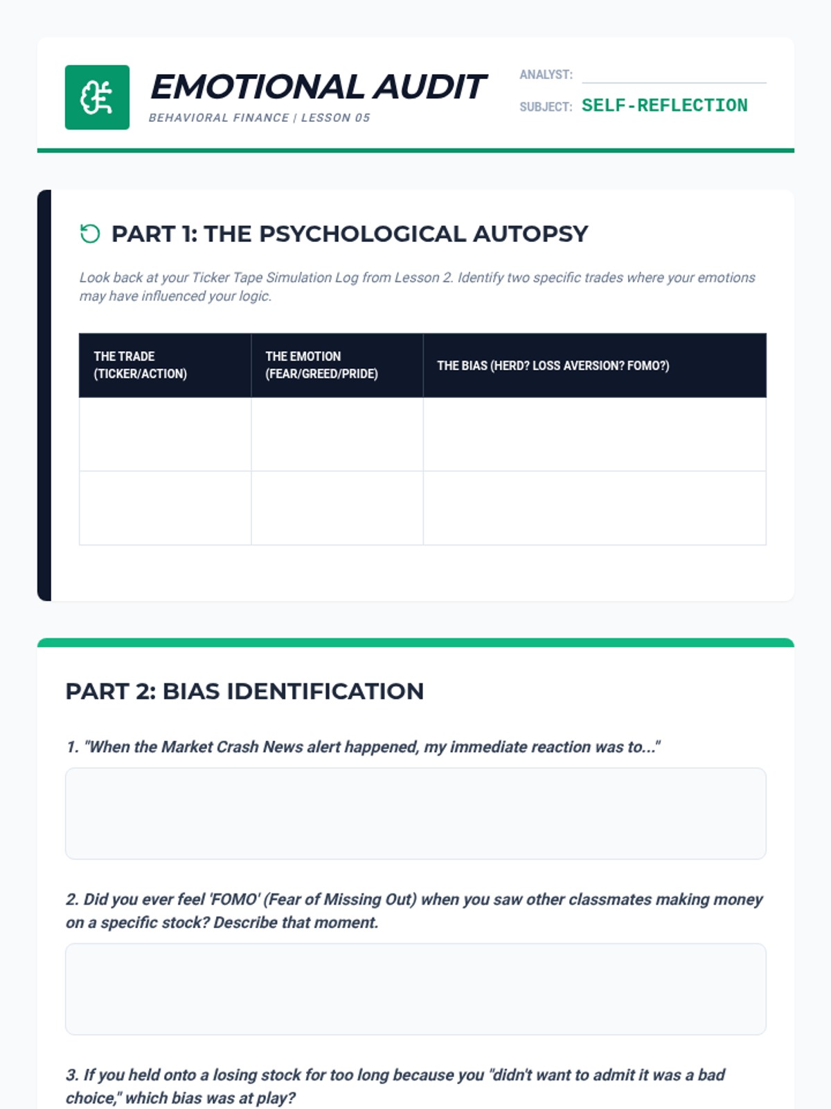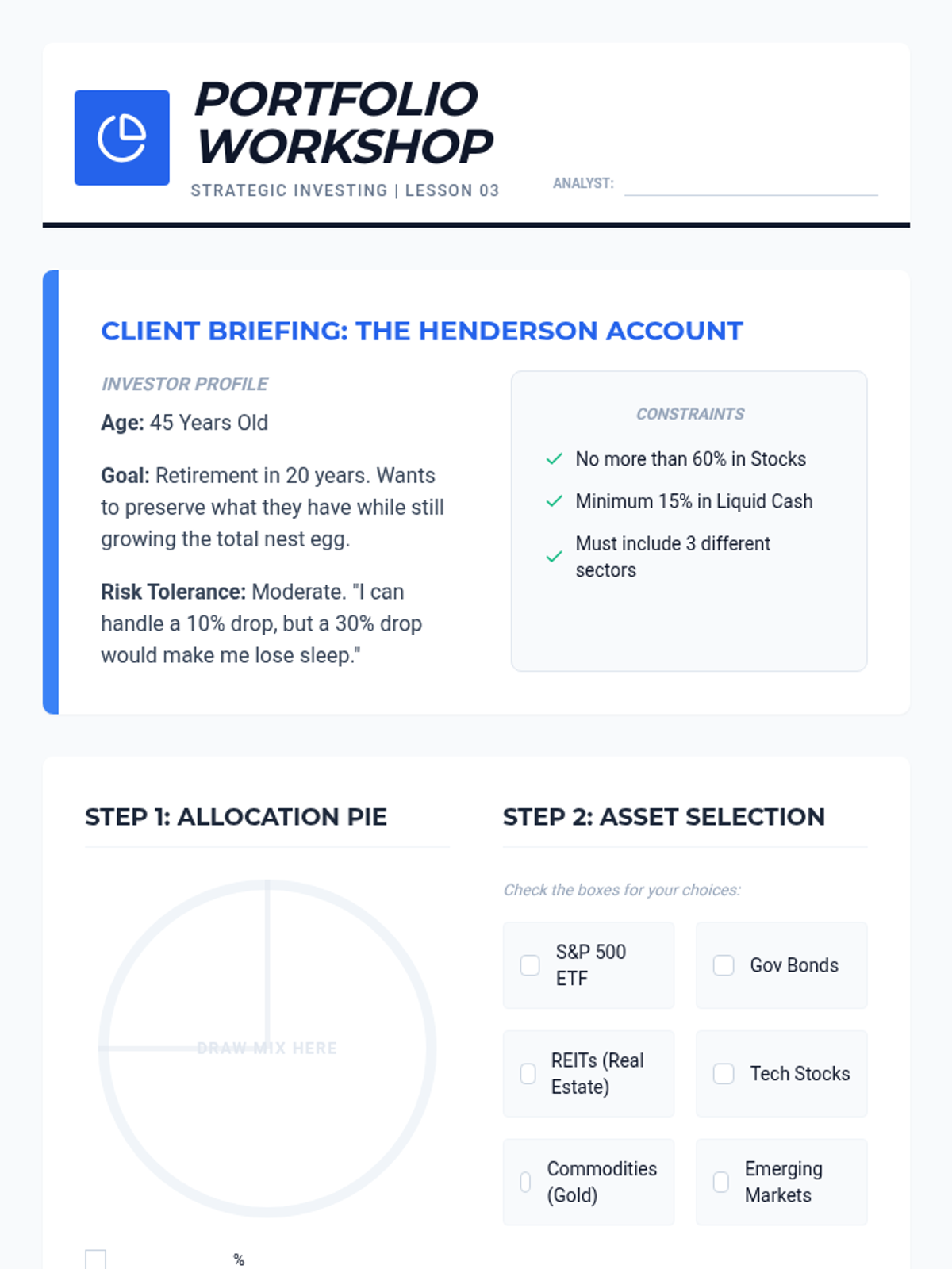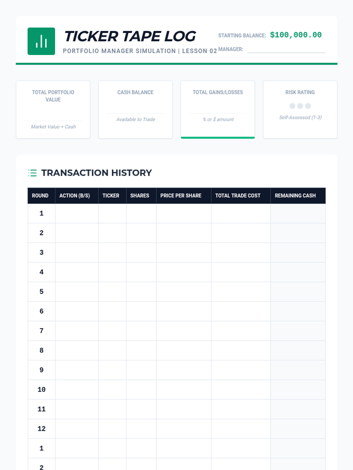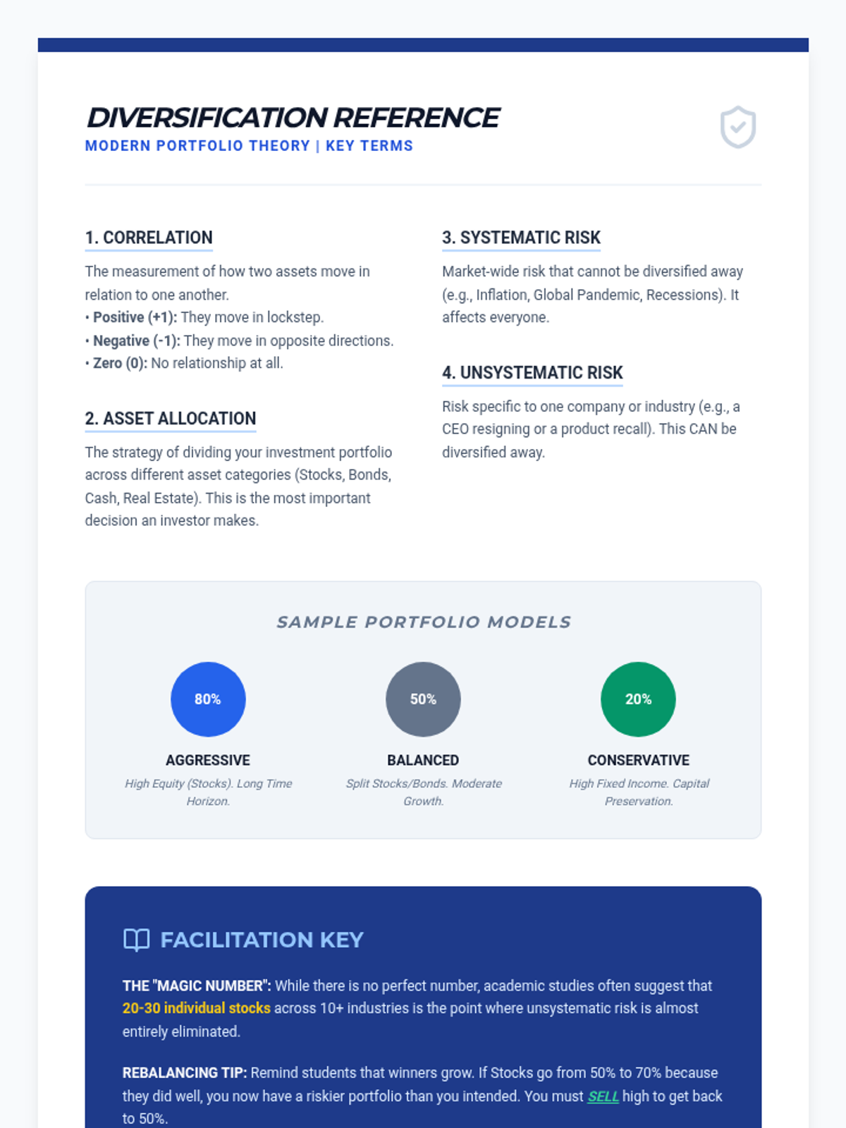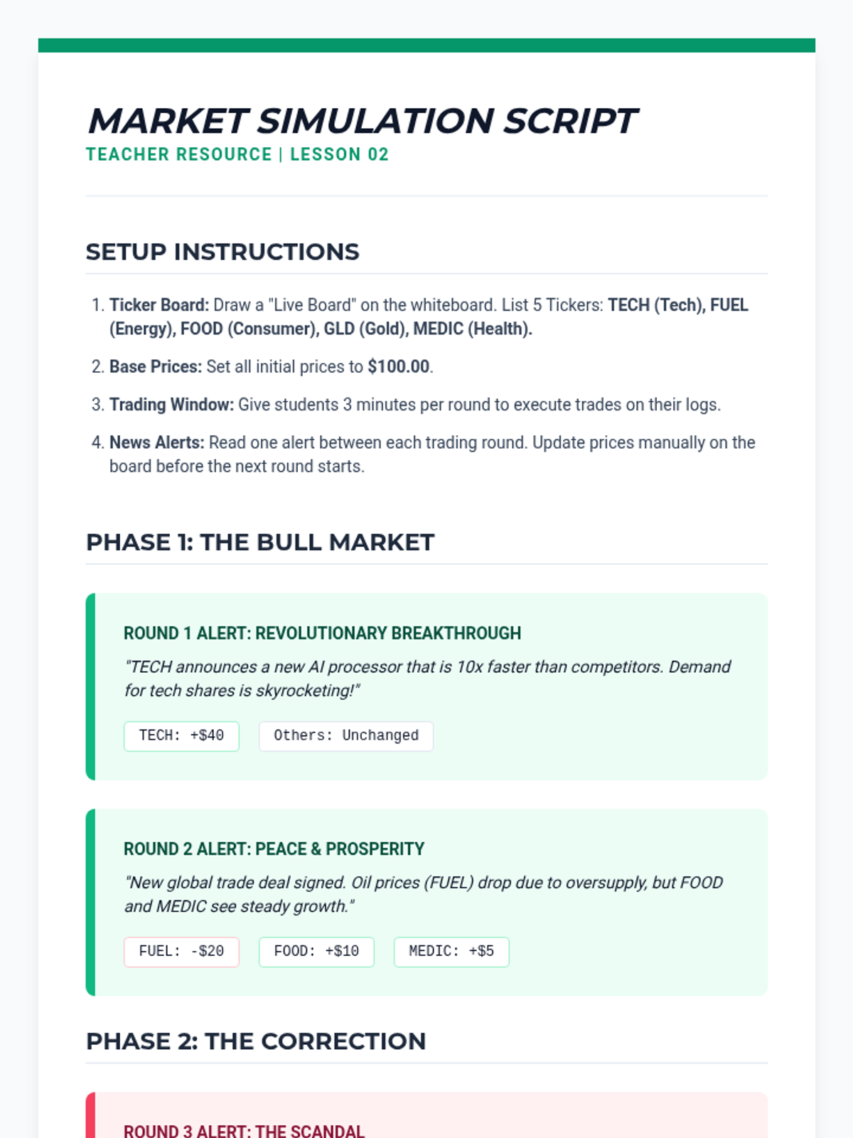 A comprehensive high school economics sequence that uses a gamified, simulation-based approach to teach the fundamentals of investing, market mechanics, and long-term wealth management. Students transition from understanding basic asset classes to building diversified portfolios and managing the psychological aspects of trading.