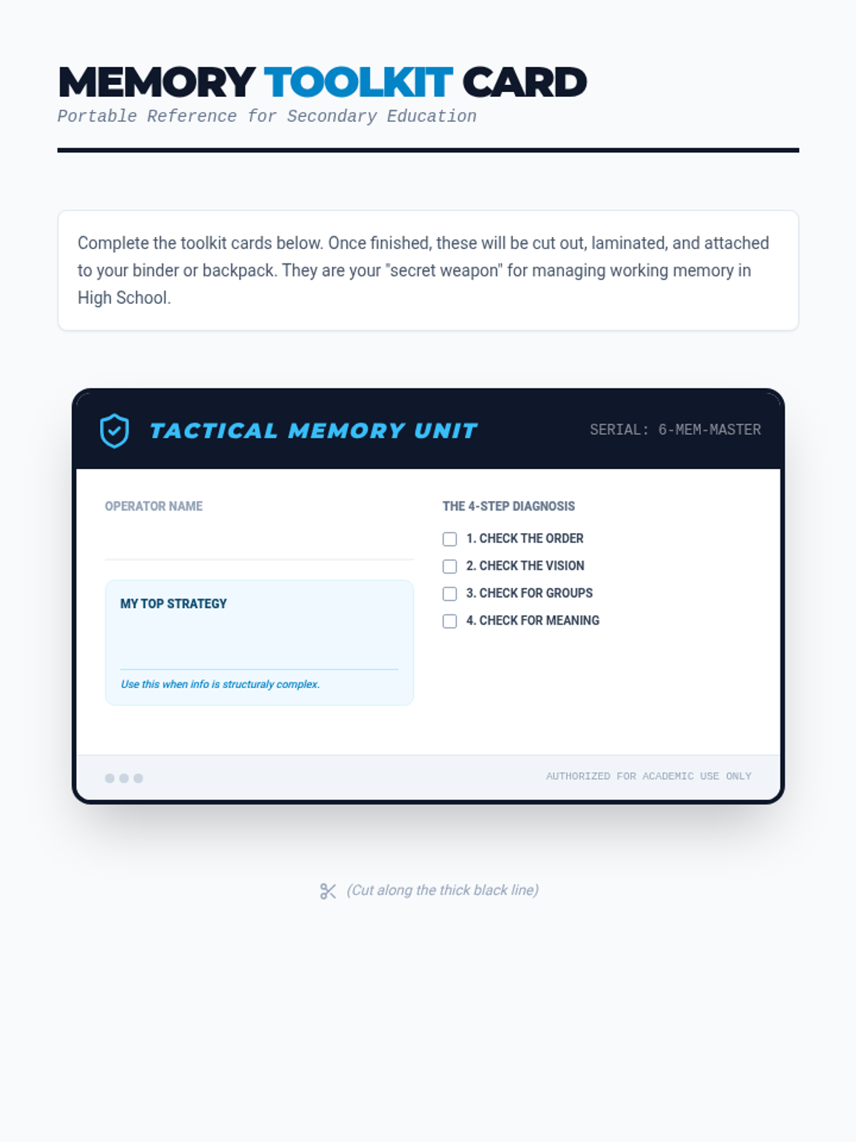 A series of mini-lessons designed to help students understand and optimize their working memory through environmental organization and cognitive strategies.
