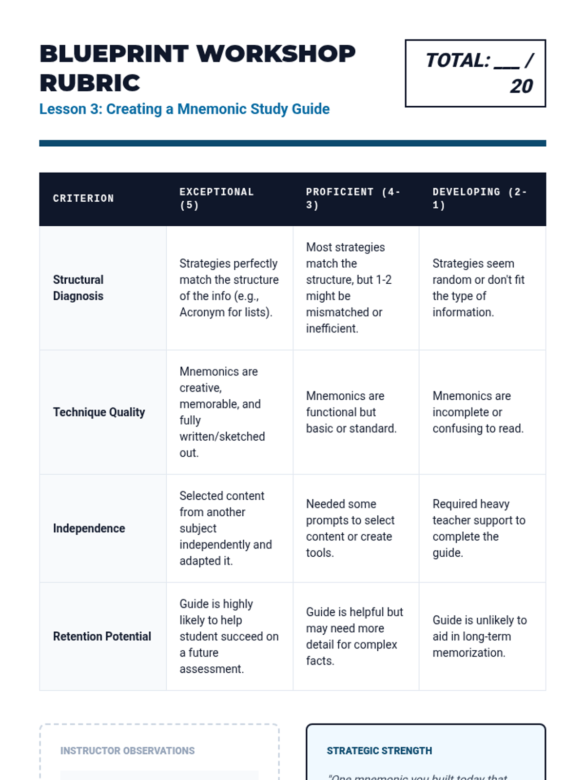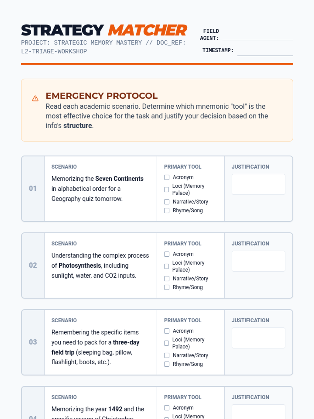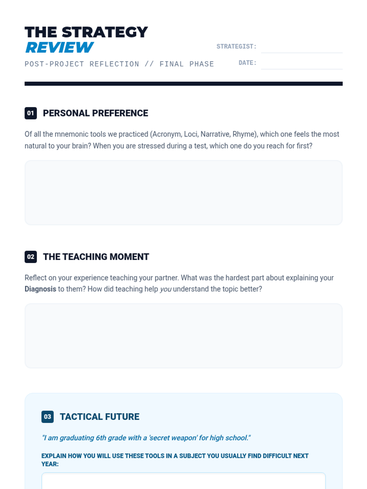 A metacognitive capstone sequence for 6th-grade students focused on analyzing academic tasks and applying the most effective mnemonic strategies (acronyms, loci, narrative, rhyme) for long-term memory success.