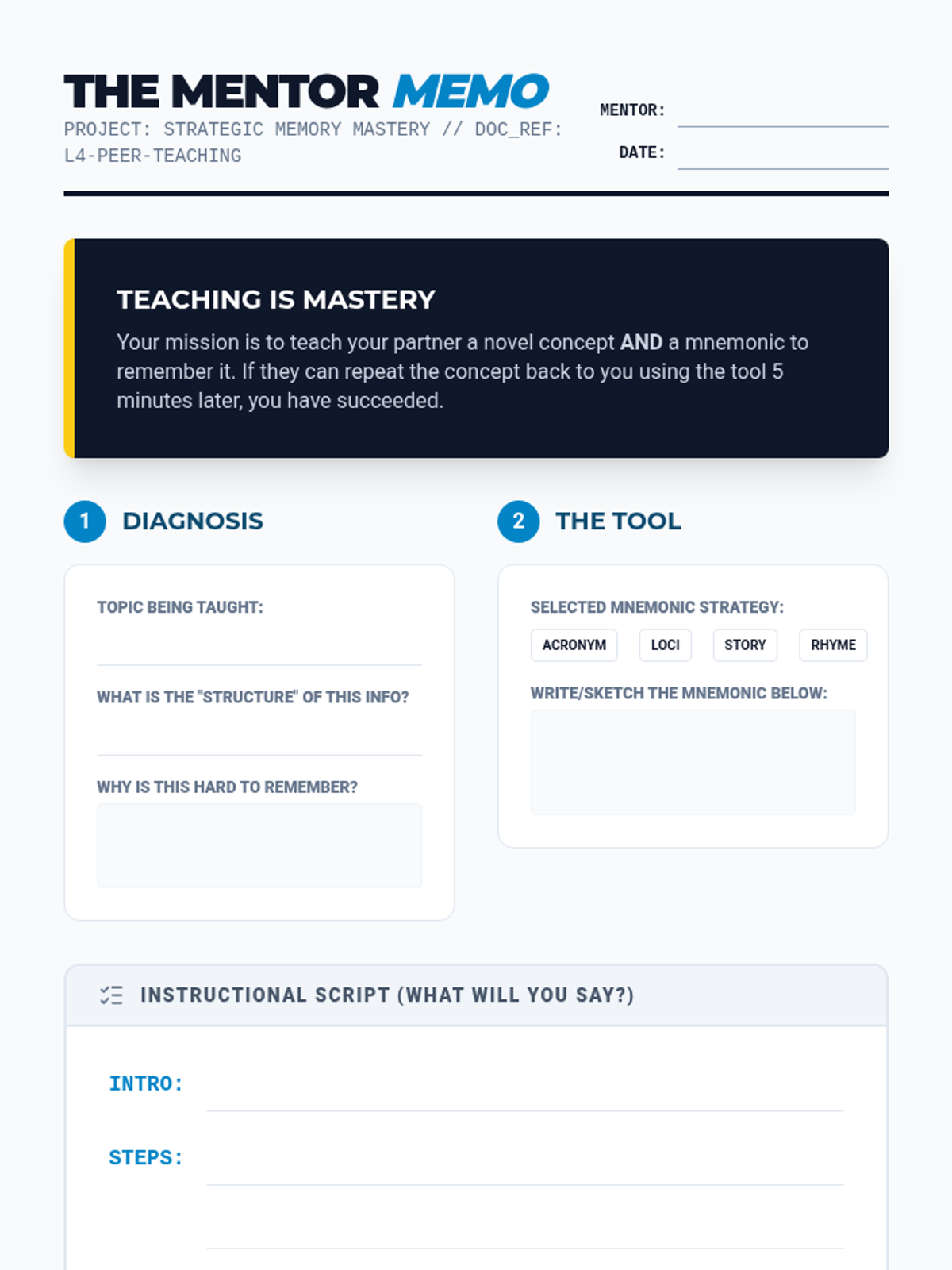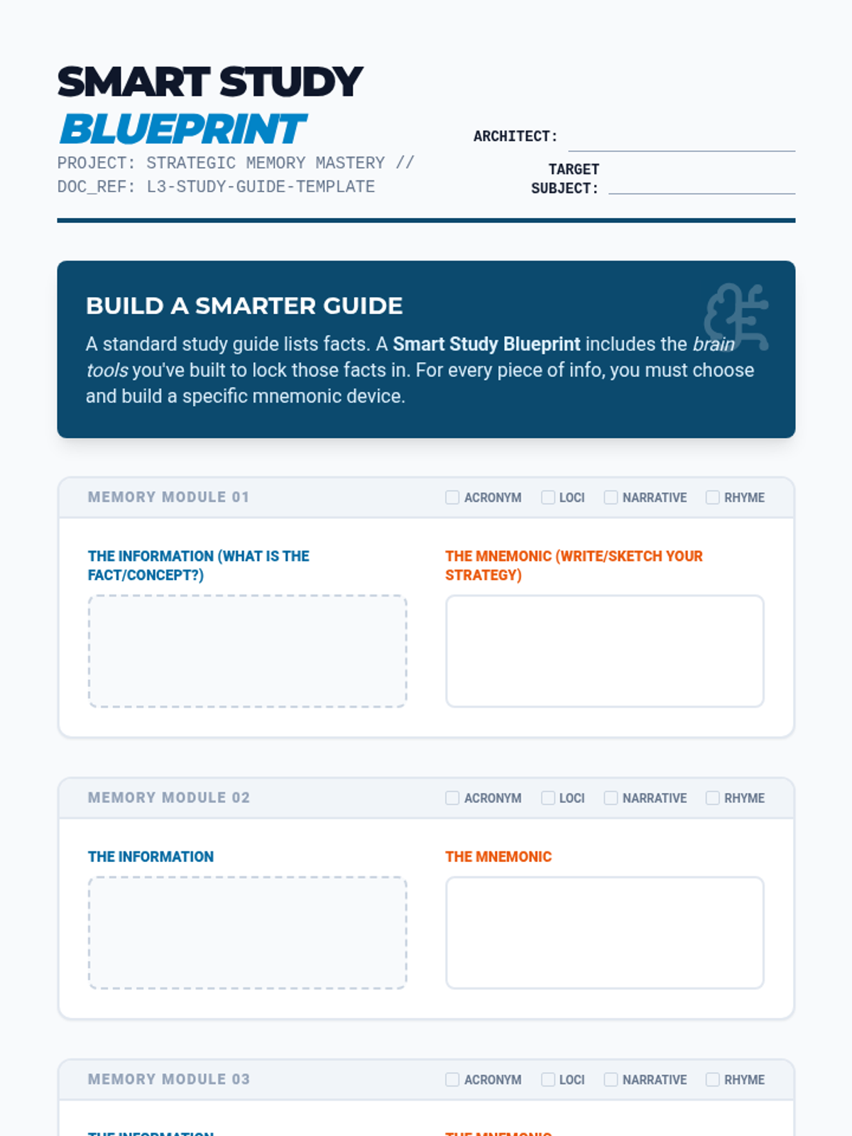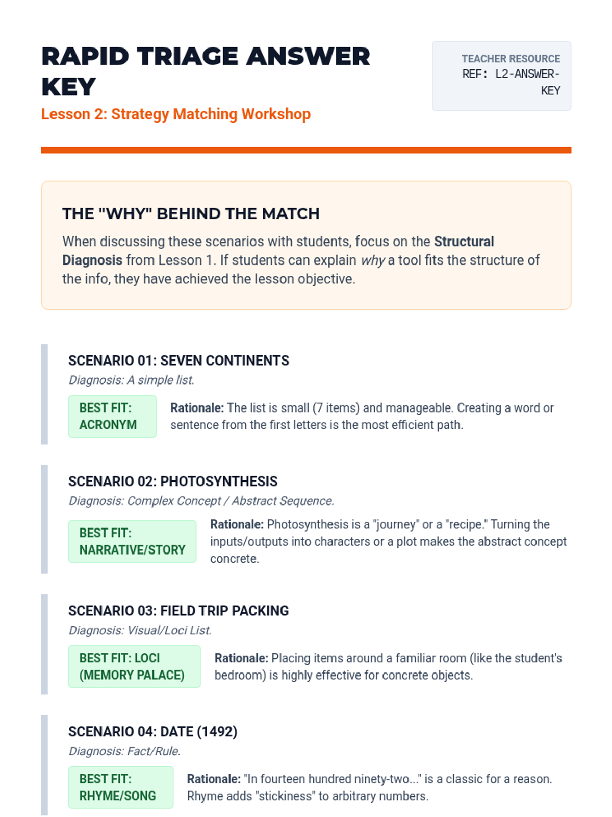 A metacognitive capstone sequence for 6th-grade students focused on analyzing academic tasks and applying the most effective mnemonic strategies (acronyms, loci, narrative, rhyme) for long-term memory success.