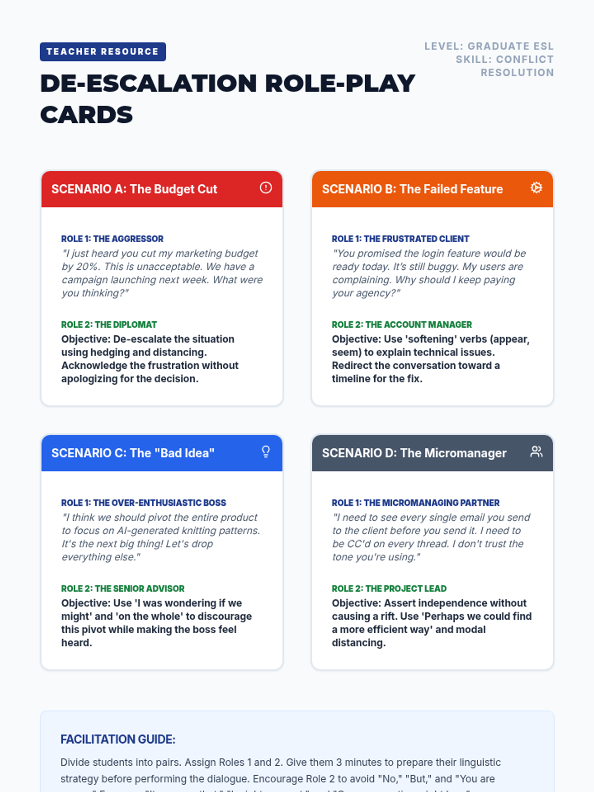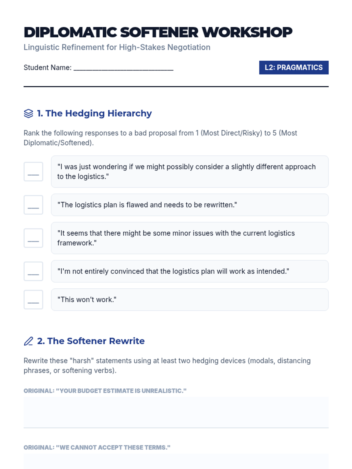 A high-level ESL sequence for graduate students focusing on linguistic maneuvering, cultural dimensions of discourse, and diplomatic negotiation strategies in international professional contexts. Students analyze intercultural communication styles and master the art of 'saving face' through advanced English speaking techniques.