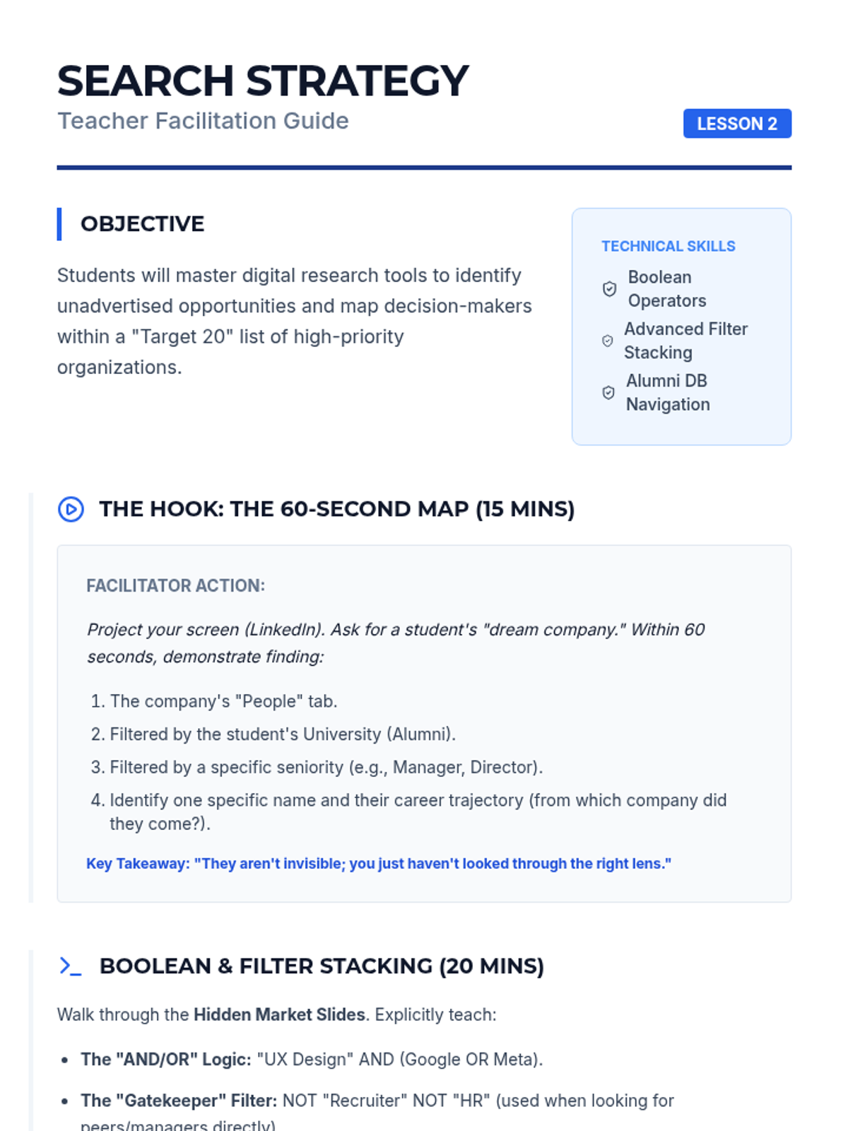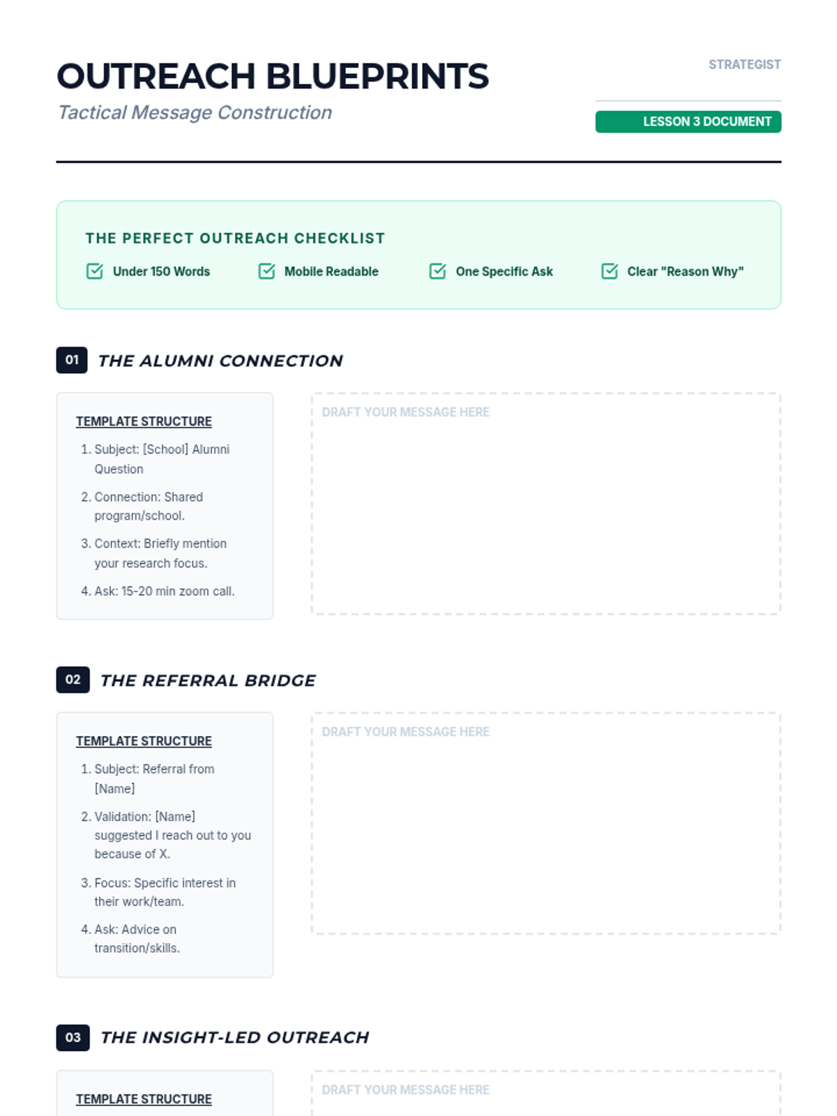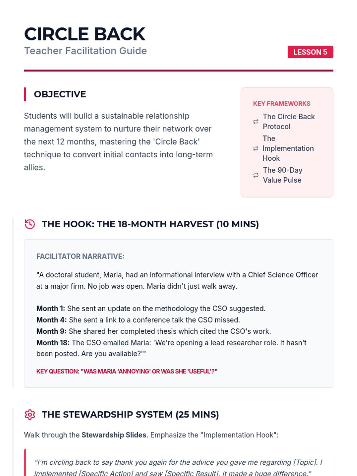 This advanced sequence guides graduate students through the strategic development of a professional network essential for accessing the hidden job market. Students move from refining their personal narrative and value proposition to tactical digital mapping, effective outreach, informational interviewing, and long-term relationship stewardship.