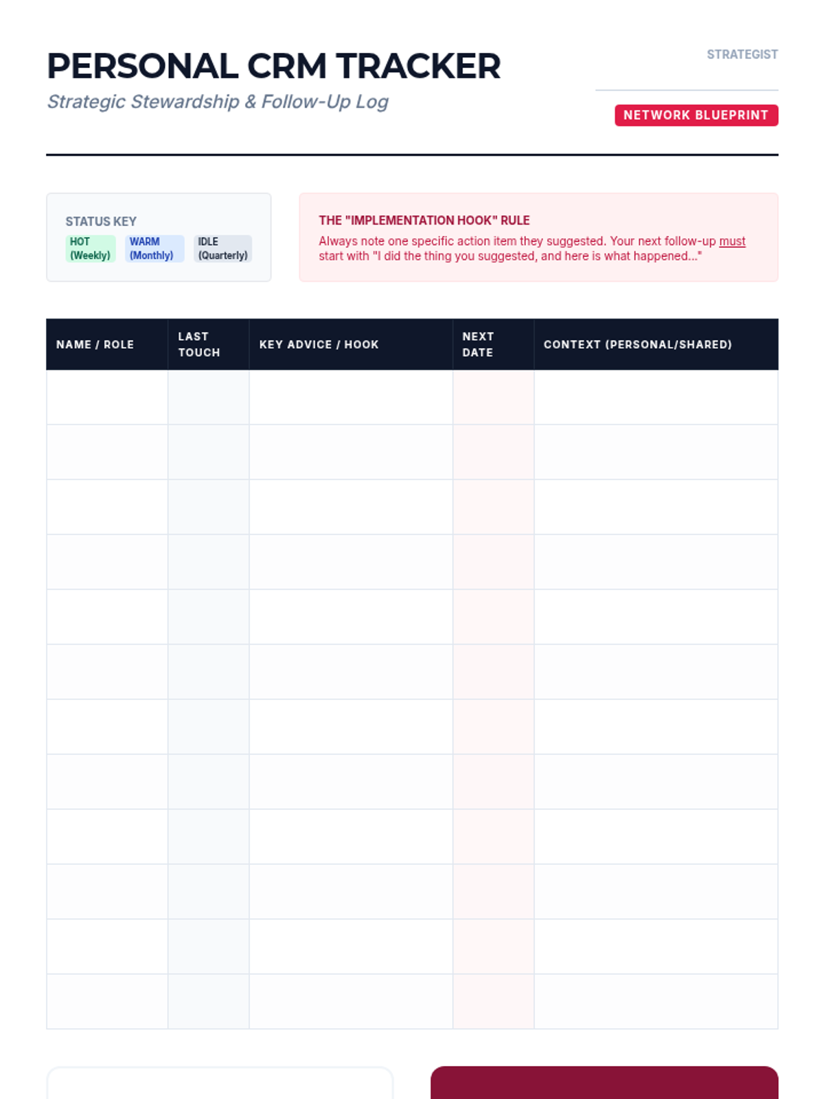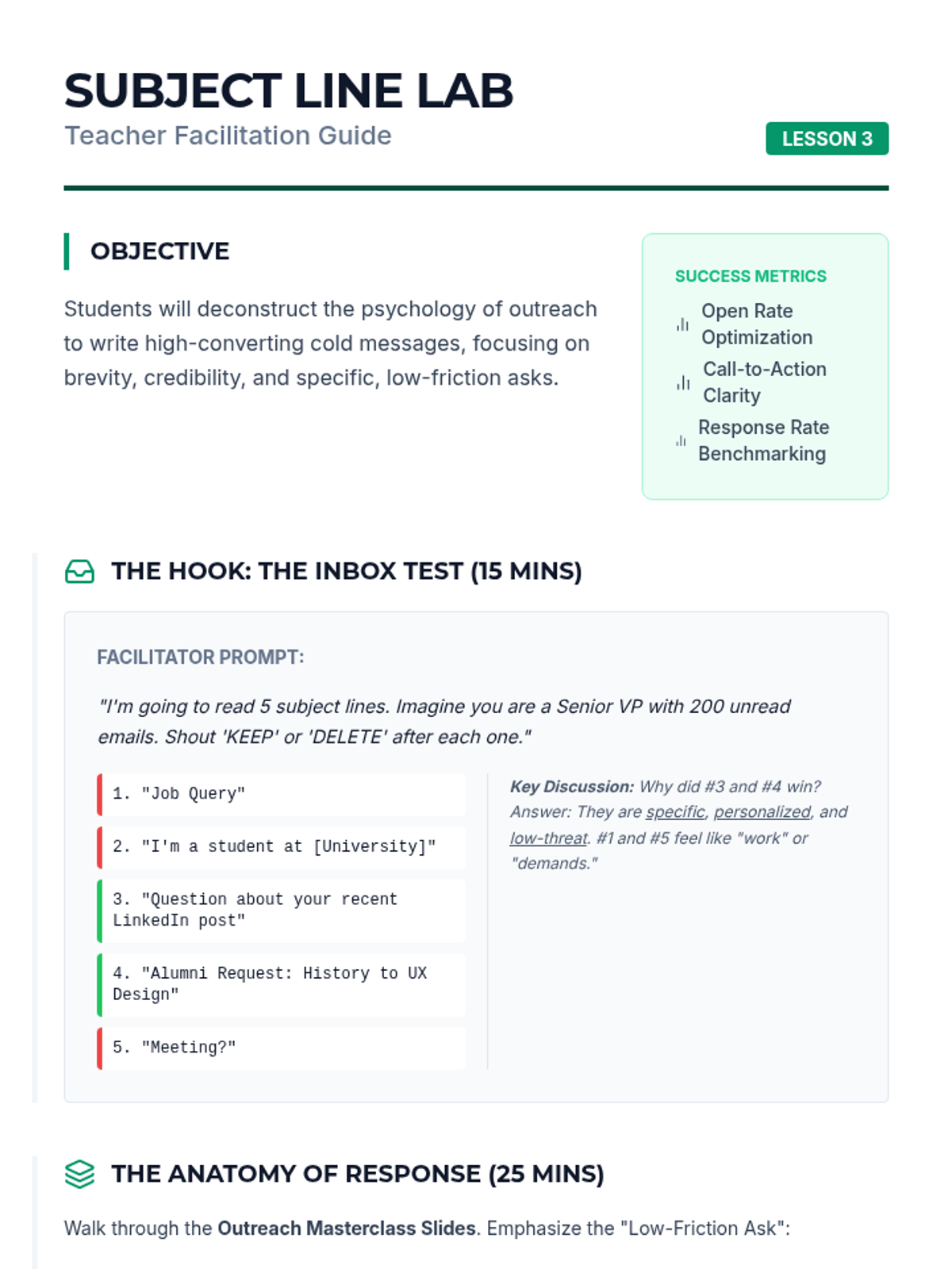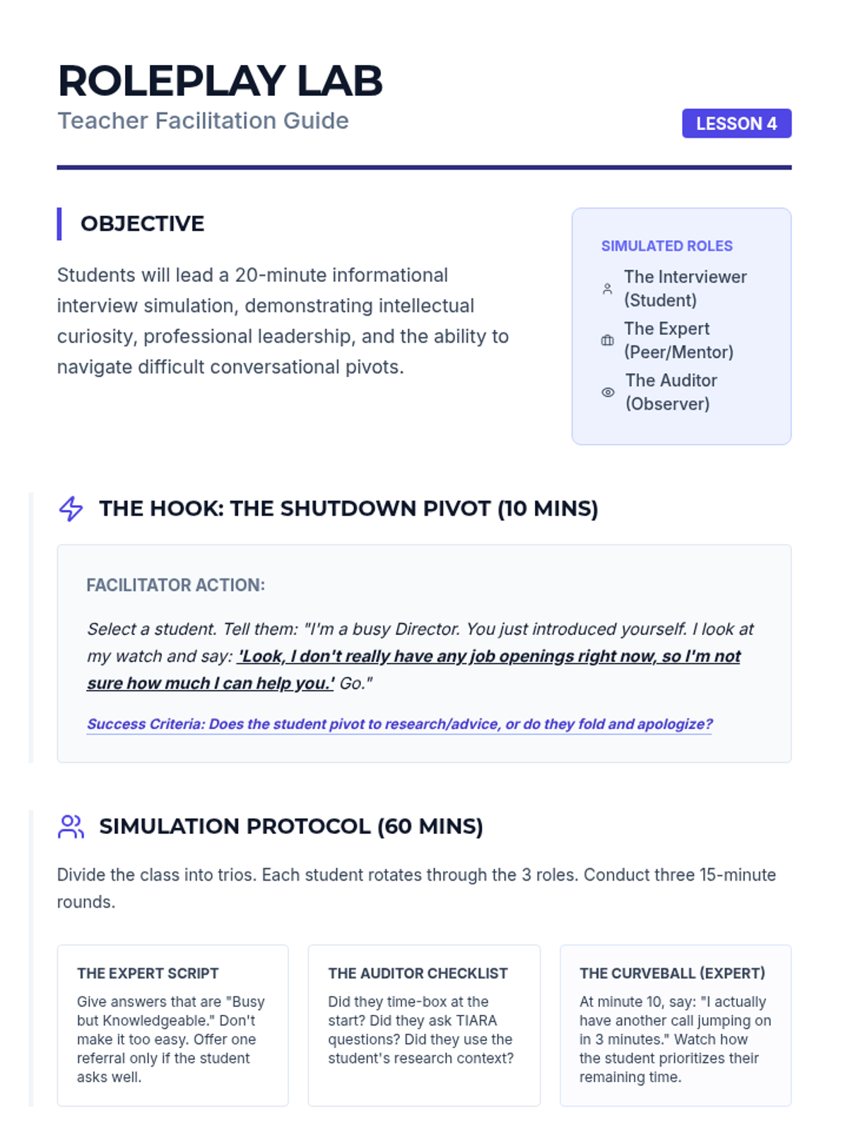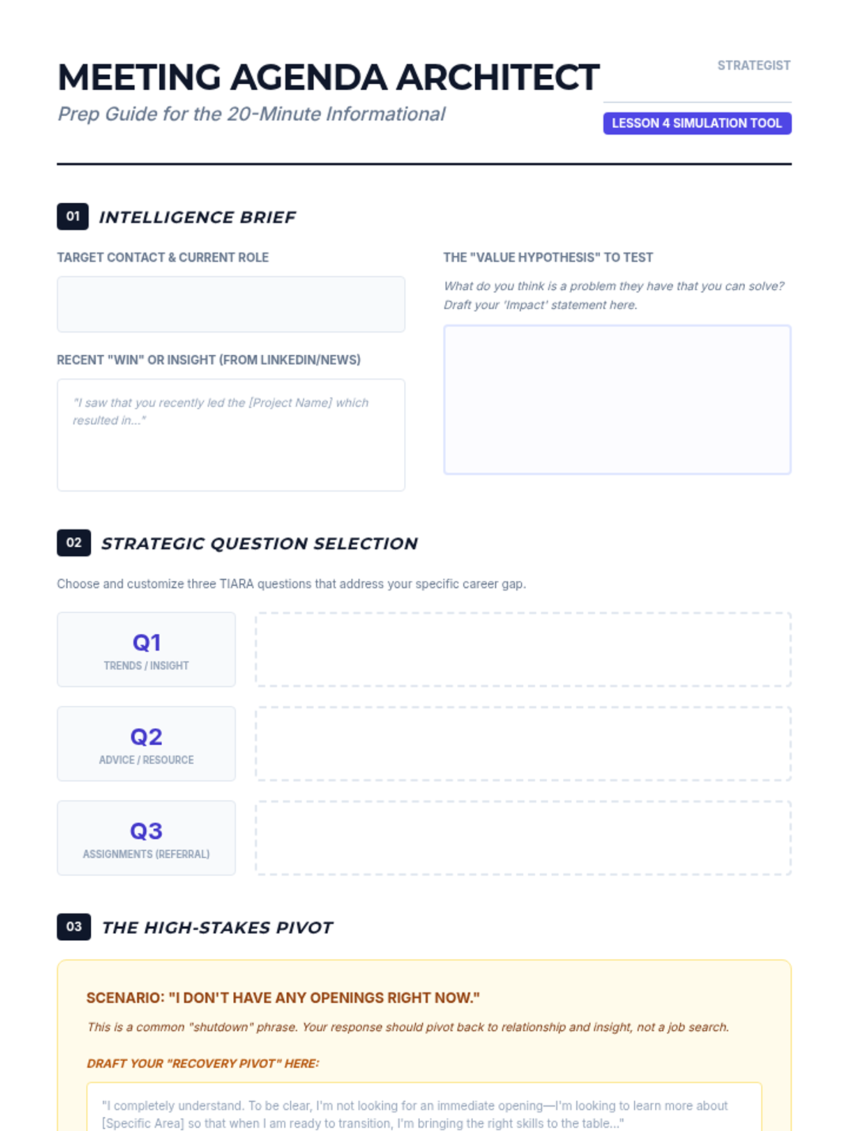 This advanced sequence guides graduate students through the strategic development of a professional network essential for accessing the hidden job market. Students move from refining their personal narrative and value proposition to tactical digital mapping, effective outreach, informational interviewing, and long-term relationship stewardship.