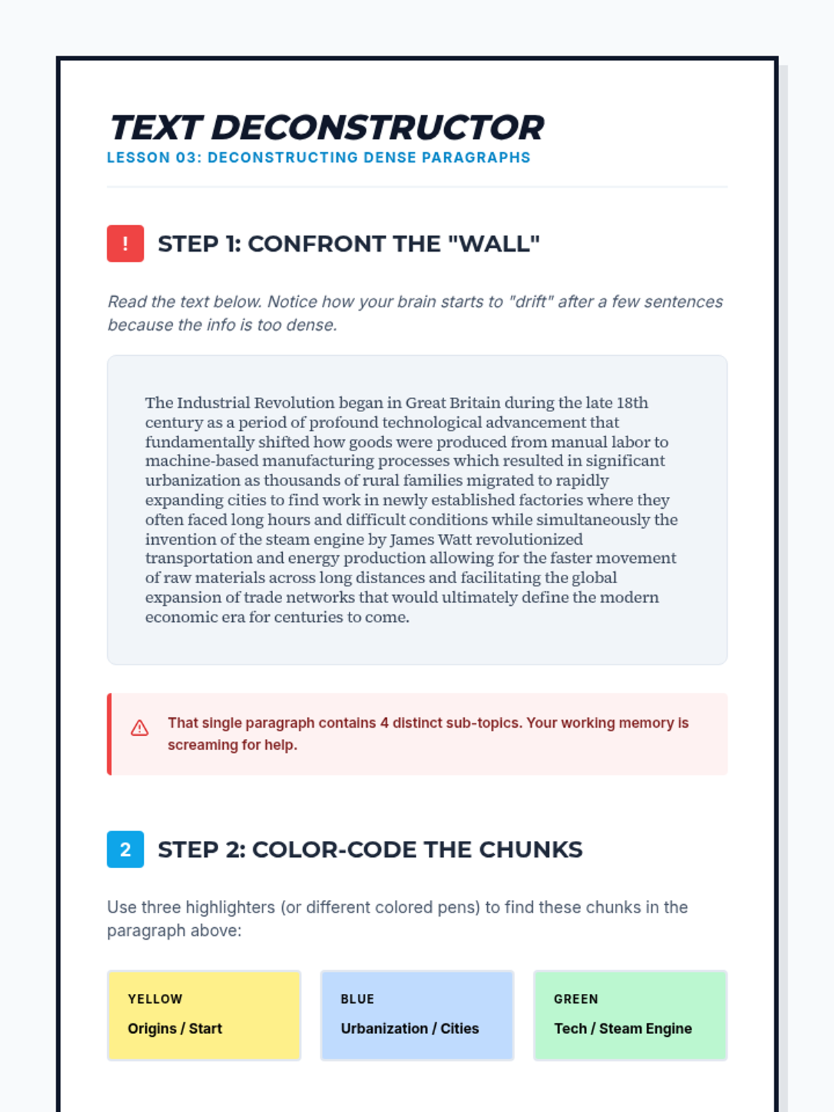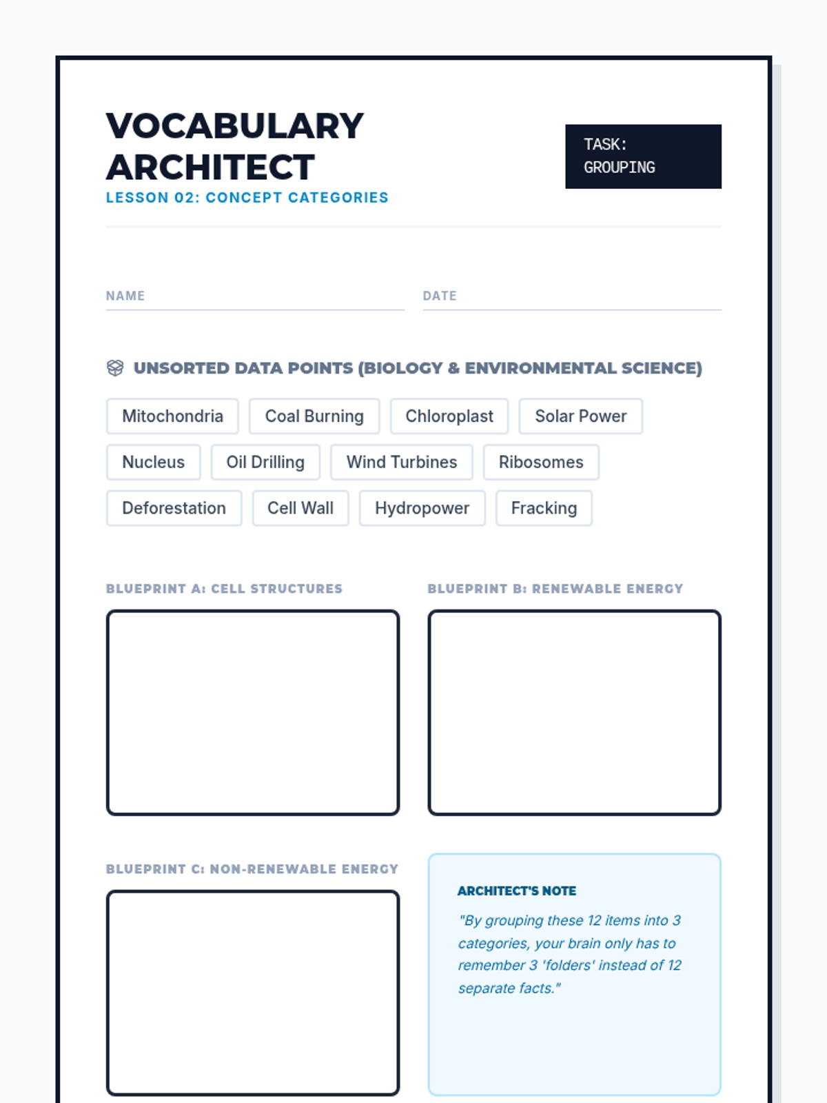 A 5-lesson sequence designed for 10th-grade students with working memory needs. This sequence focuses on teaching 'chunking' strategies to manage cognitive load, categorize academic vocabulary, deconstruct dense text, and create visual study maps.