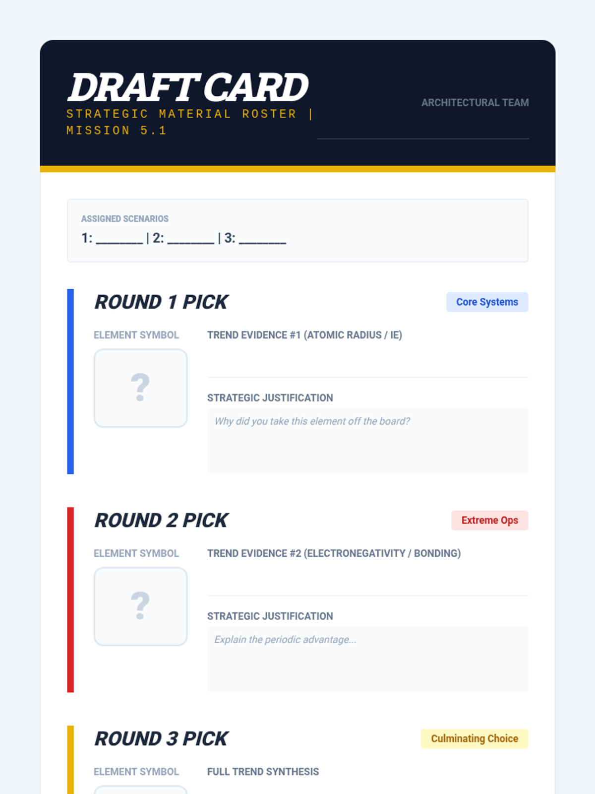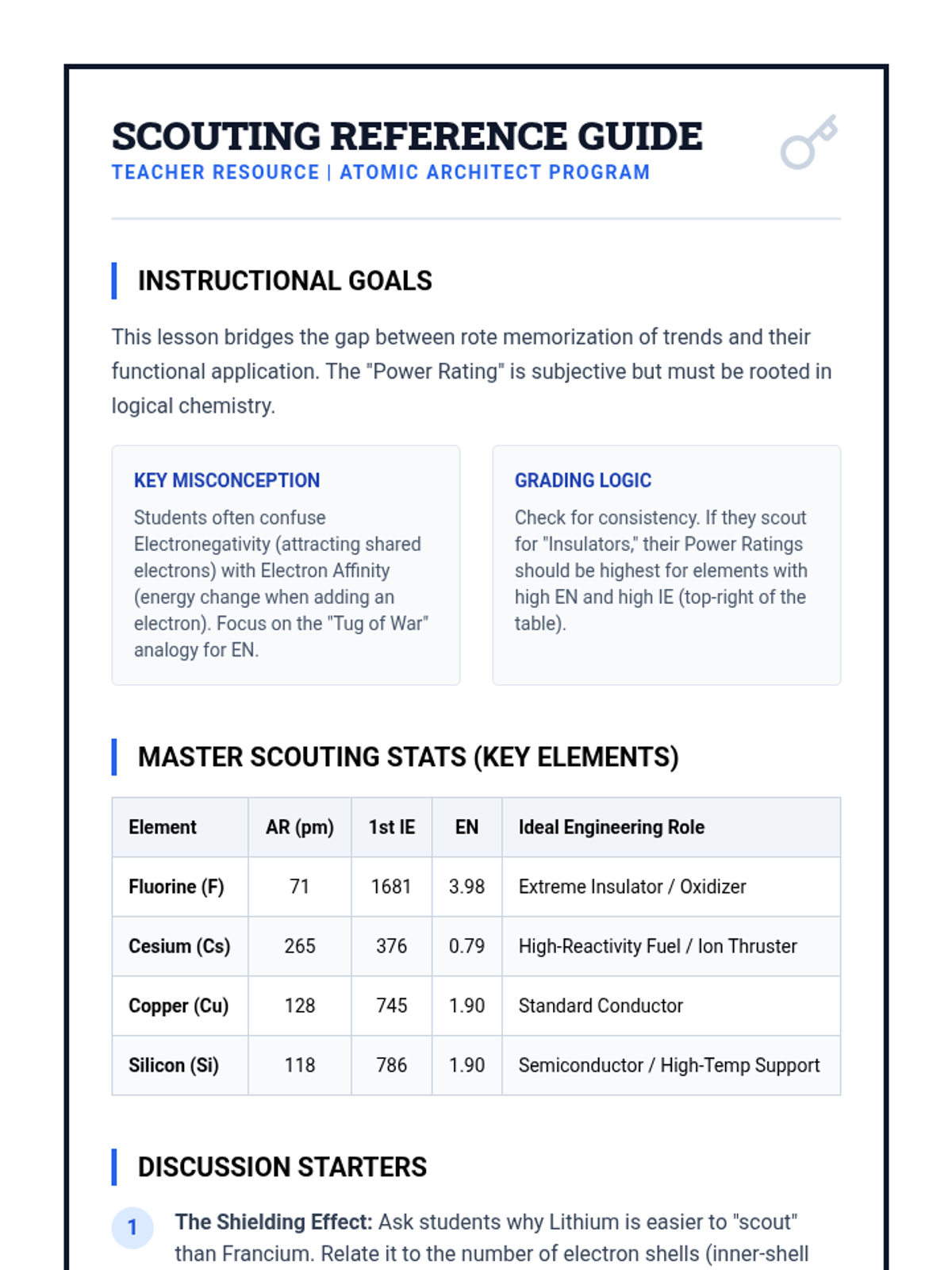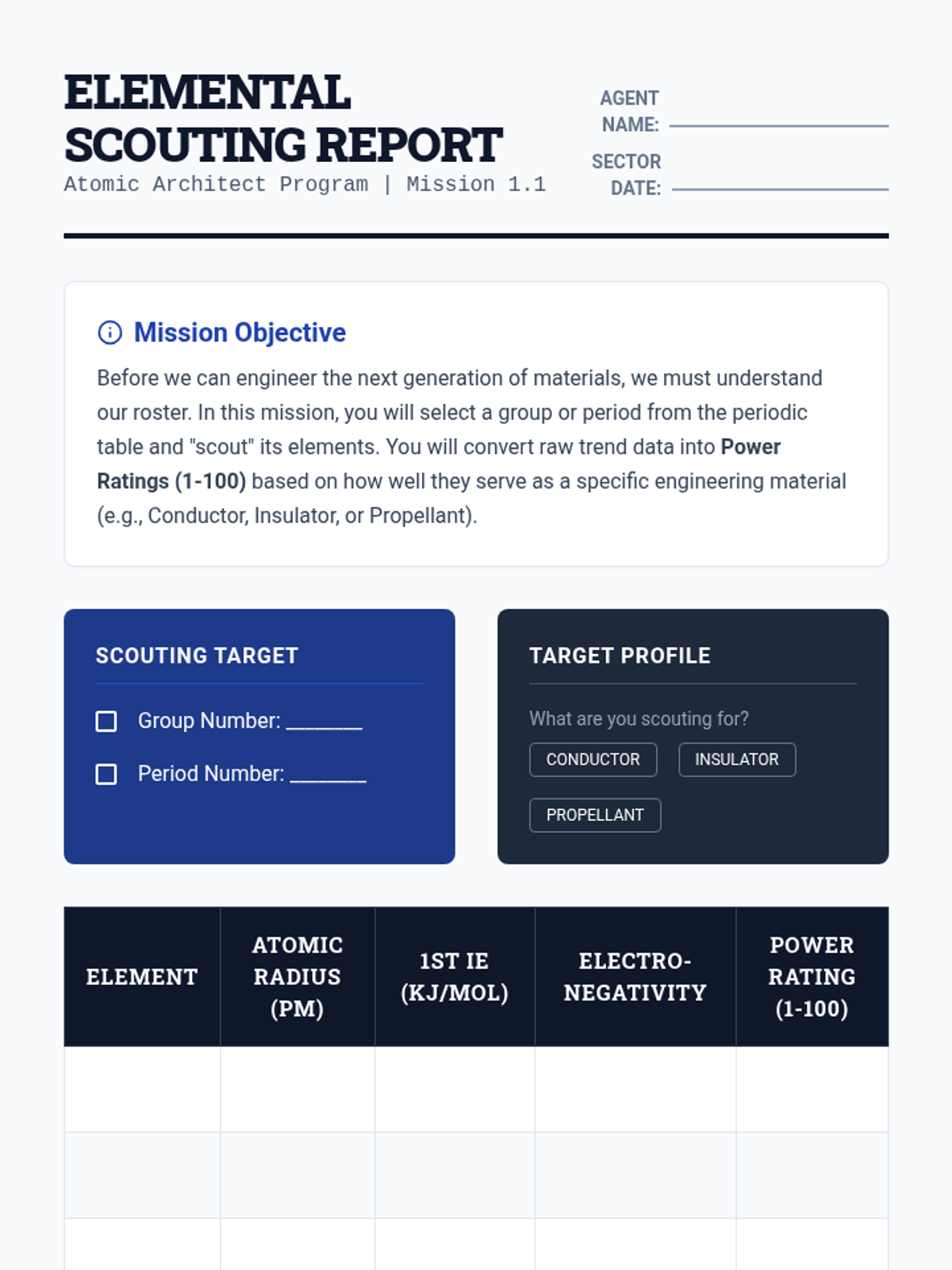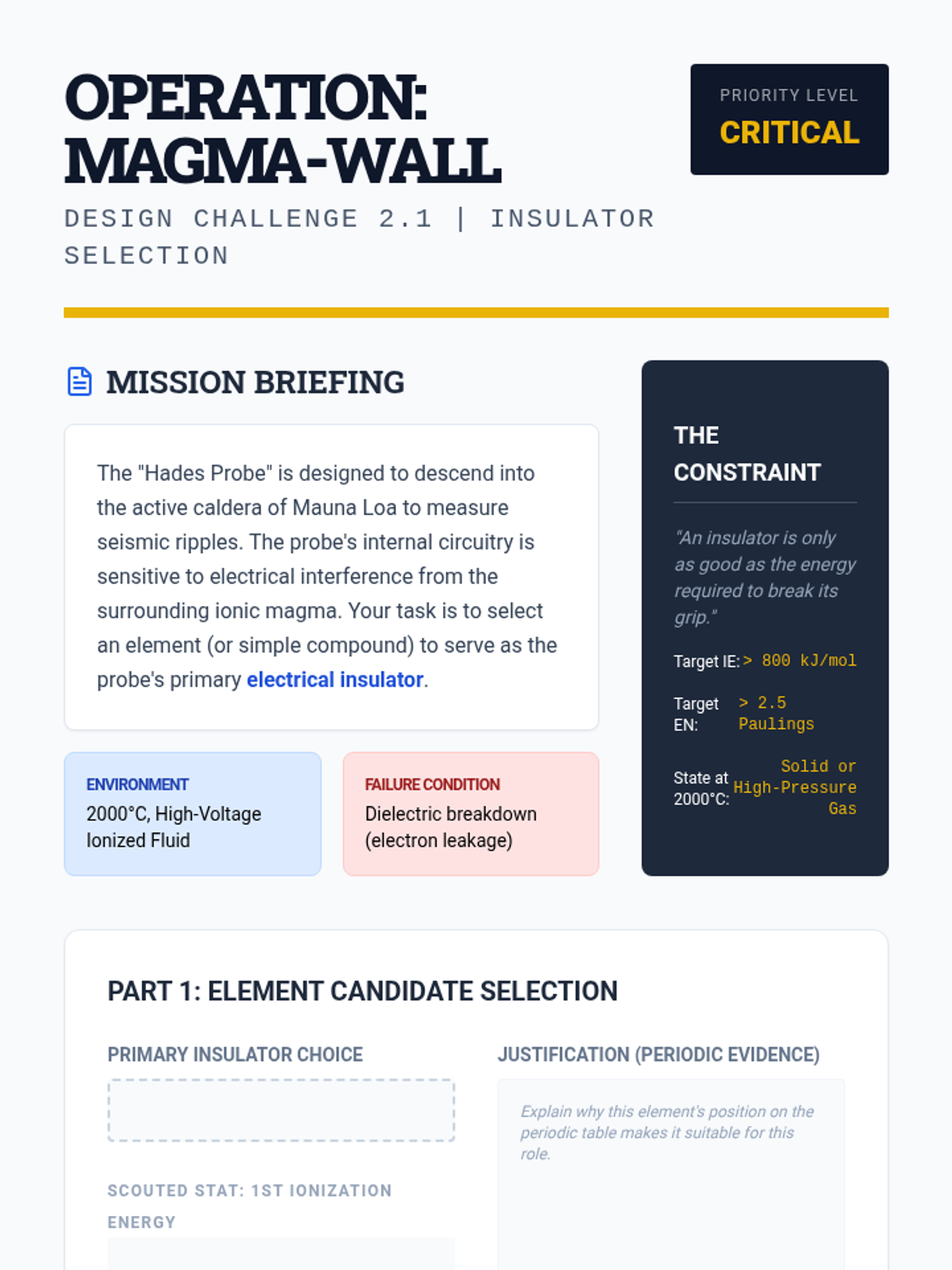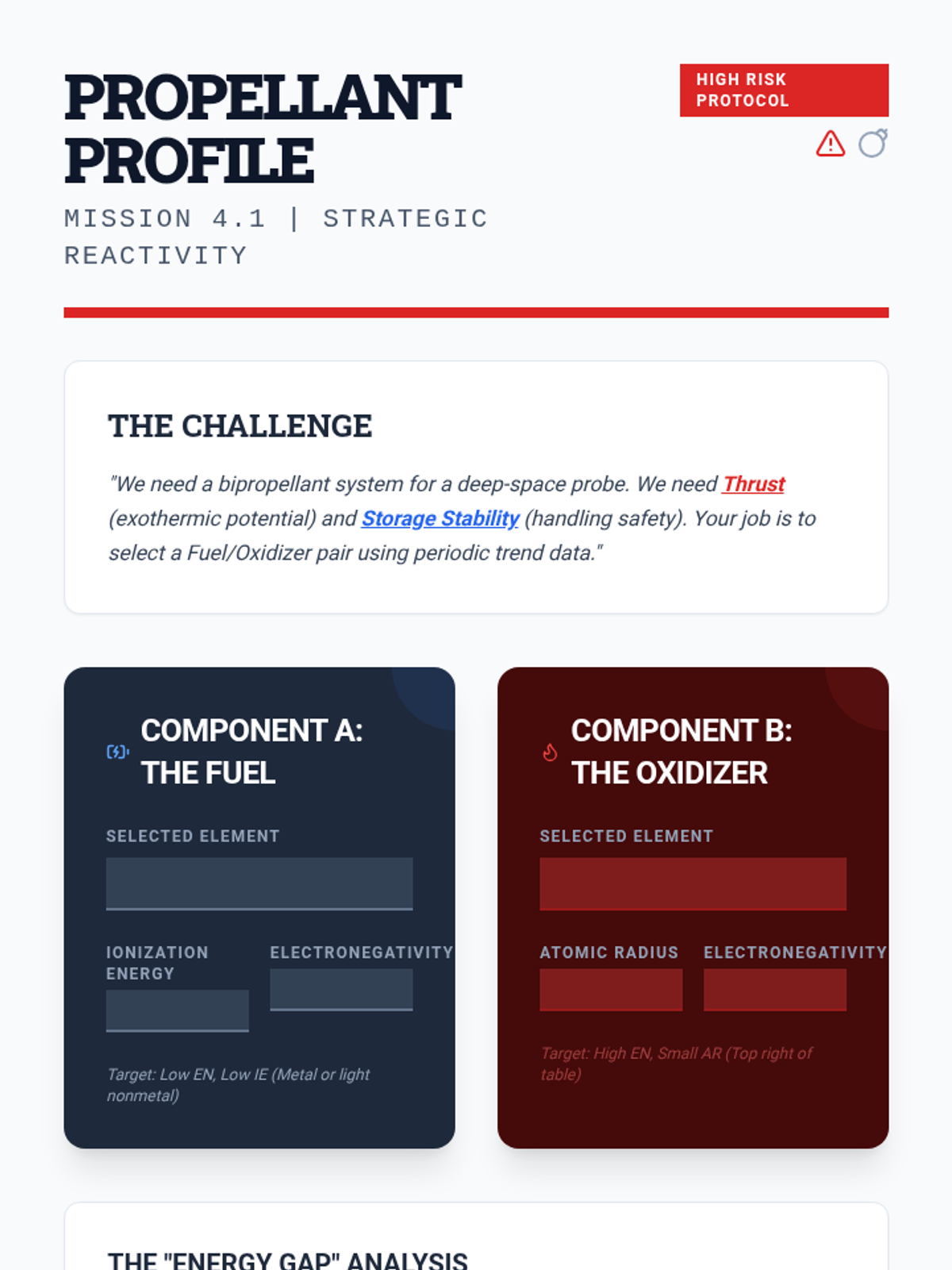 A 12th-grade chemistry sequence where the periodic table is treated as a strategic inventory for engineering. Students master periodic trends (atomic radius, ionization energy, electronegativity) to solve design challenges ranging from insulation to rocket propellants.