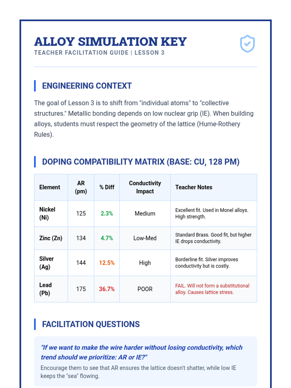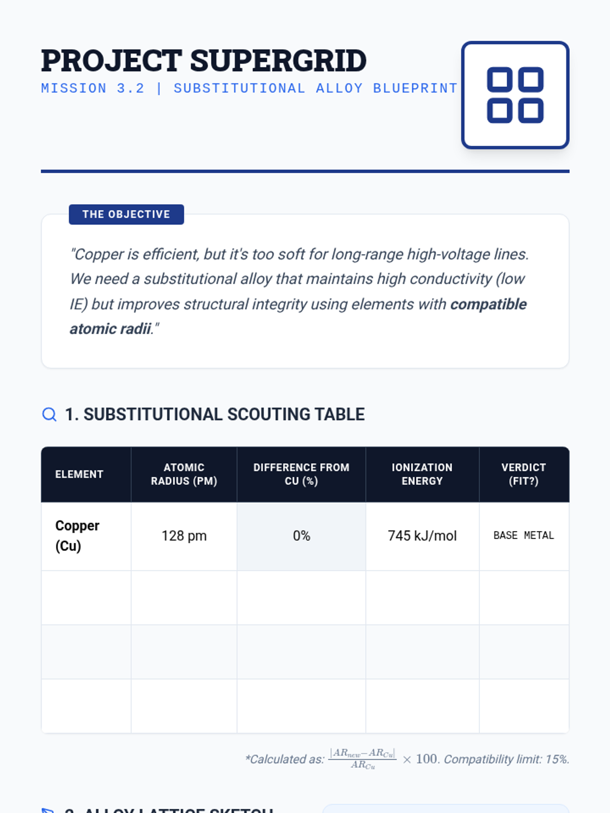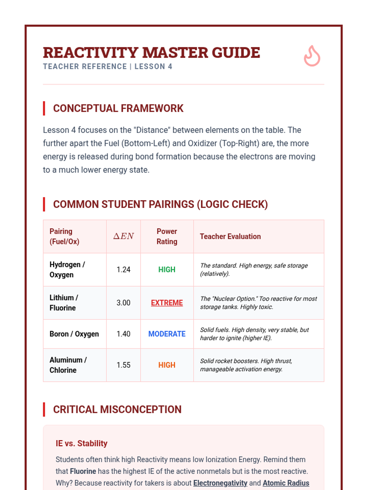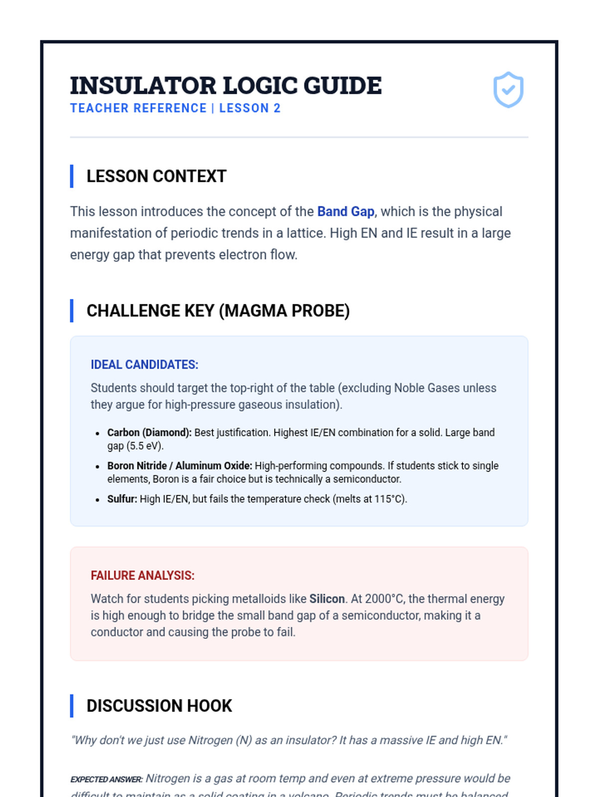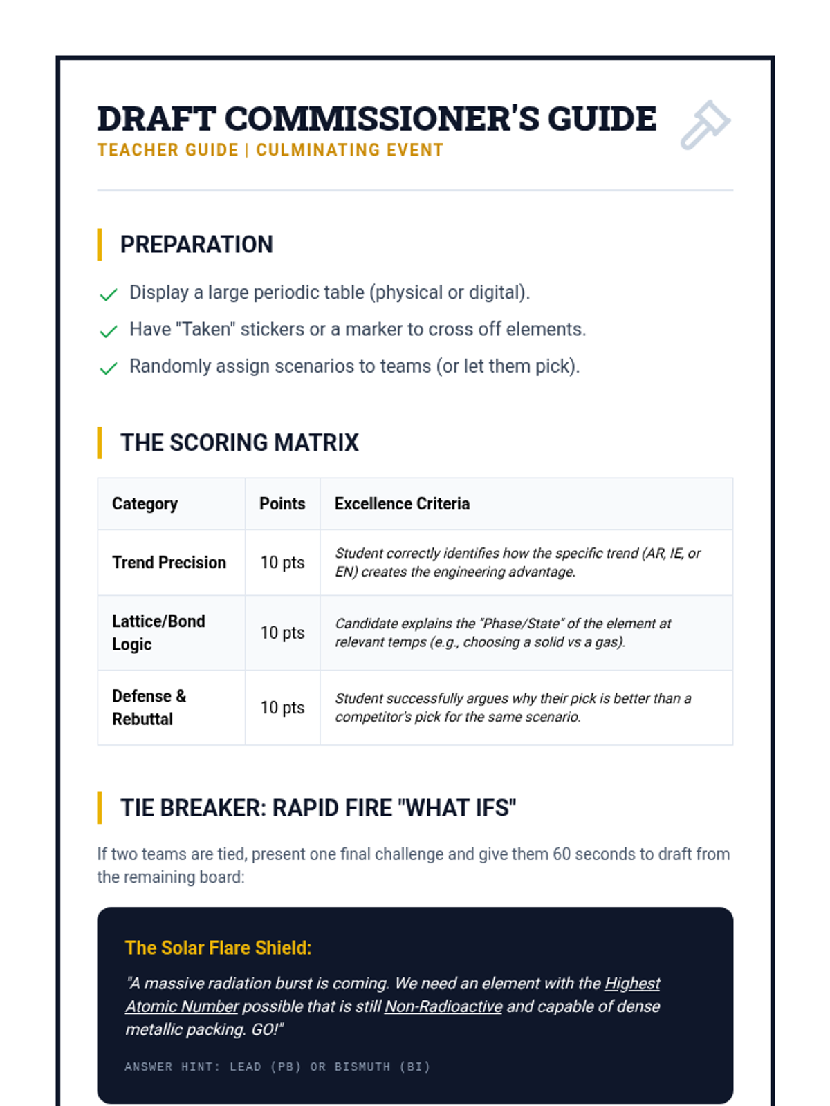A 12th-grade chemistry sequence where the periodic table is treated as a strategic inventory for engineering. Students master periodic trends (atomic radius, ionization energy, electronegativity) to solve design challenges ranging from insulation to rocket propellants.