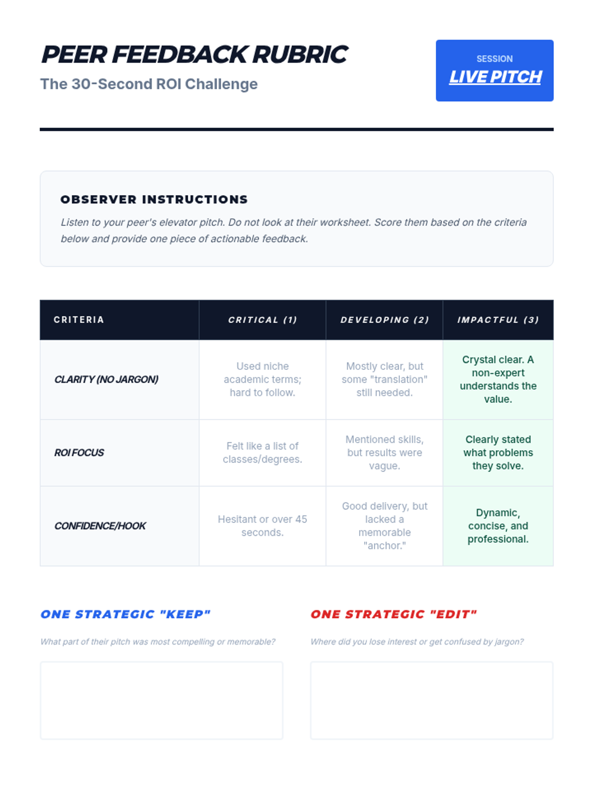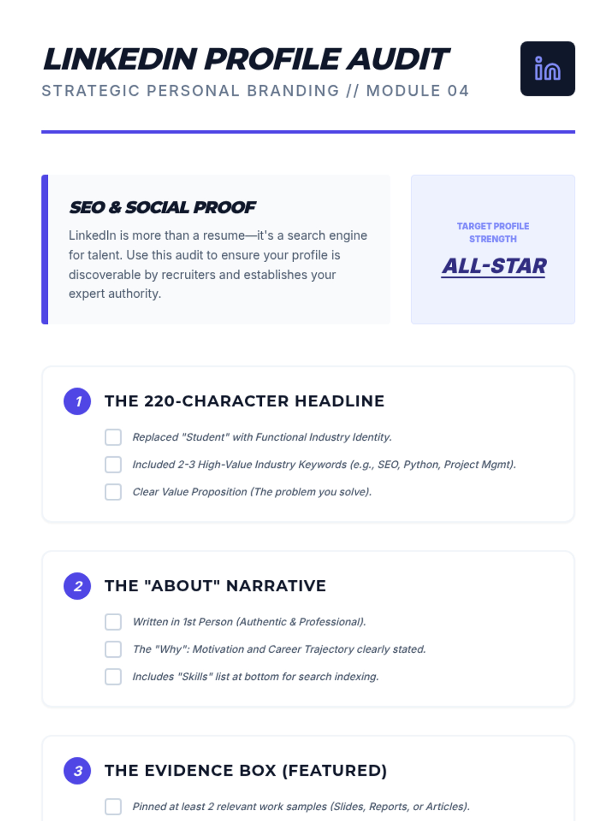 A career-readiness sequence designed for older students and undergraduates to identify their current skills, potential growth areas, and personality types using the Ikigai and Quadrant of Success models. Students move from auditing their time to creating a strategic roadmap for professional development.