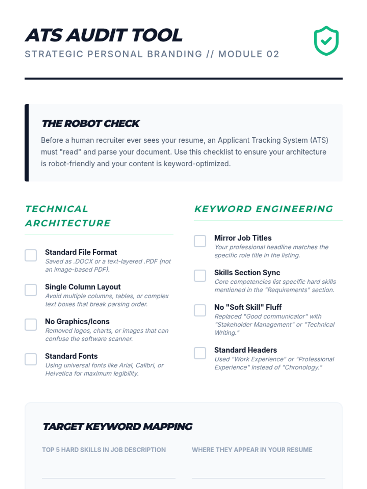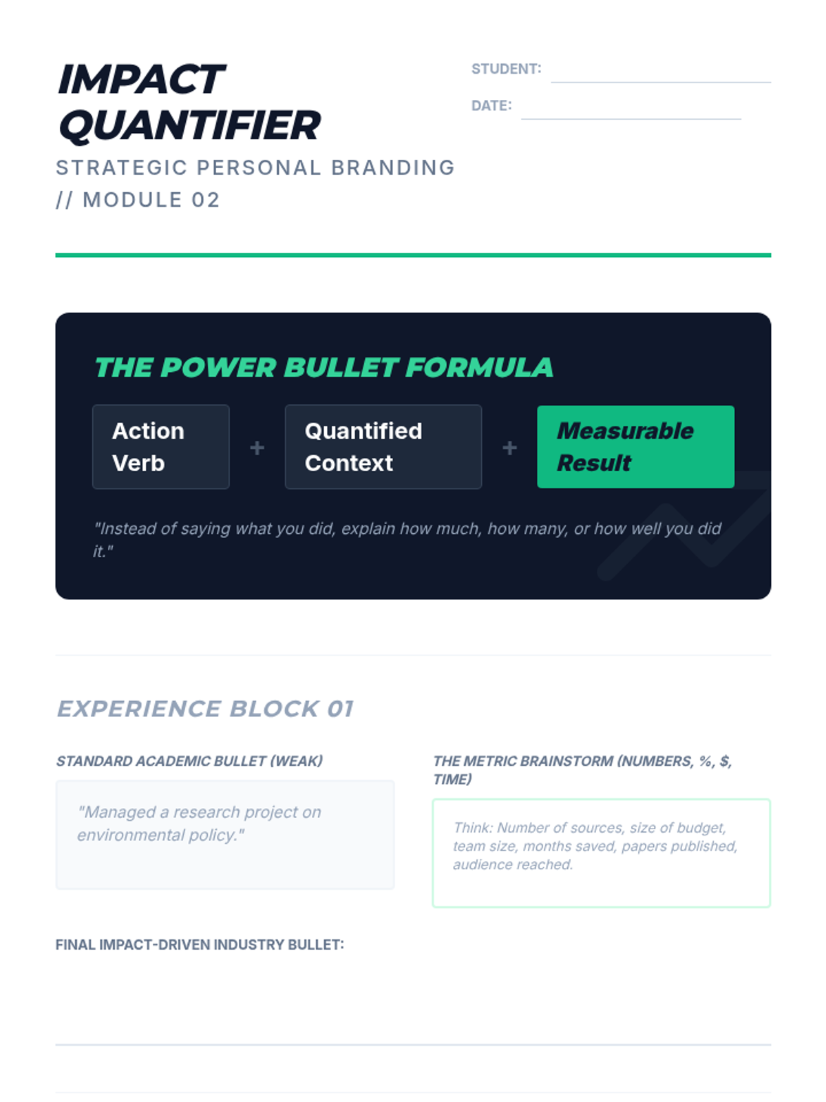 A comprehensive career development sequence for graduate students to translate academic expertise into industry-relevant value. Students master skill mapping, resume architecture, personal branding, and high-level interview strategies.
