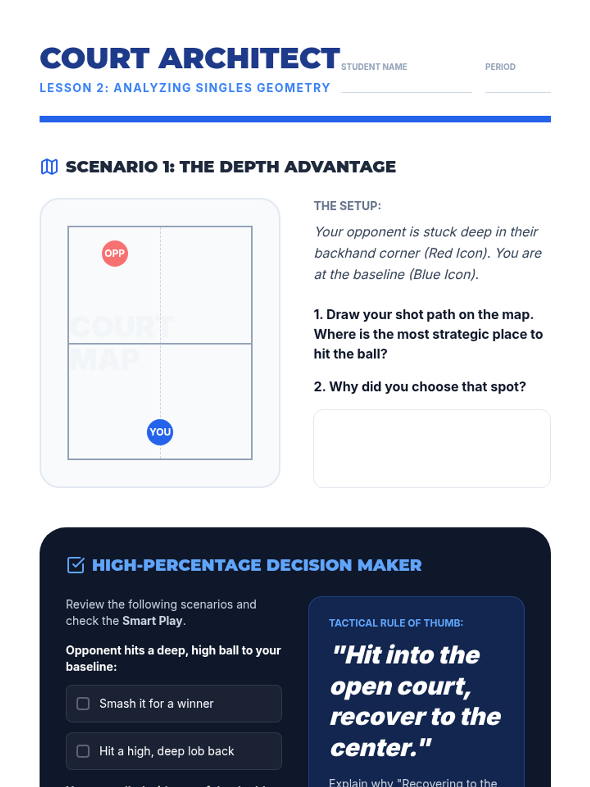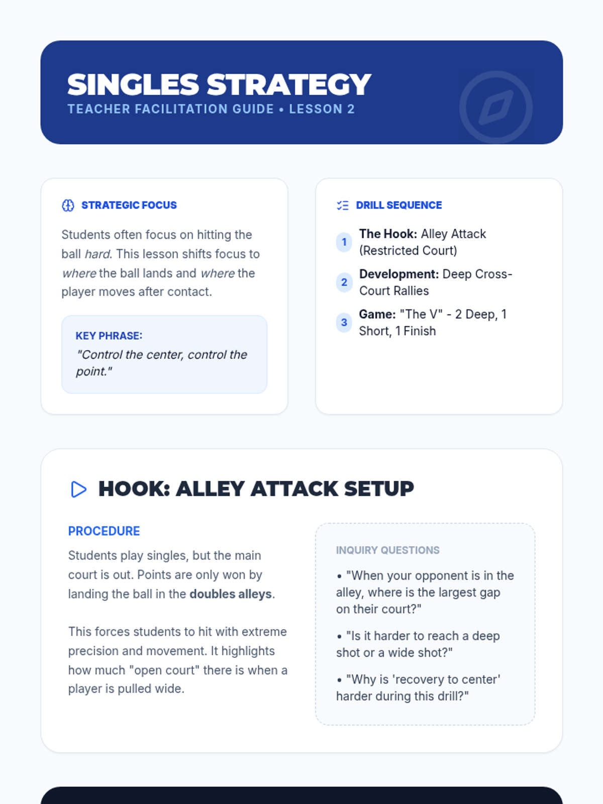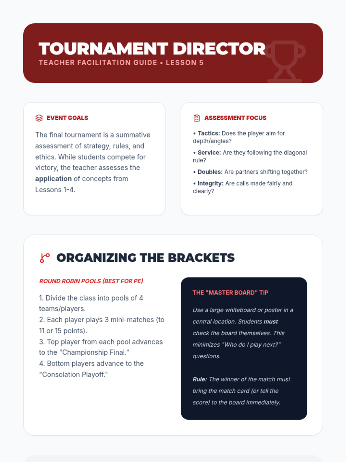 This sequence transitions 9th-grade students from basic mechanics to tactical application and competitive play in racket sports. It covers serving regulations, scoring systems, singles and doubles positioning, and self-officiating, culminating in a structured tournament simulation.