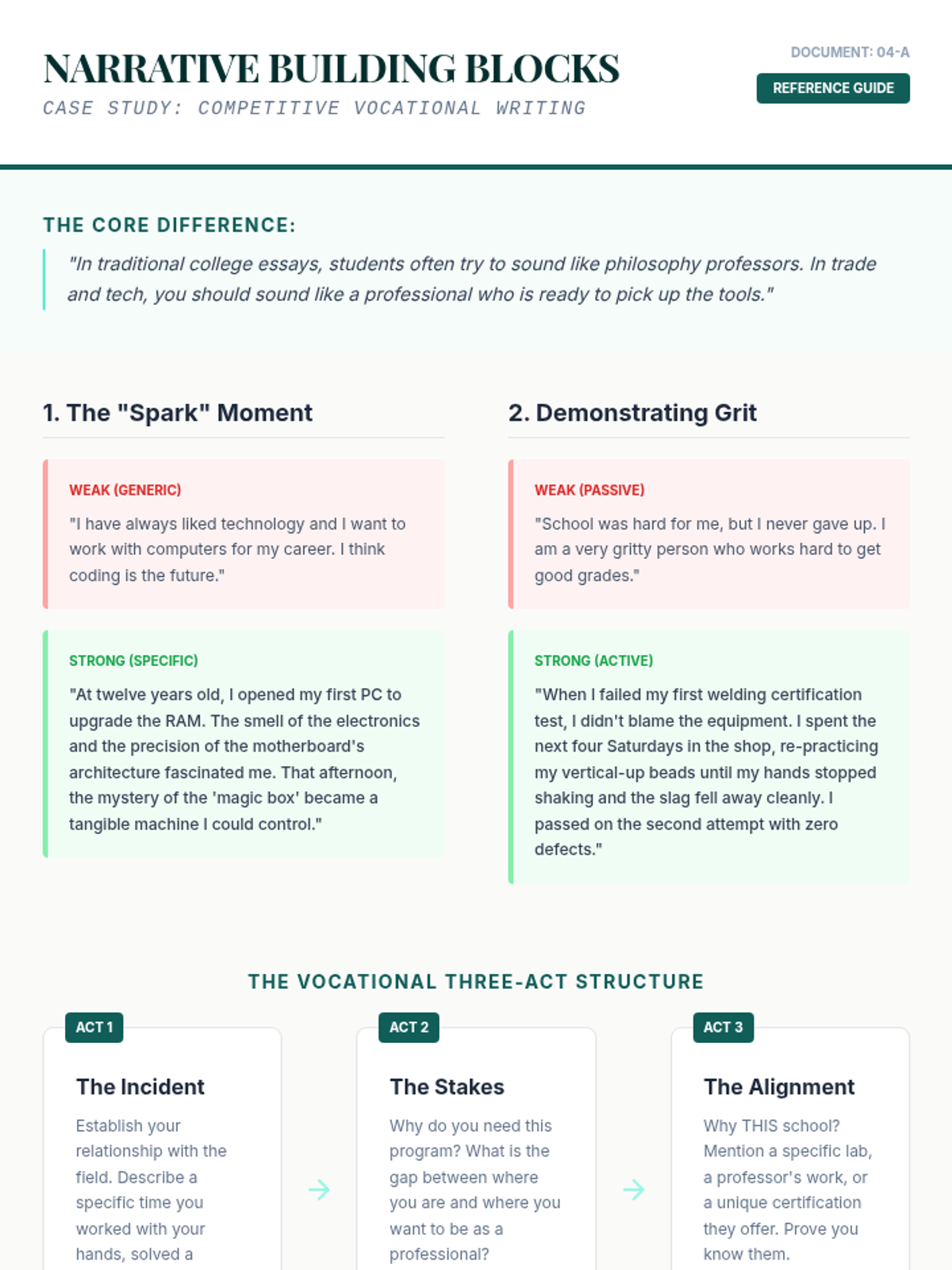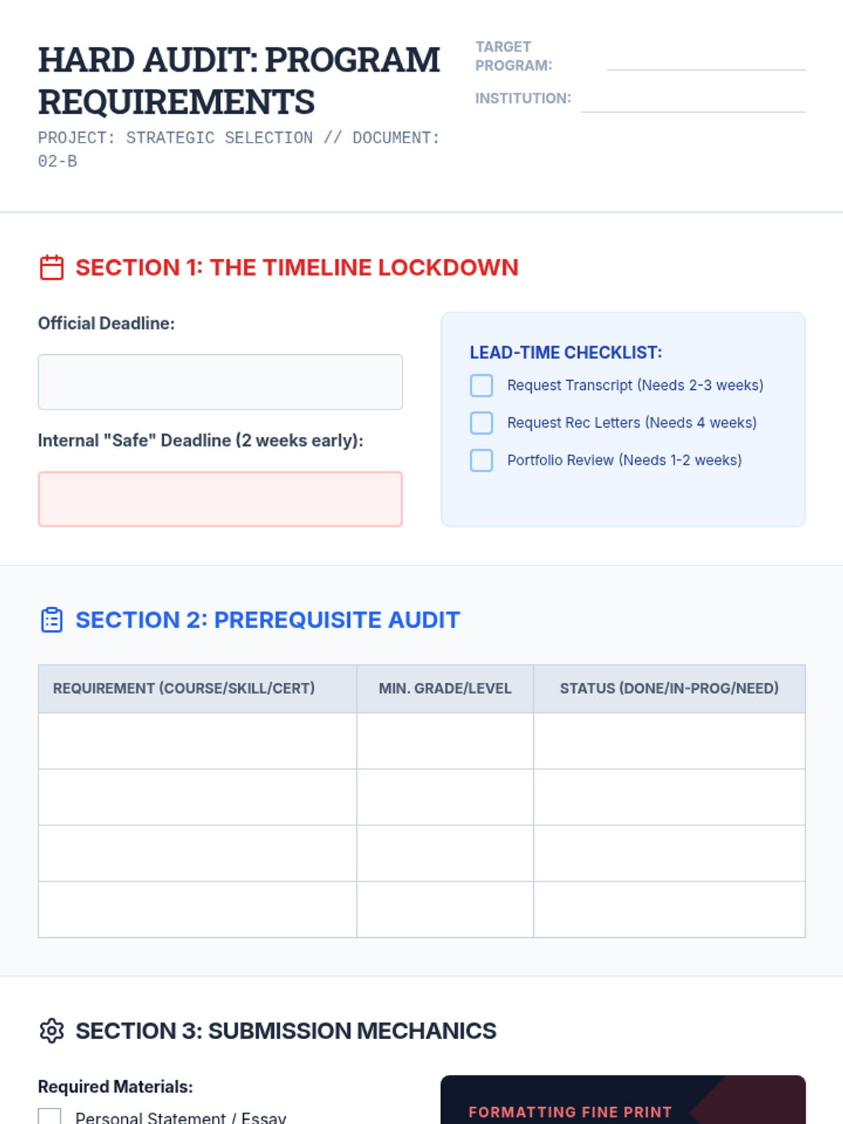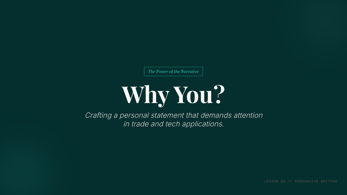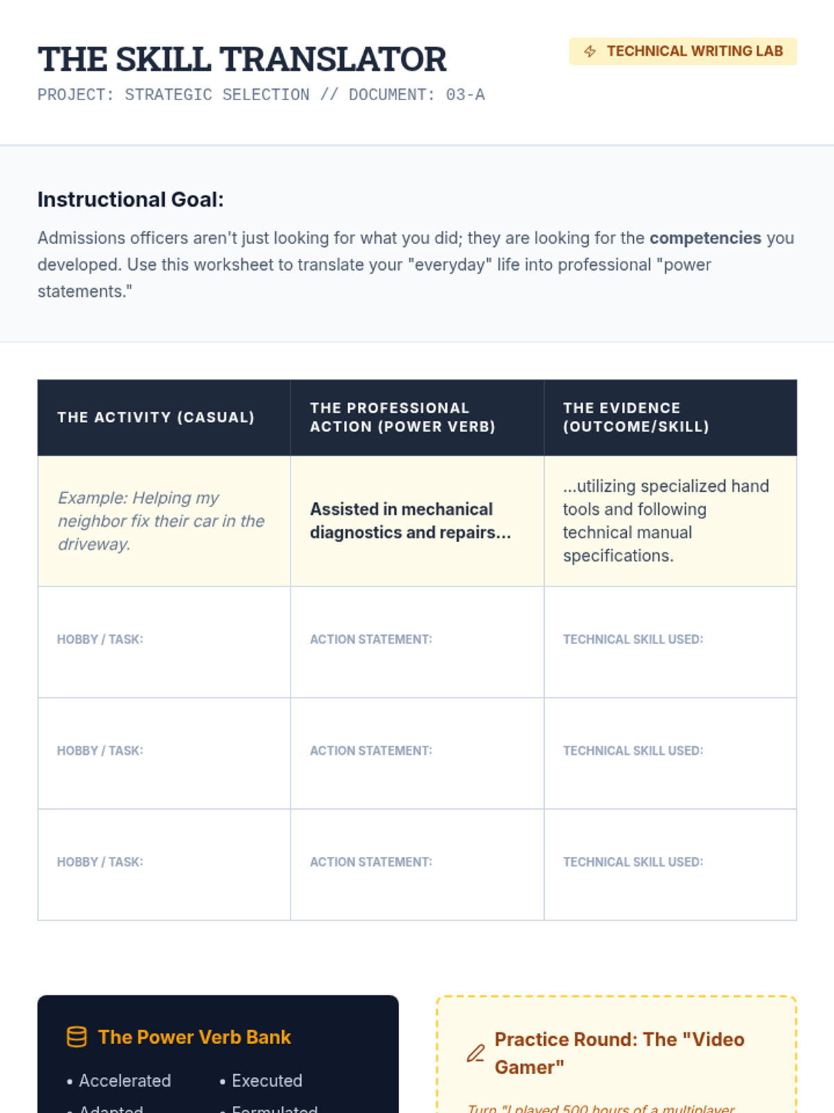 This 11th-grade workshop-style sequence guides students through the tactical process of selecting and applying to competitive continuing education and adult learning programs. Students develop personalized rubrics, audit requirements, craft educational resumes, write personal statements, and practice interview techniques.