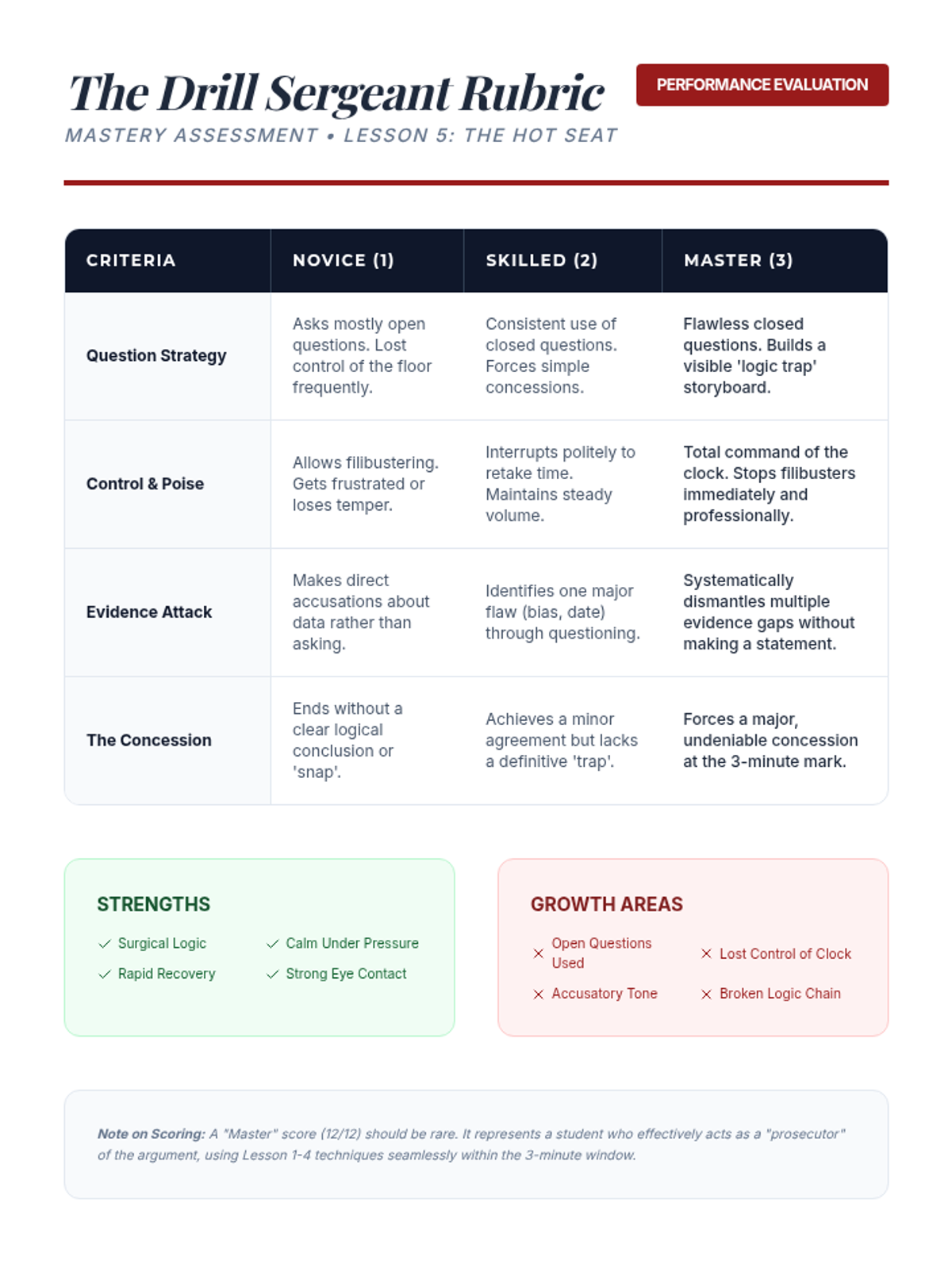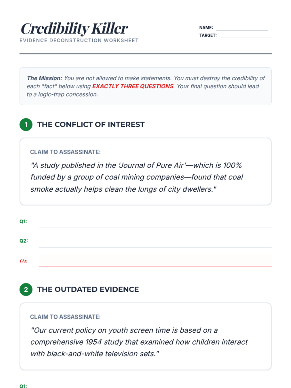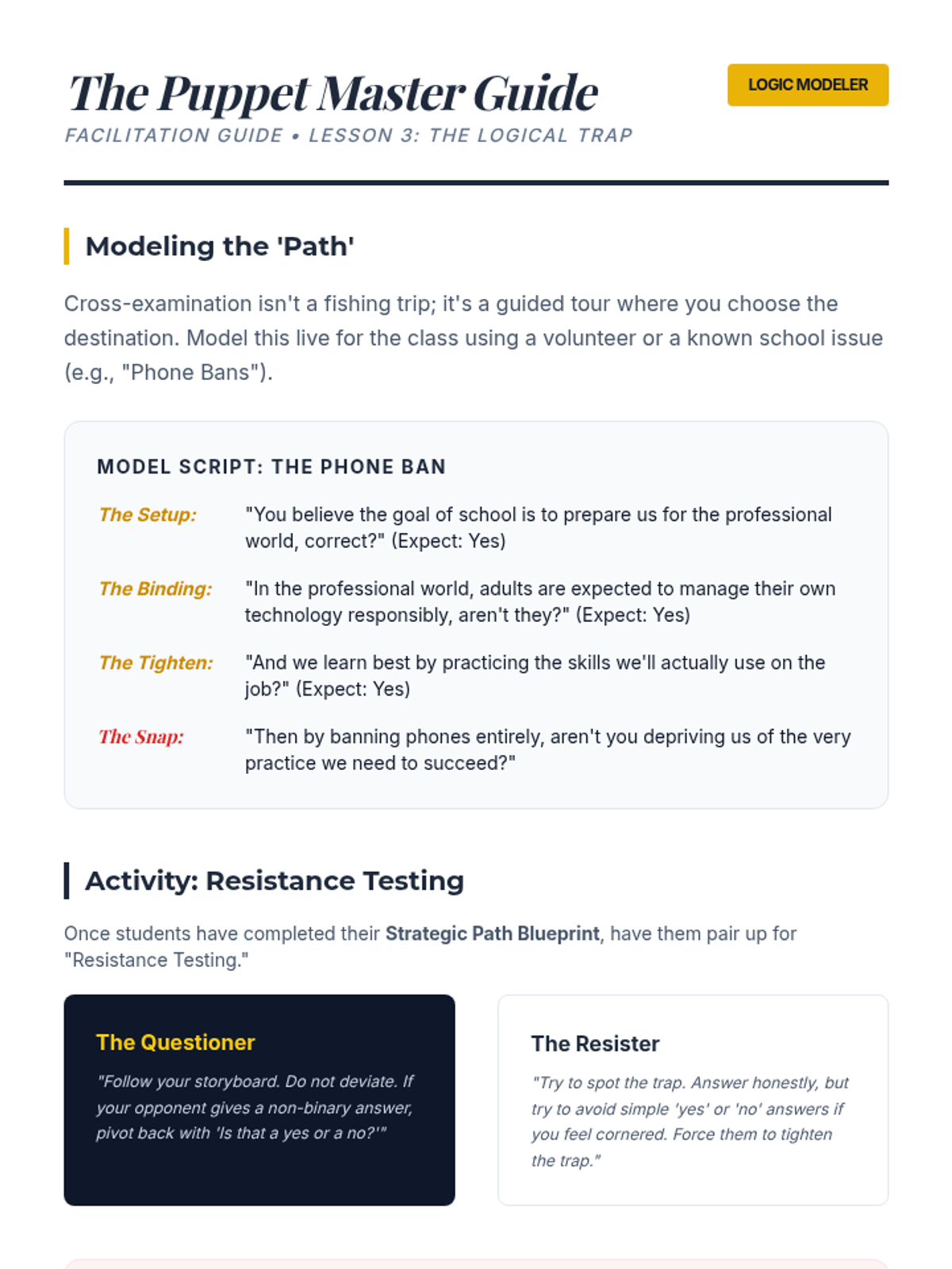 This 9th-grade ELA sequence focuses on the mechanics of strategic questioning in debate. Students progress from basic question types to complex 'lines of questioning' designed to deconstruct arguments and expose evidentiary weaknesses through active listening and logical traps.