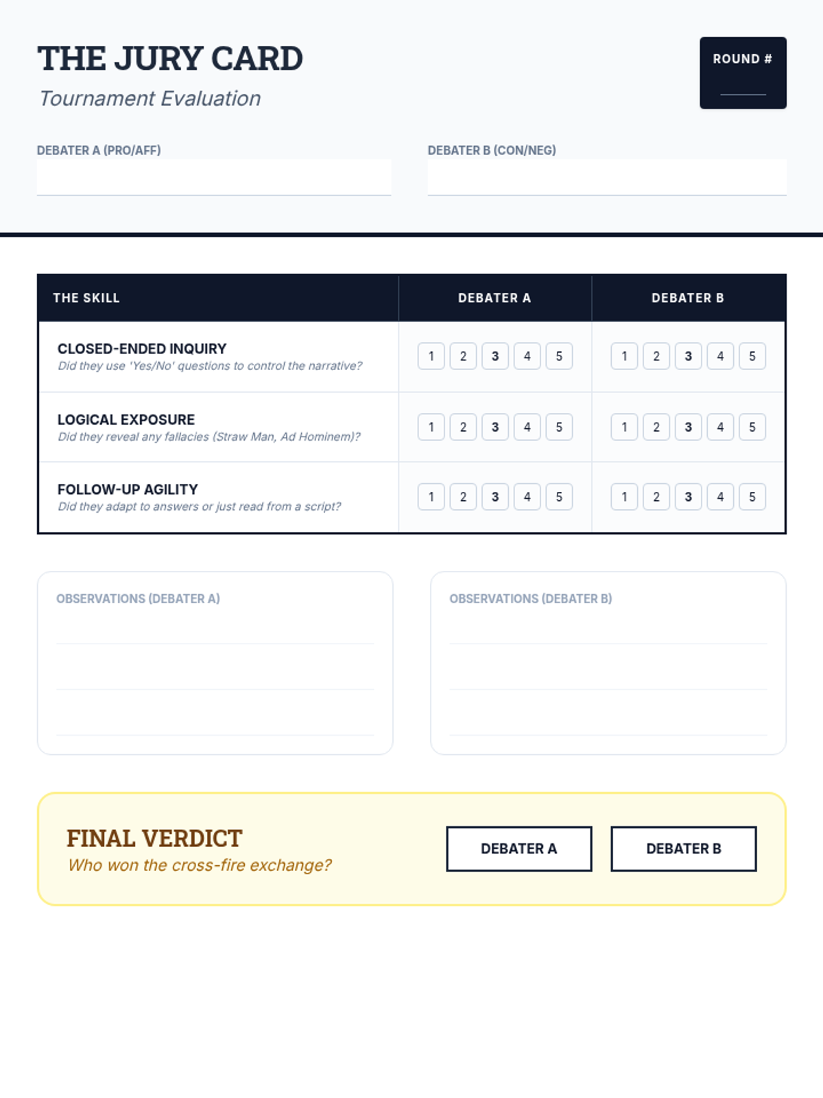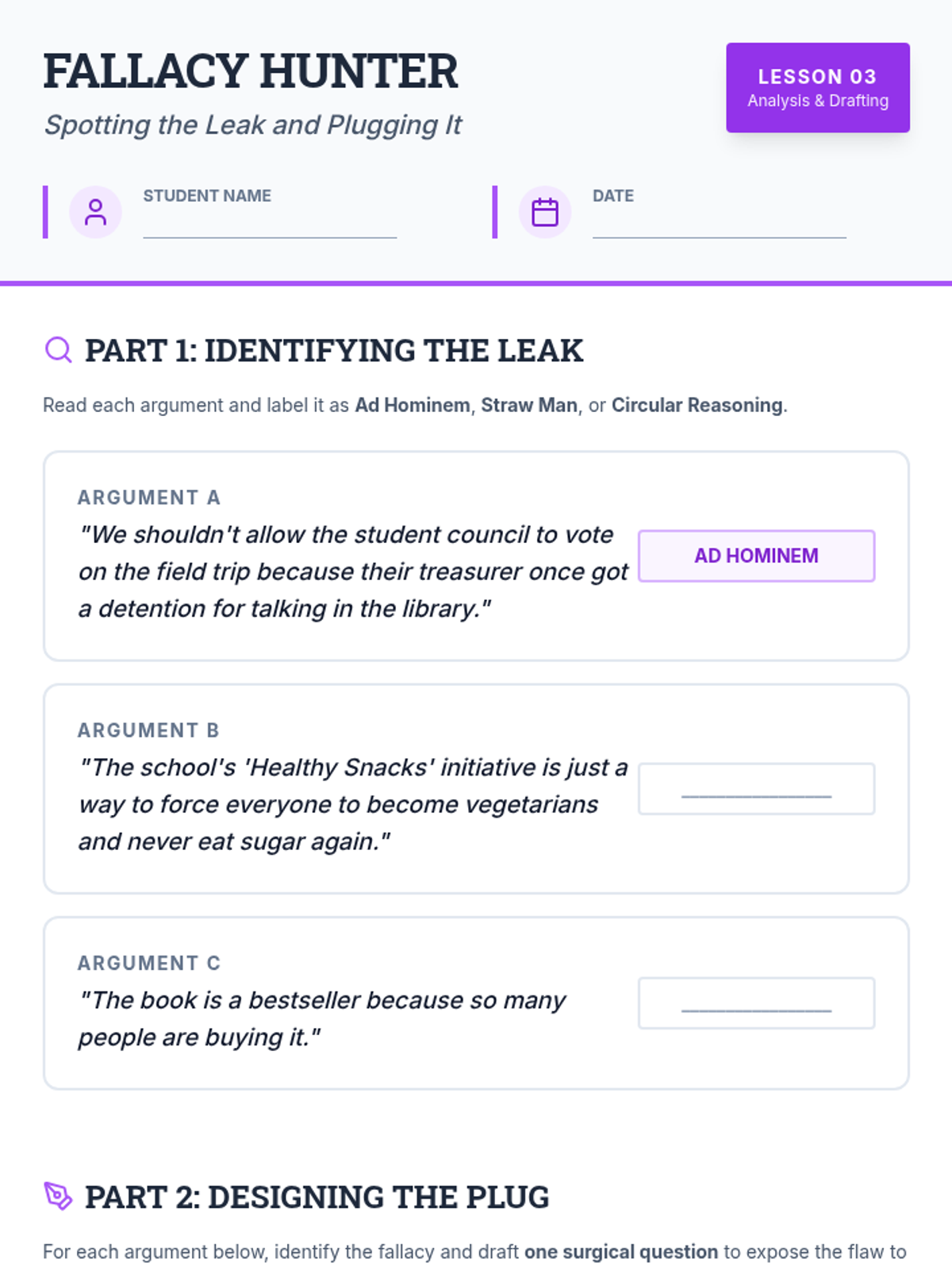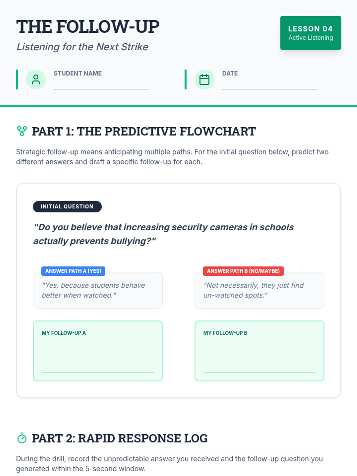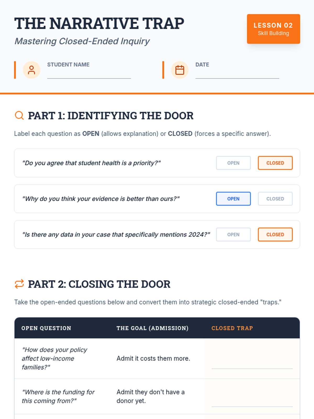 This middle school sequence introduces students to the strategic art of questioning in competitive debate. Students learn to distinguish between clarifying and exposing questions, master closed-ended inquiry, identify logical fallacies, and develop the agility to ask effective follow-up questions during high-pressure cross-fire simulations.