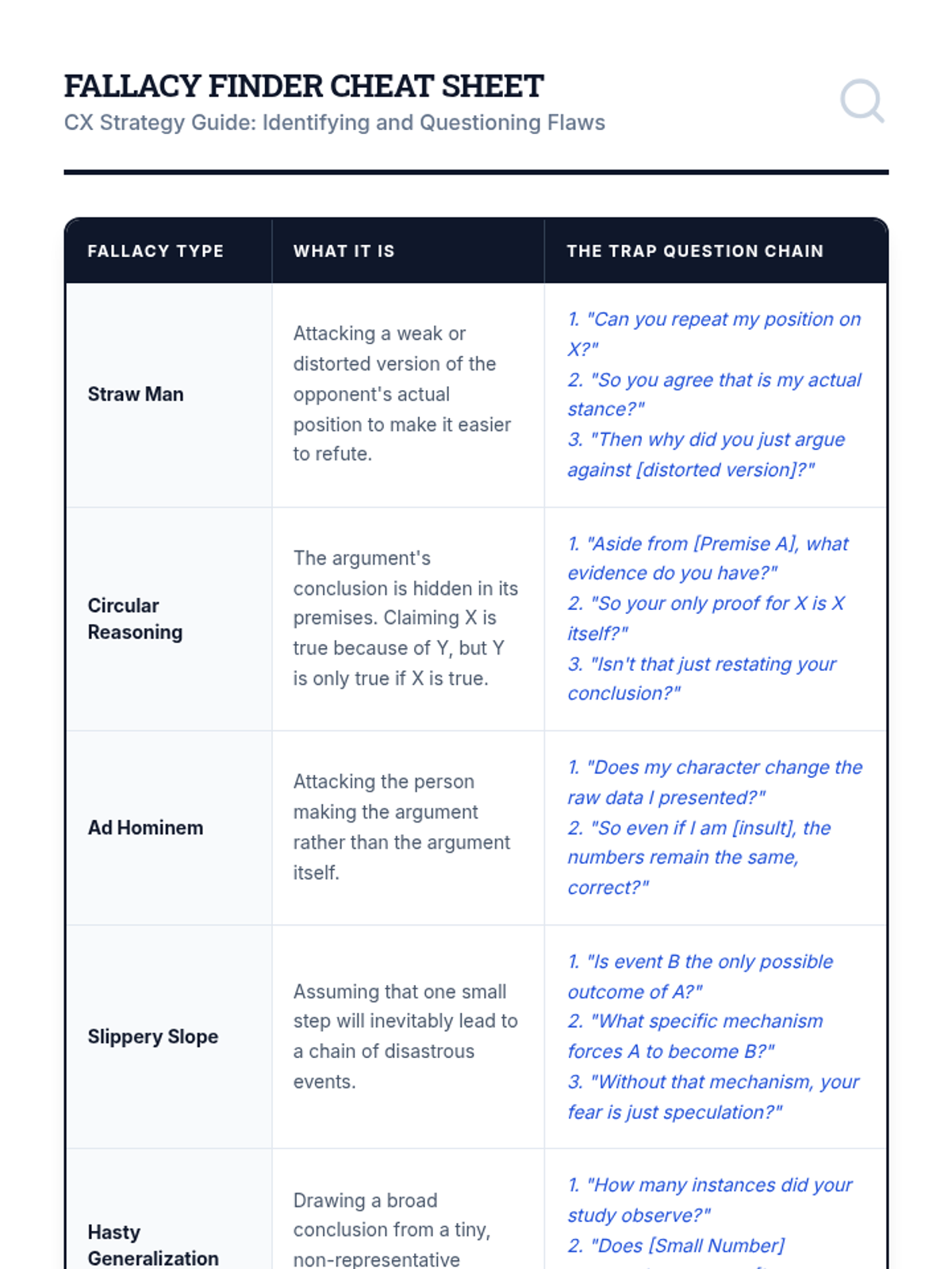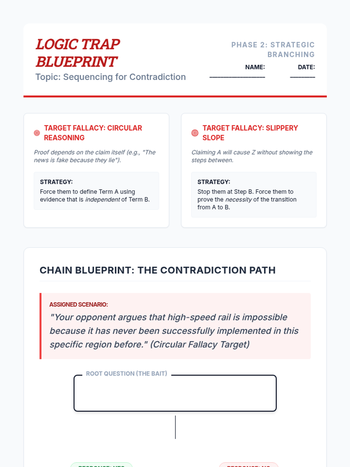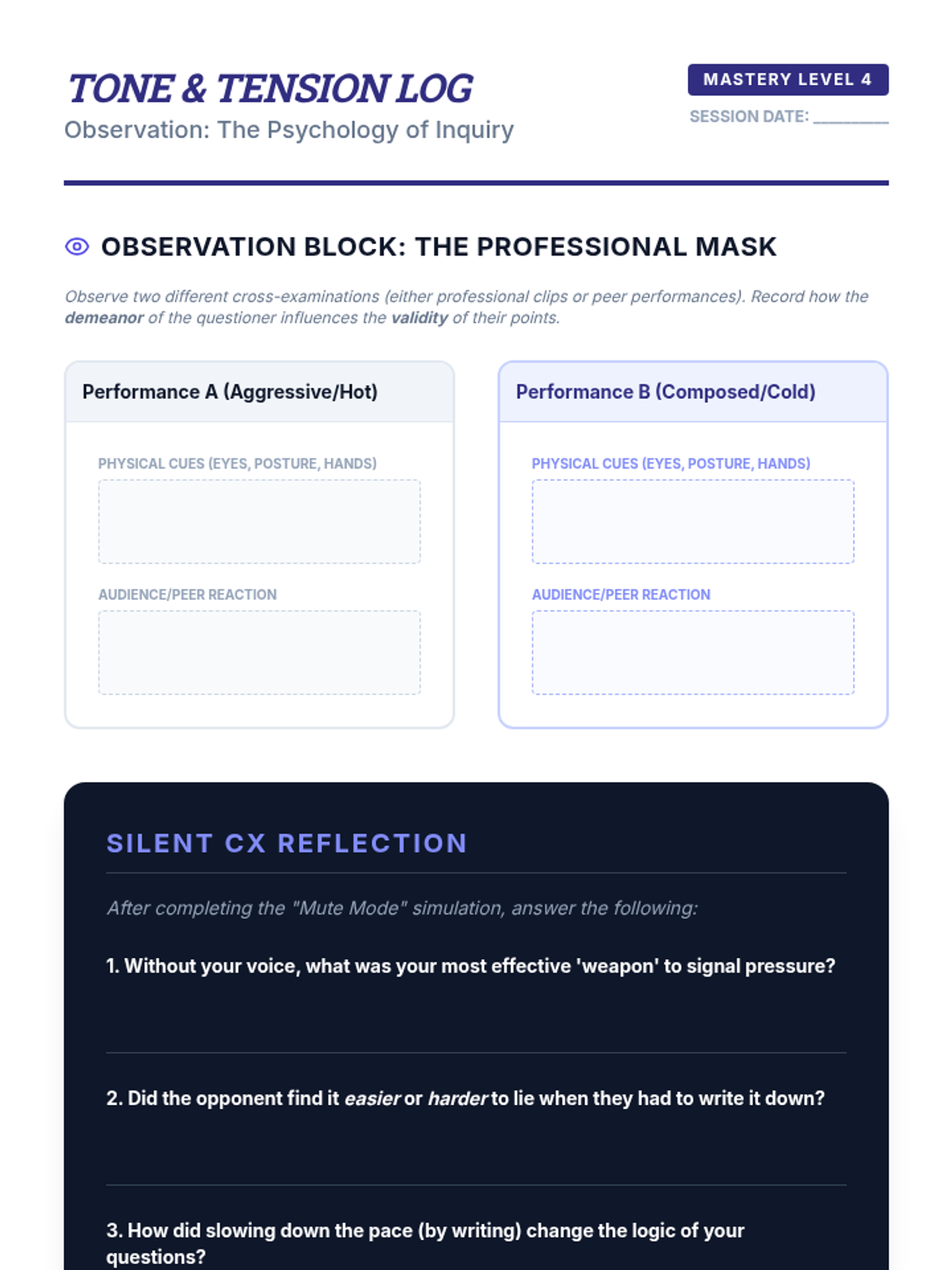 A high-stakes 12th-grade sequence on the art of strategic cross-examination. Students learn to architect questioning chains that trap opponents, expose logical flaws, and impeach evidence through disciplined, controlled inquiry.
