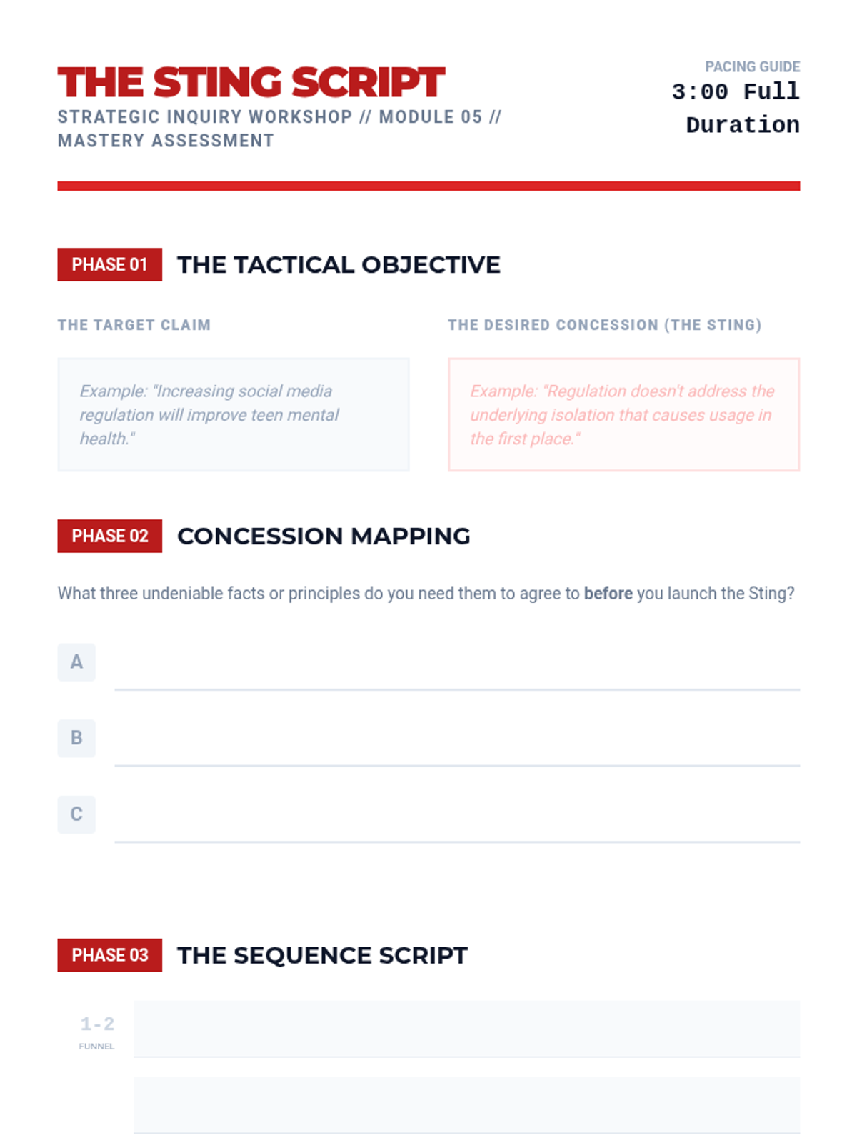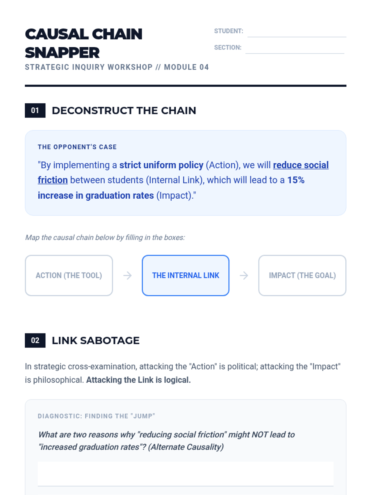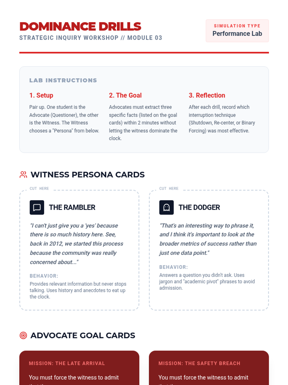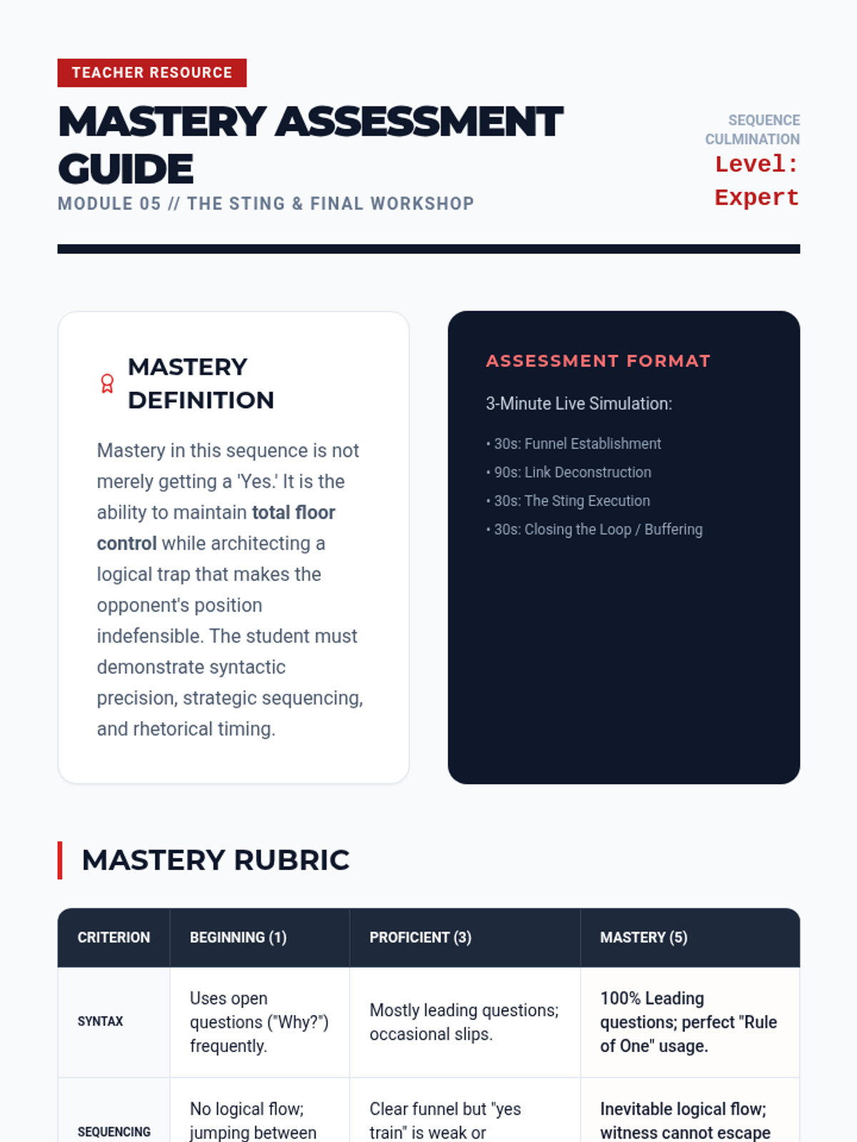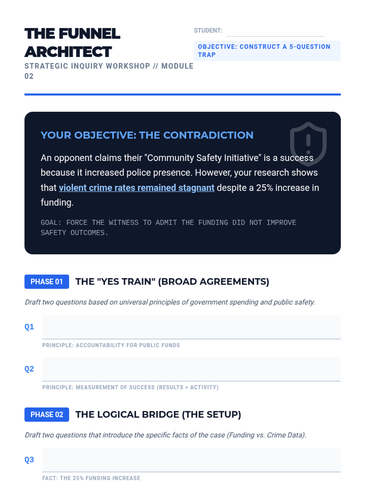 A comprehensive workshop sequence for undergraduate students to master the mechanics of strategic inquiry, moving from individual question syntax to complex lines of questioning designed to force logical concessions.