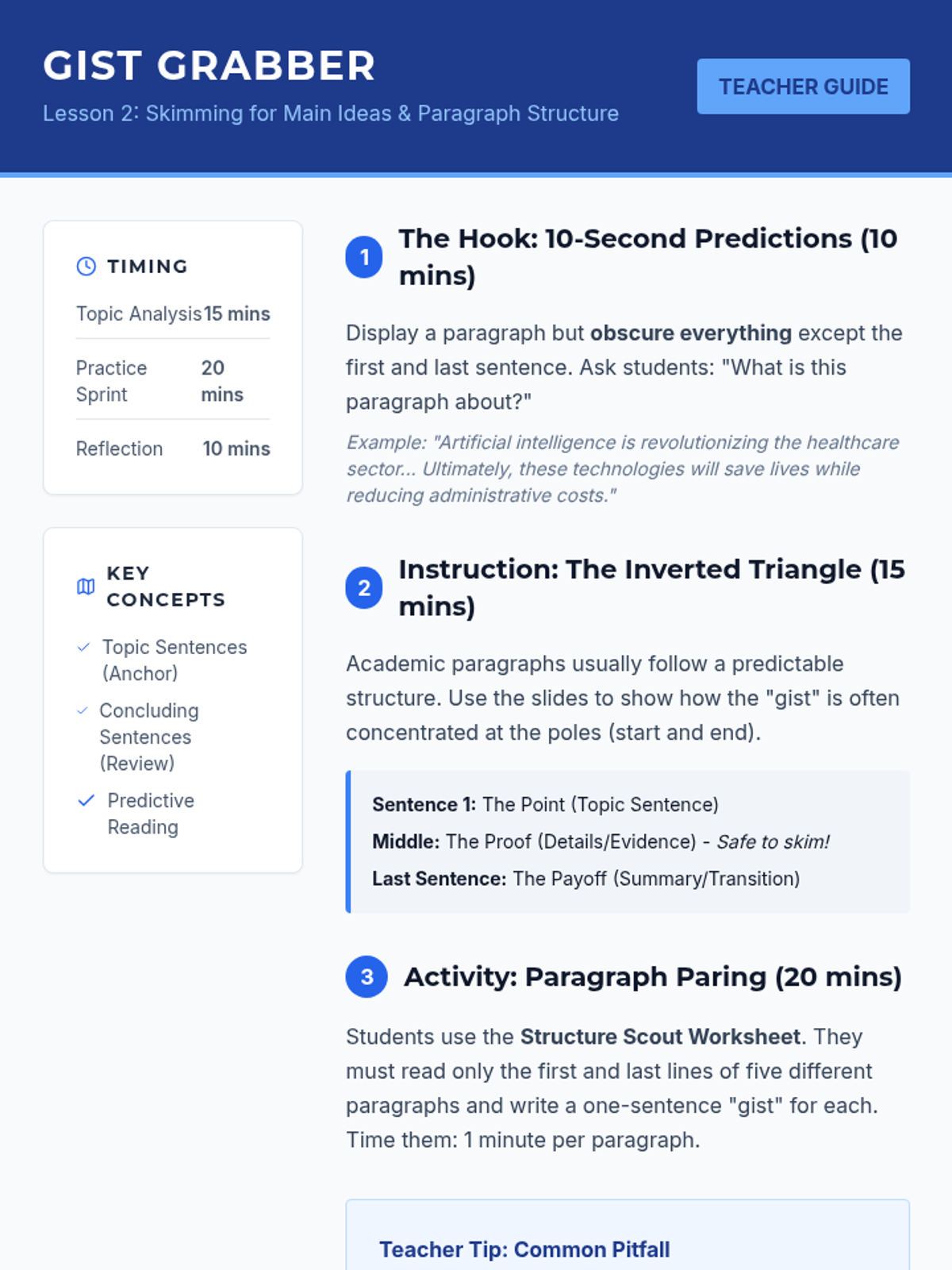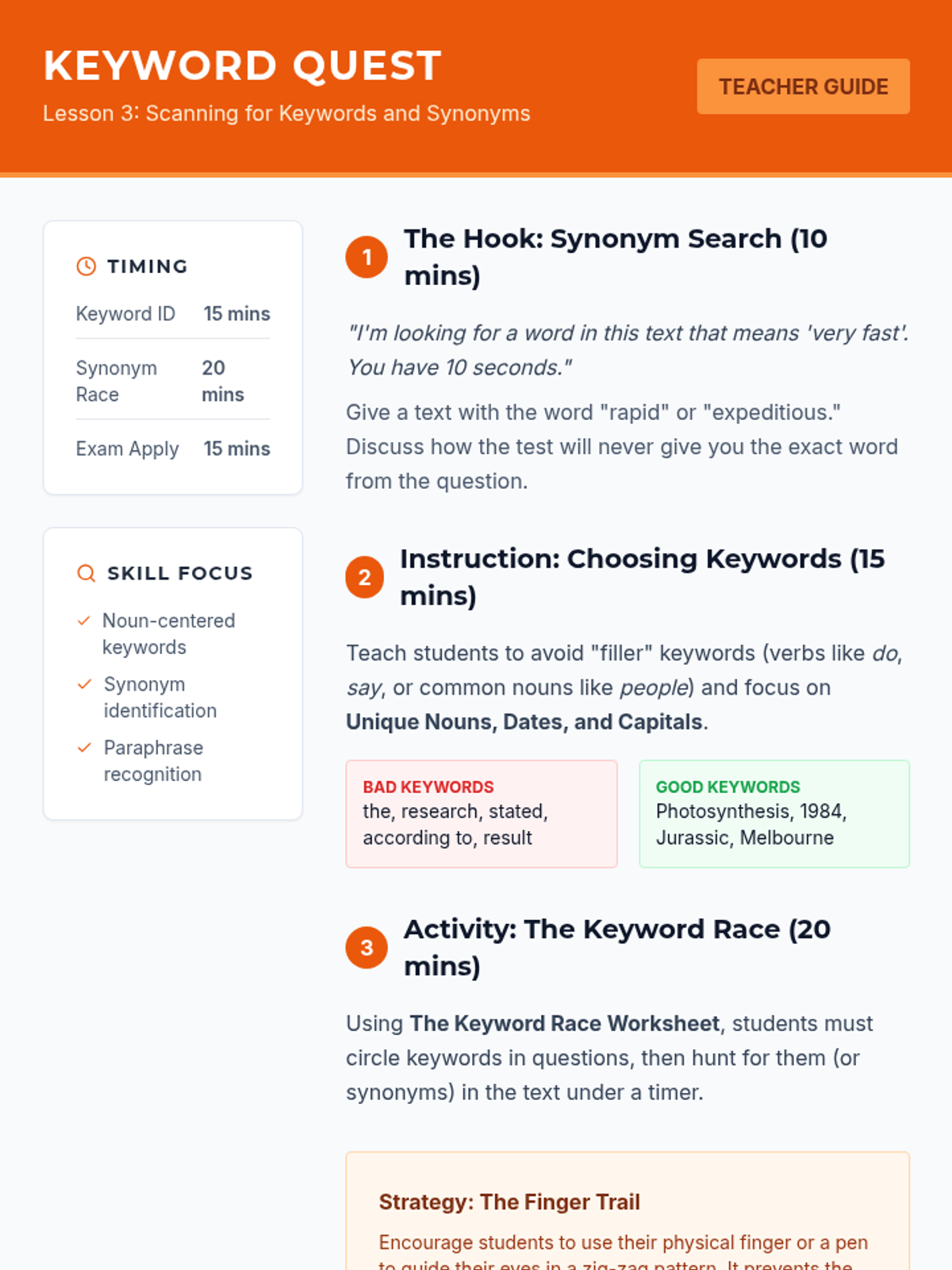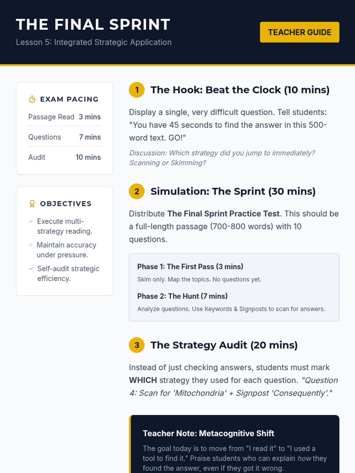 A workshop-style sequence for undergraduate ESL students to master skimming and scanning techniques for high-stakes academic exams. Students move from conceptual understanding to timed application, focusing on efficiency and accuracy in dense academic texts.