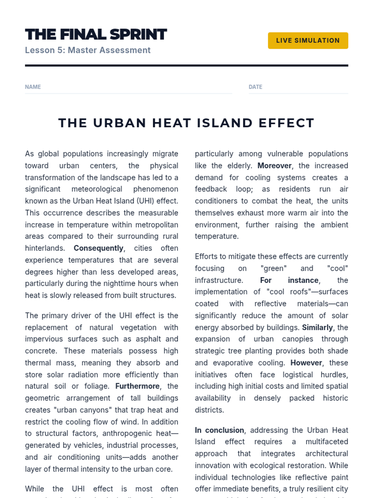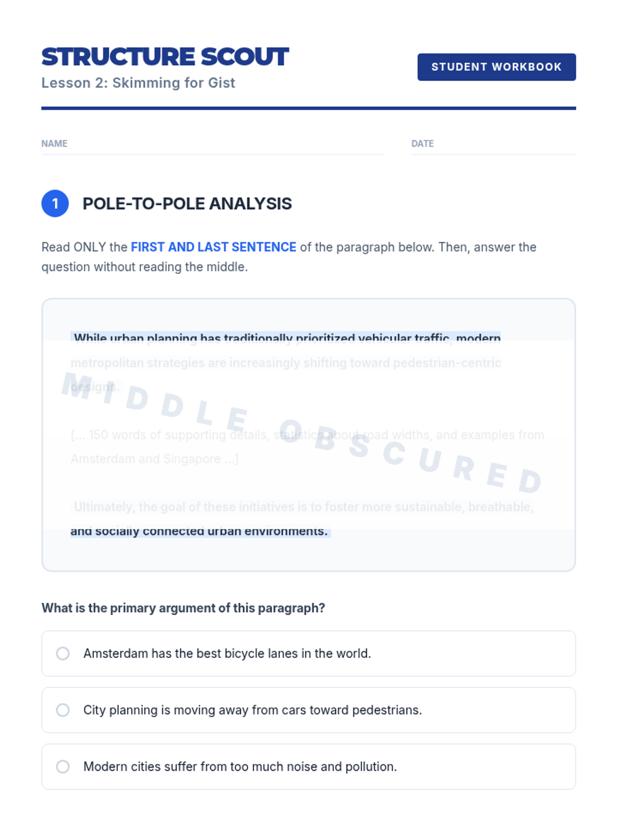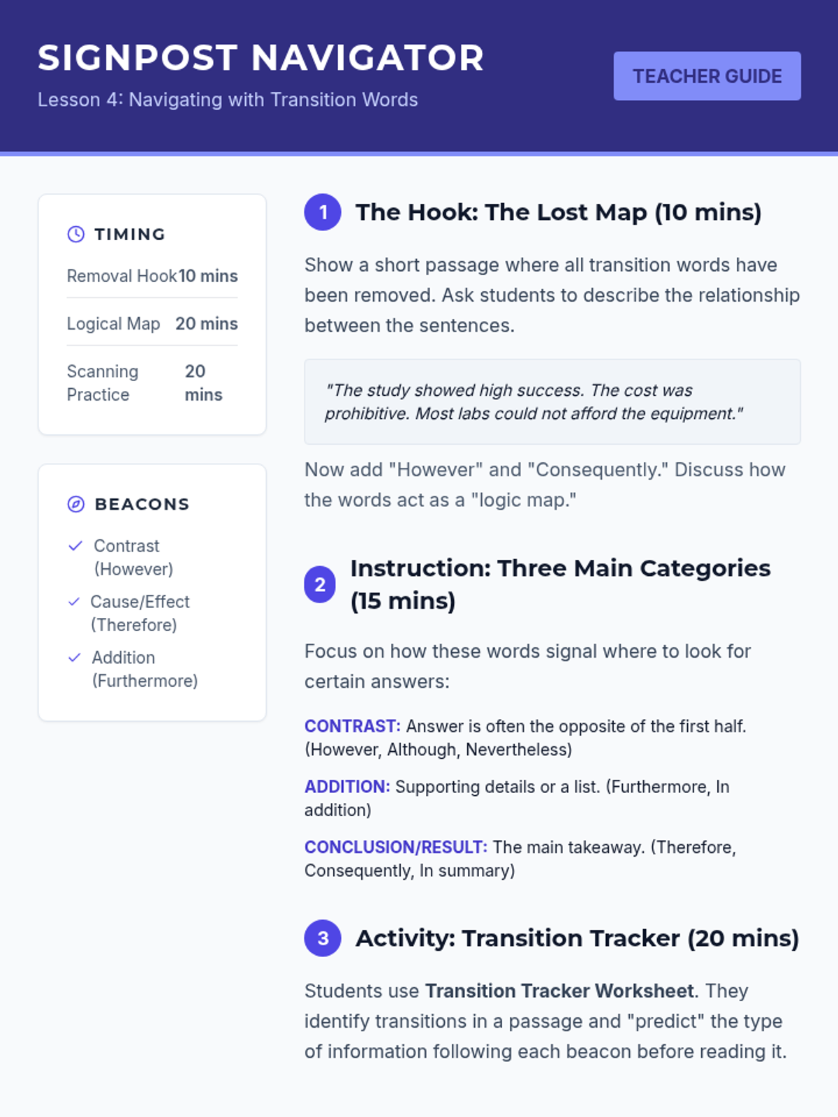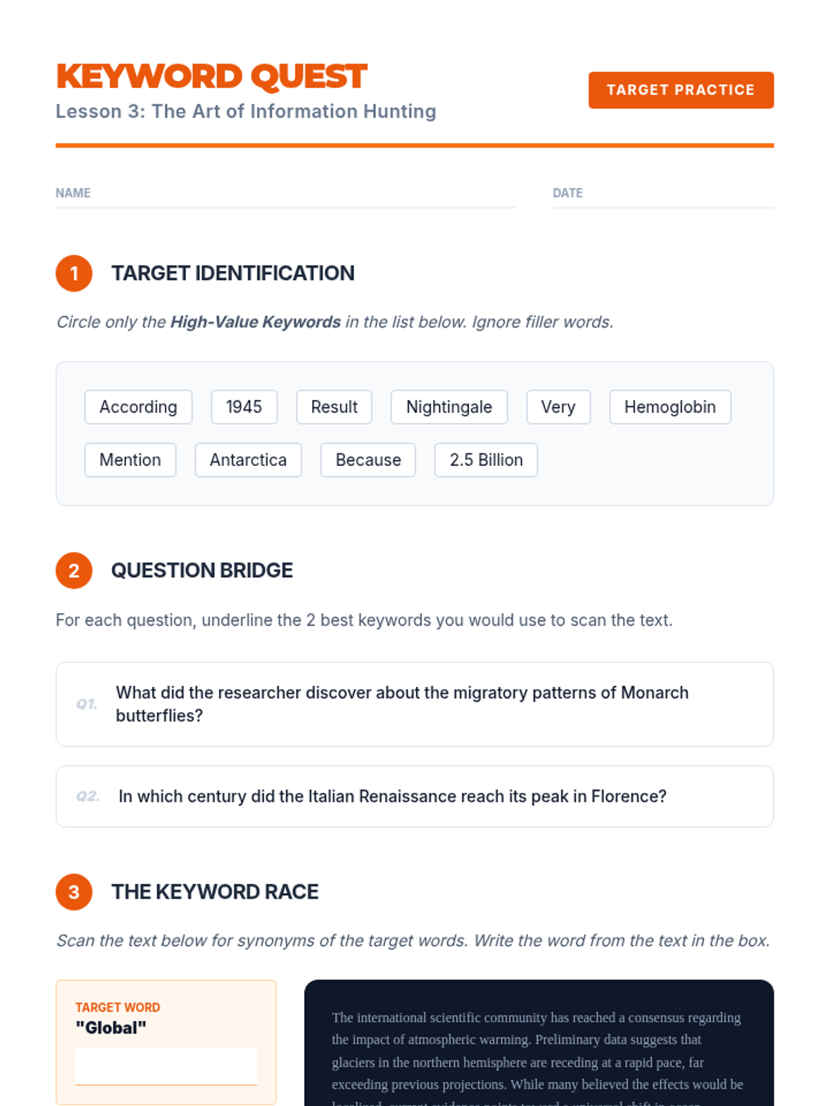 A workshop-style sequence for undergraduate ESL students to master skimming and scanning techniques for high-stakes academic exams. Students move from conceptual understanding to timed application, focusing on efficiency and accuracy in dense academic texts.