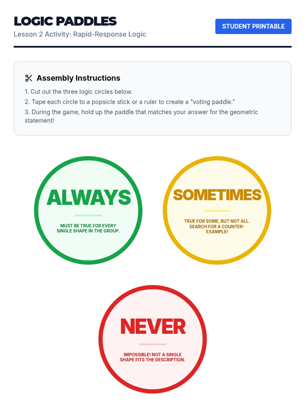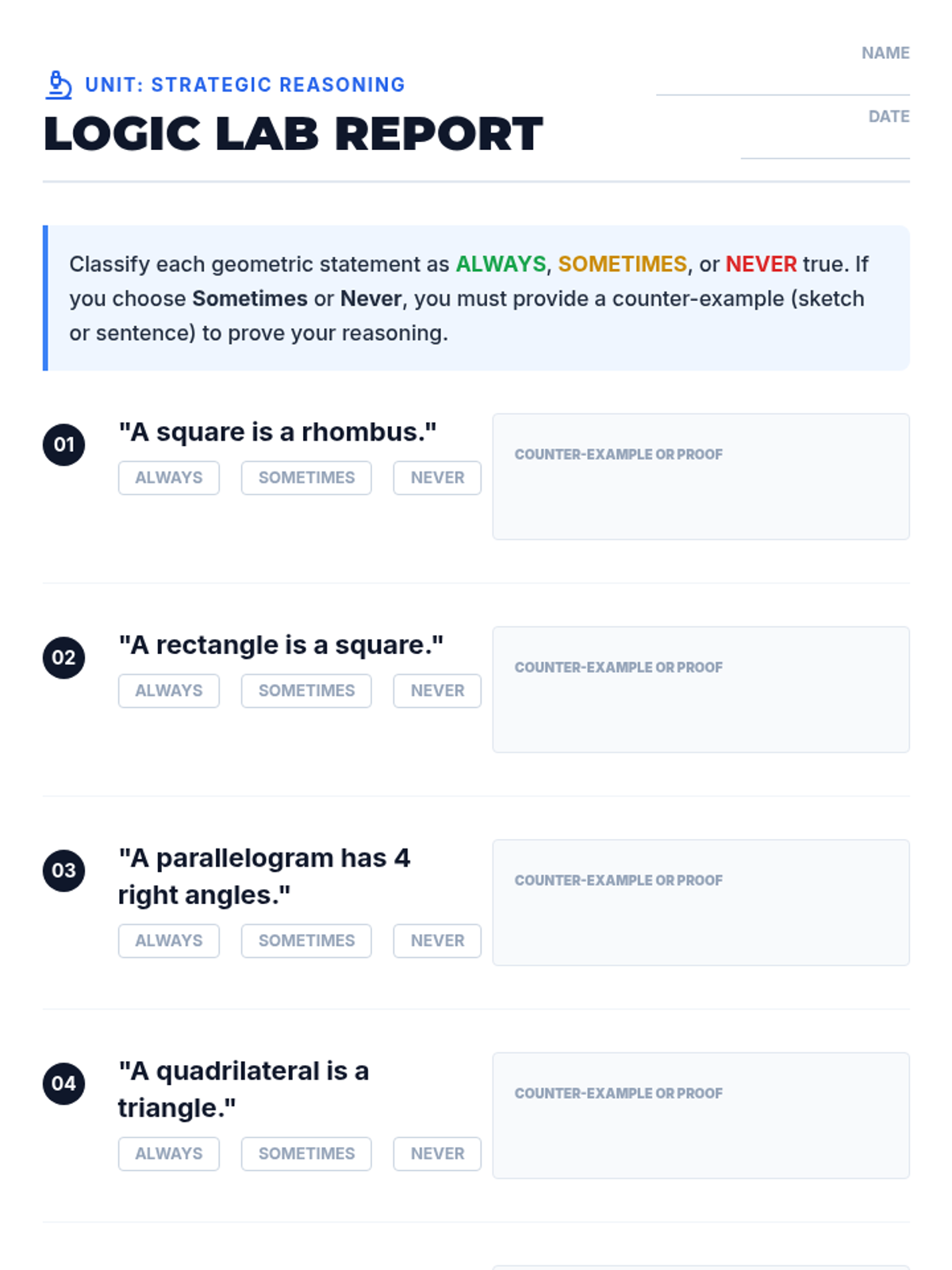 A 5th-grade geometry sequence focusing on the hierarchical classification of 2D figures through game-based learning and deductive reasoning. Students progress from attribute-based questioning to complex logic puzzles and coordinate-plane shape building.