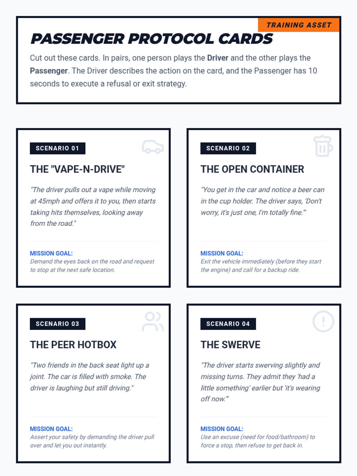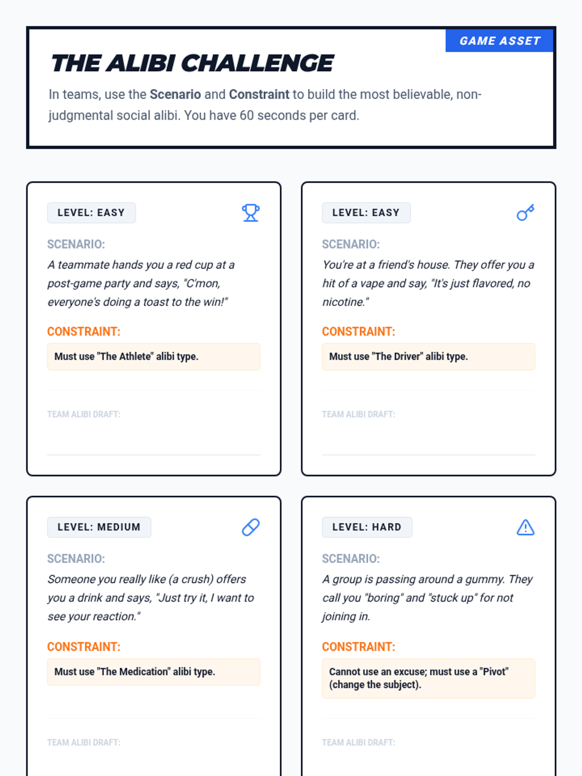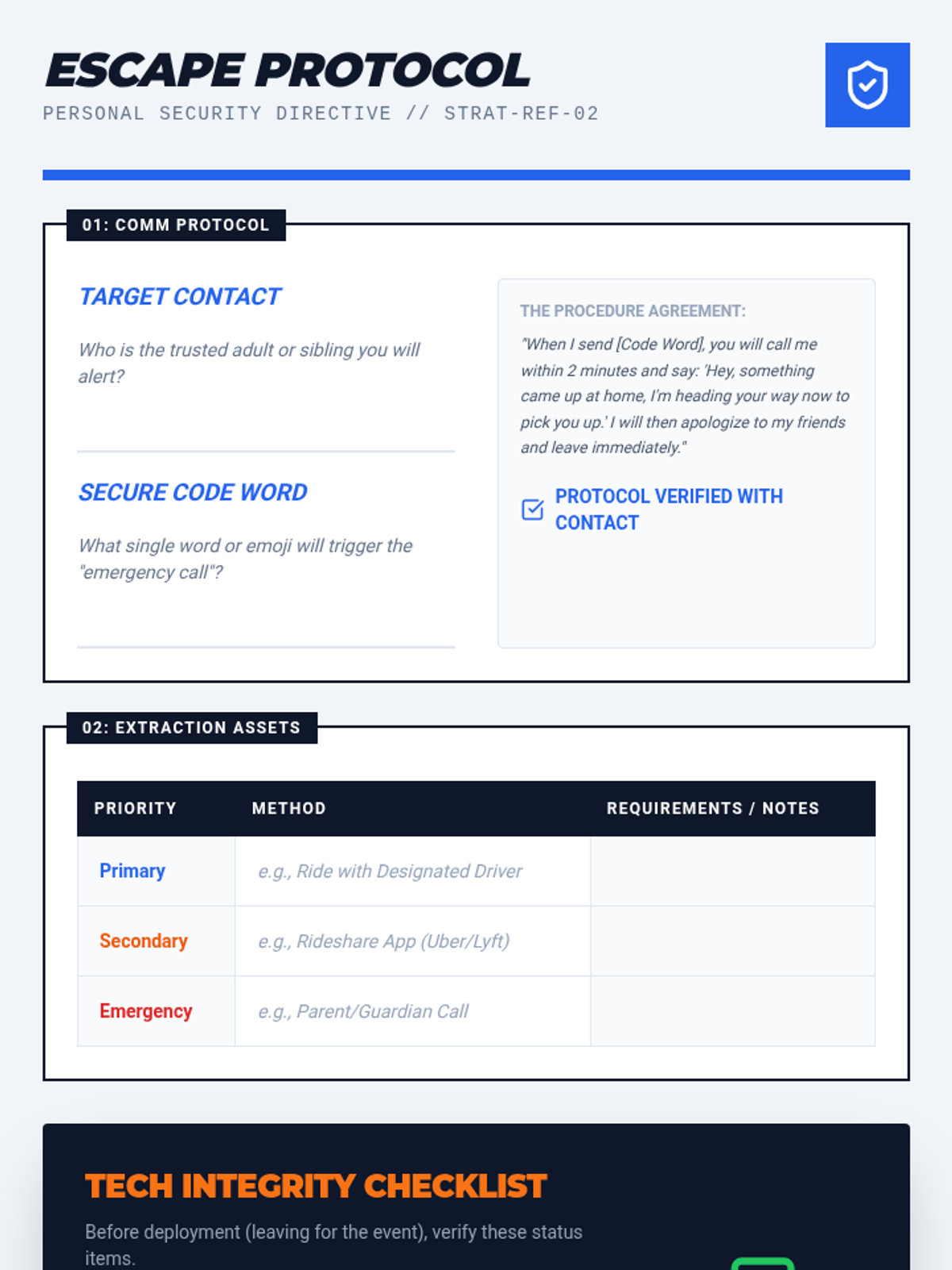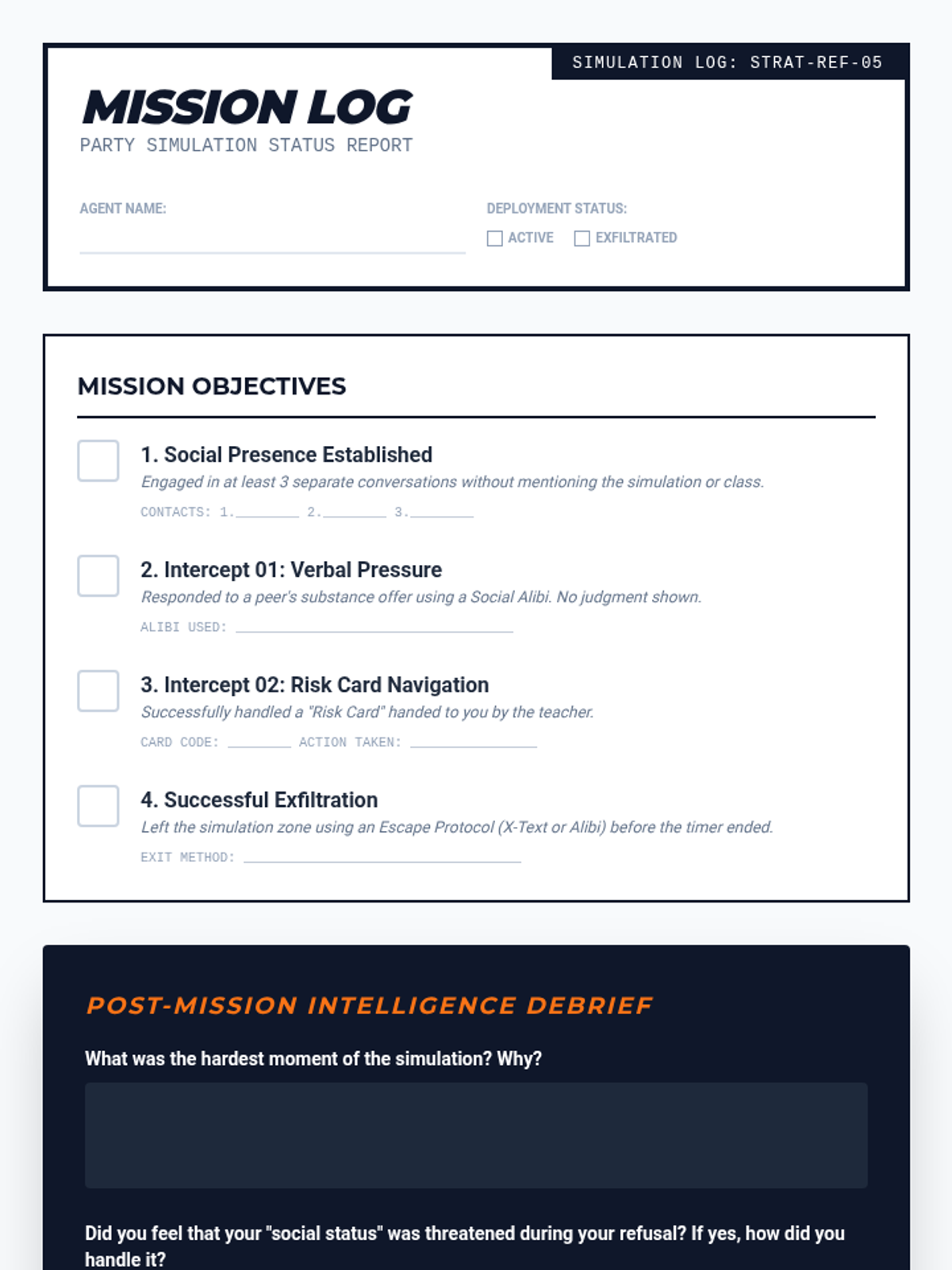 A tactical health sequence for 10th graders focusing on logistical preparation and environmental awareness to navigate high-risk substance pressure scenarios. Students develop concrete exit strategies, safety protocols, and social alibis.