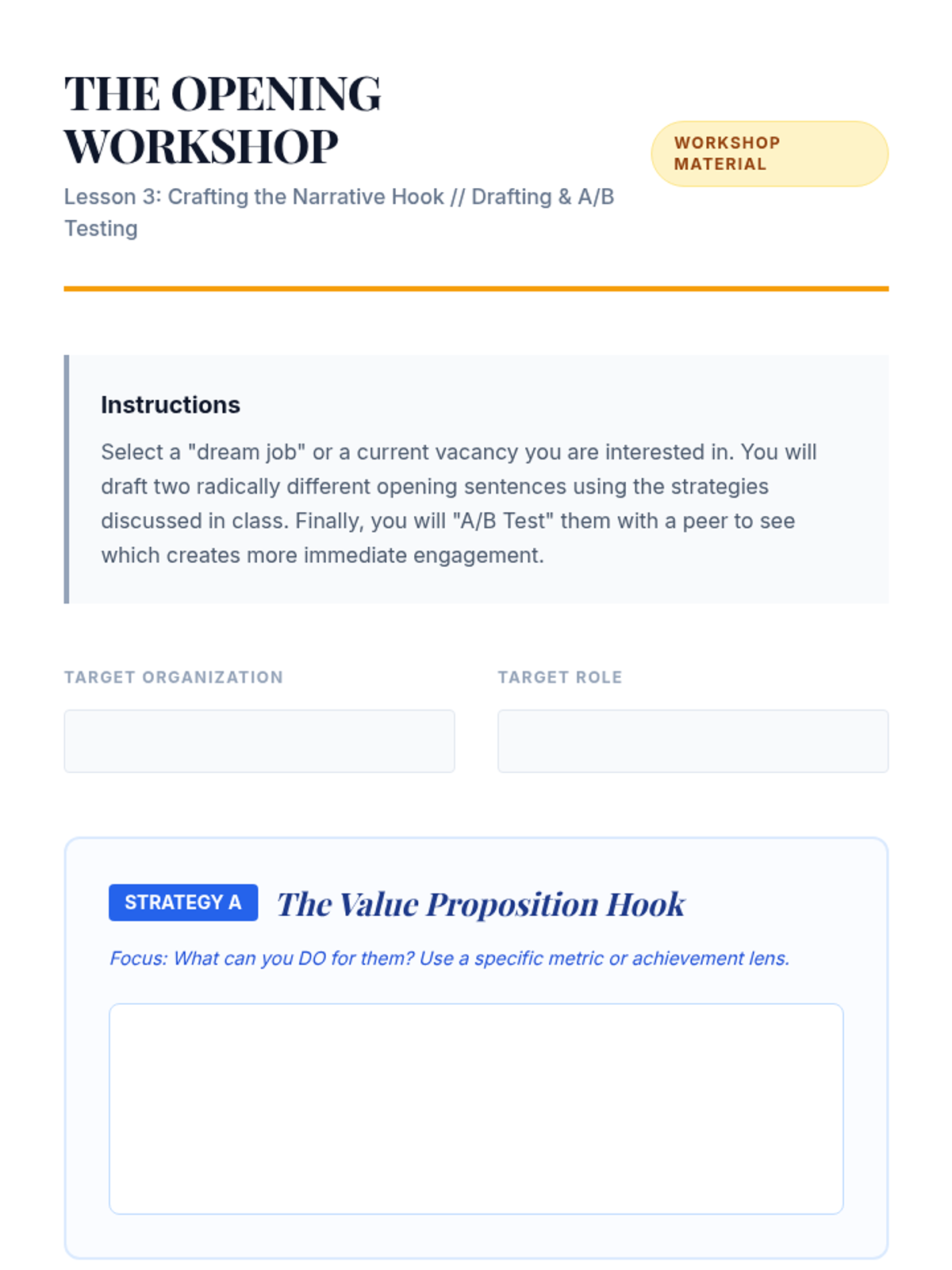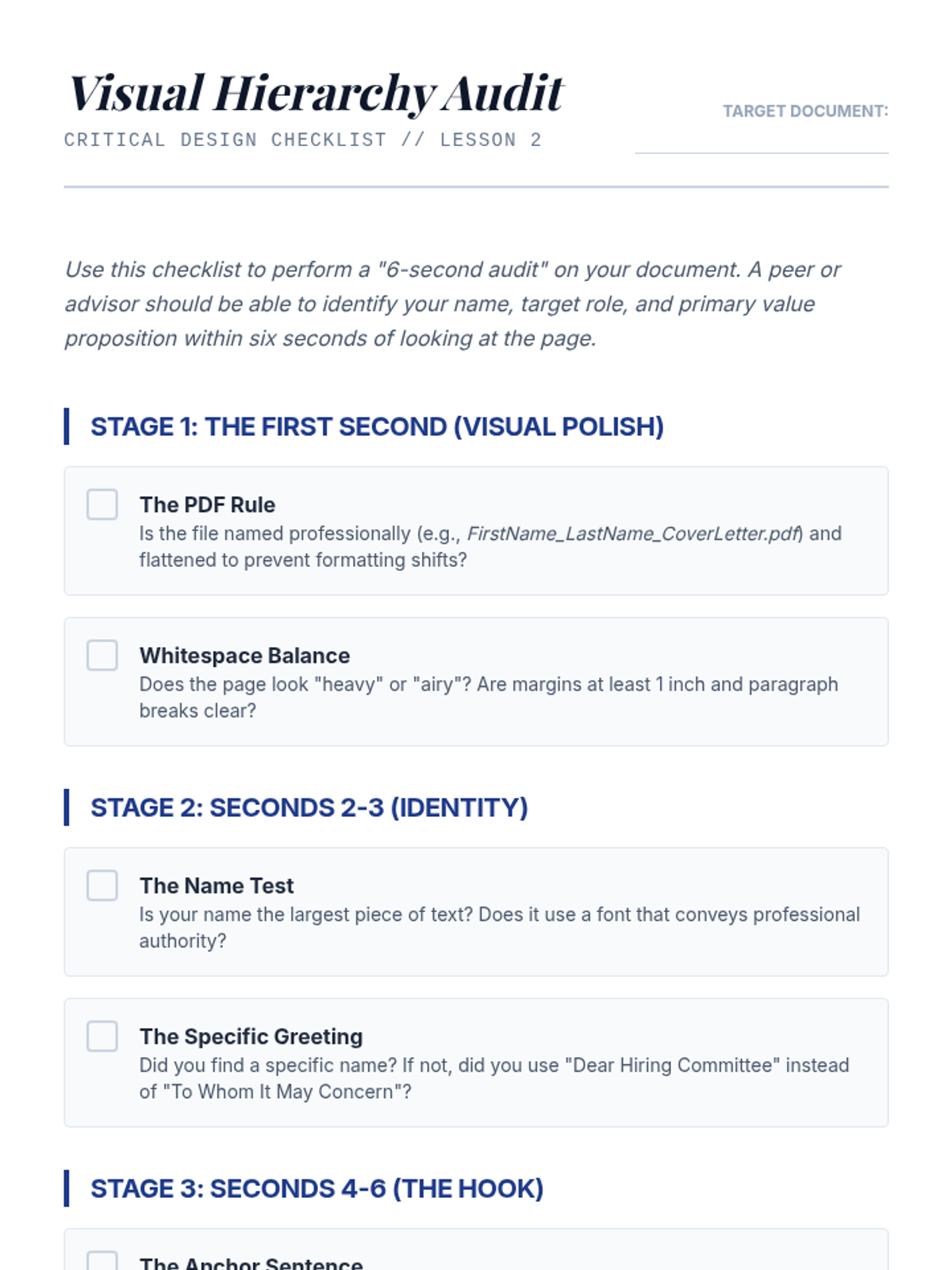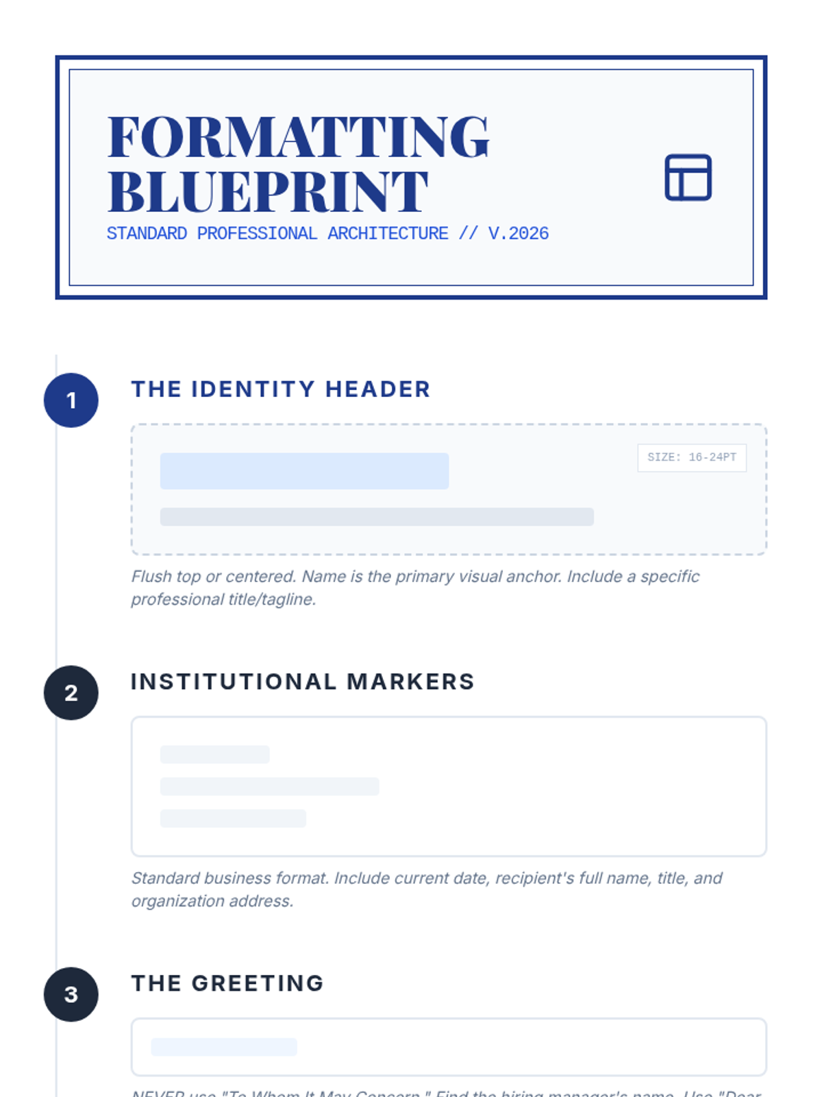 This graduate-level sequence focuses on the rhetorical architecture of professional cover letters. Students move beyond templates to master persuasive structure, visual hierarchy, and narrative argumentation, culminating in the ability to craft compelling, high-stakes professional correspondence.