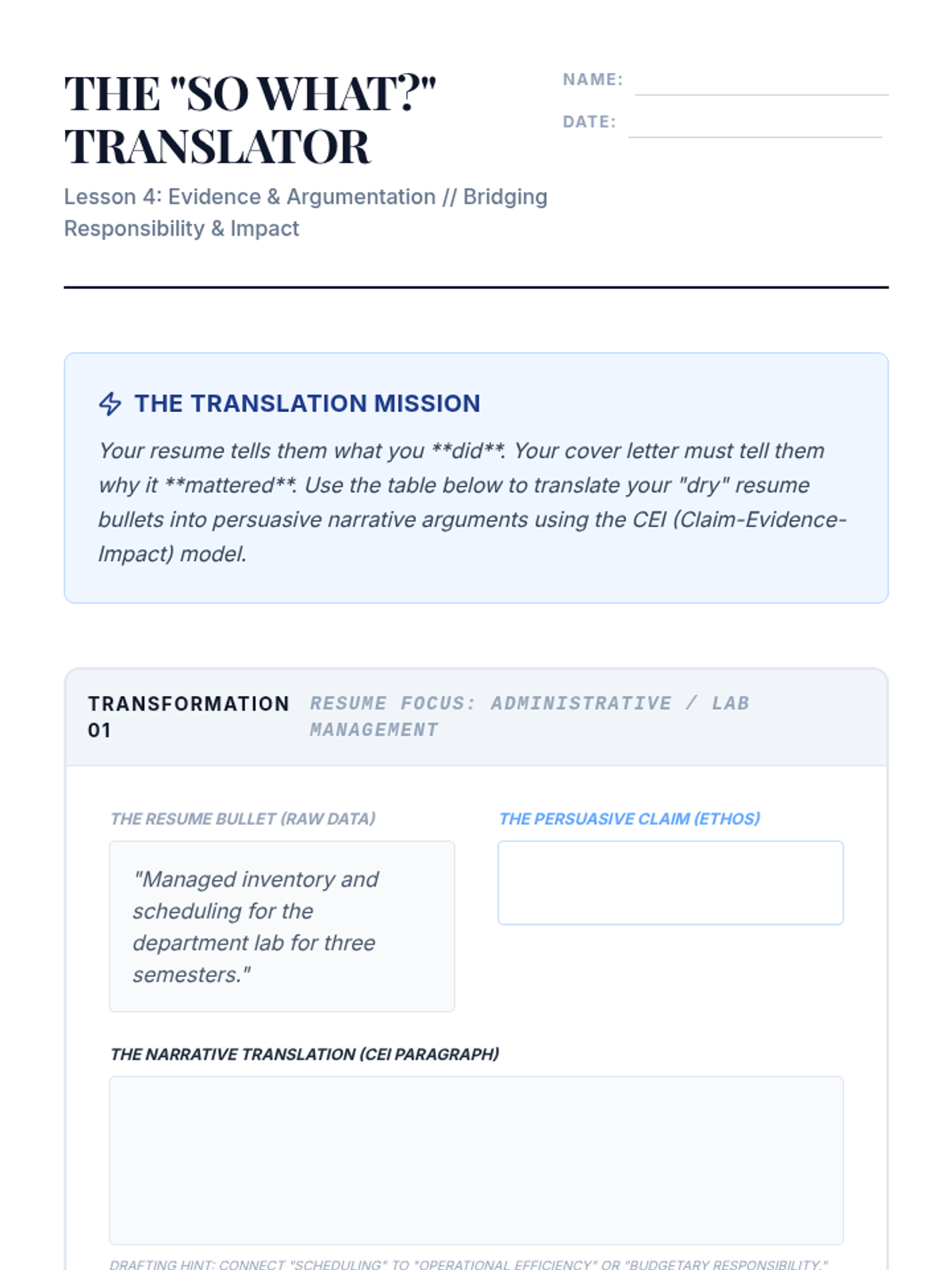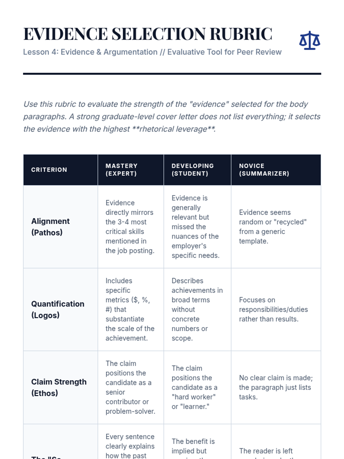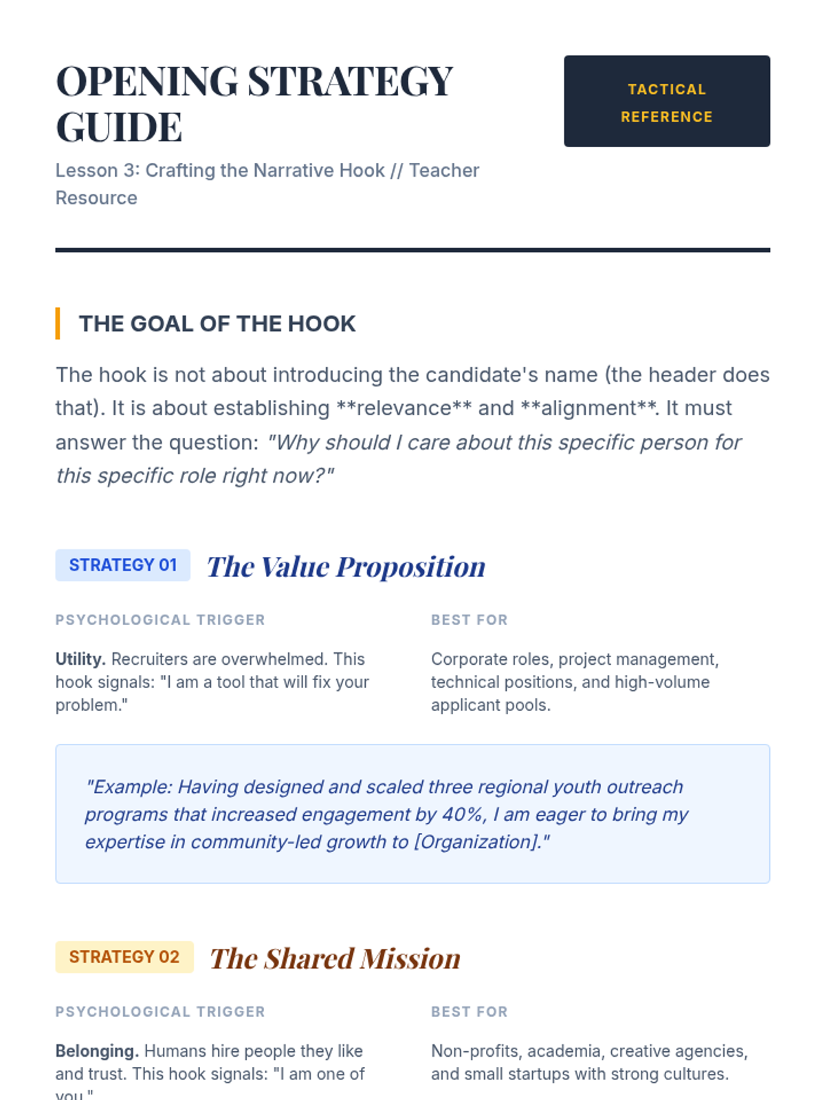 This graduate-level sequence focuses on the rhetorical architecture of professional cover letters. Students move beyond templates to master persuasive structure, visual hierarchy, and narrative argumentation, culminating in the ability to craft compelling, high-stakes professional correspondence.
