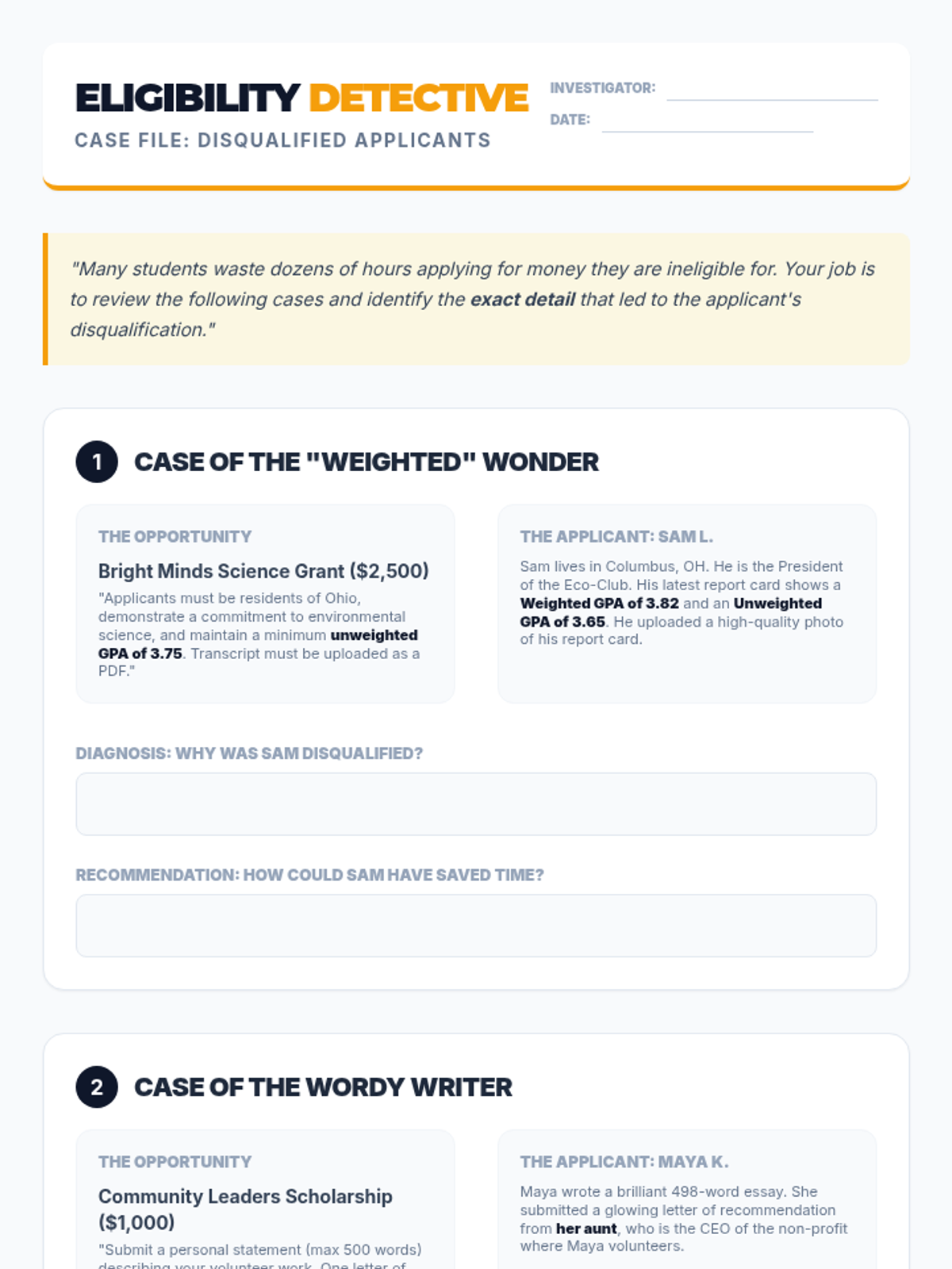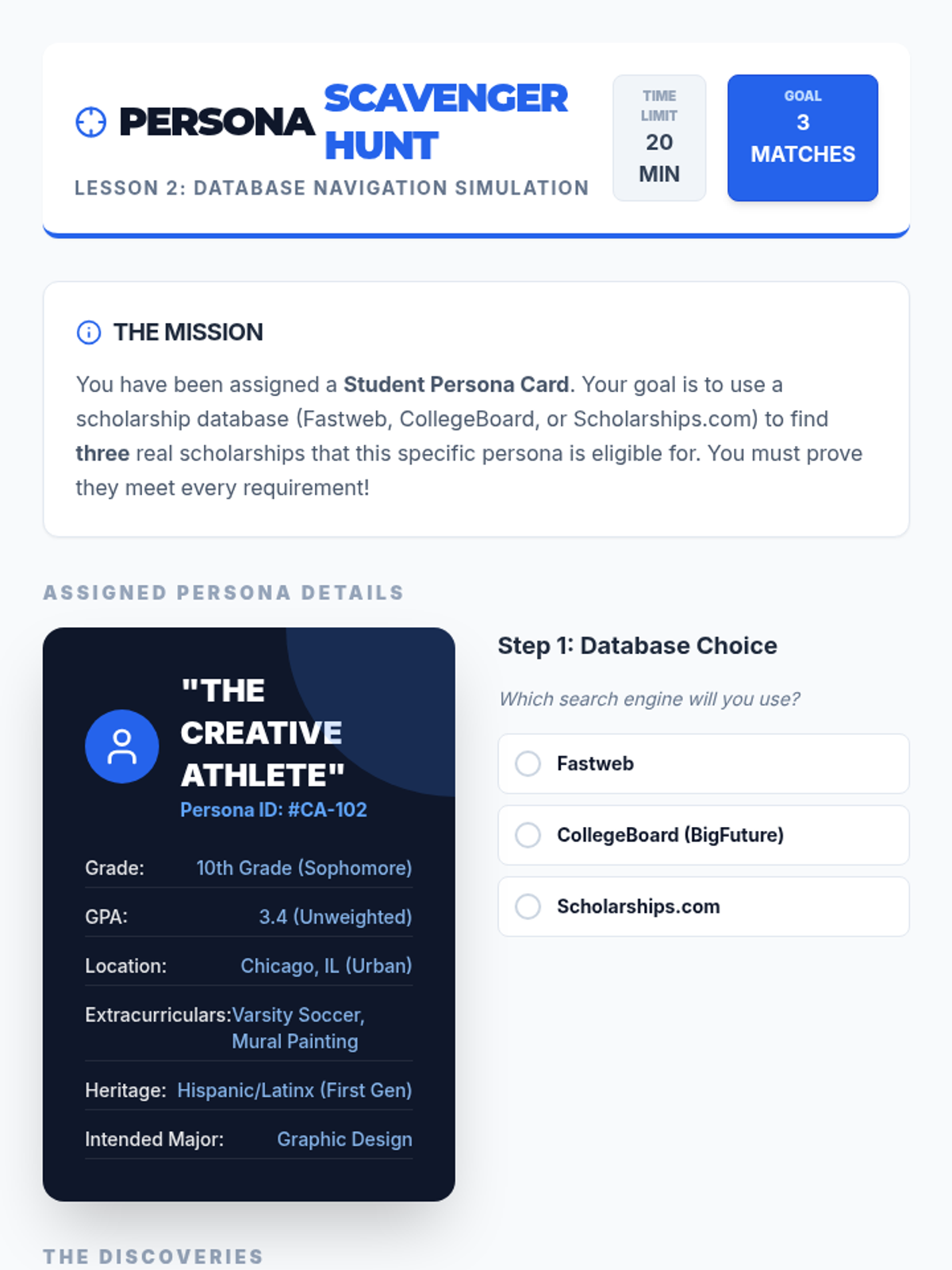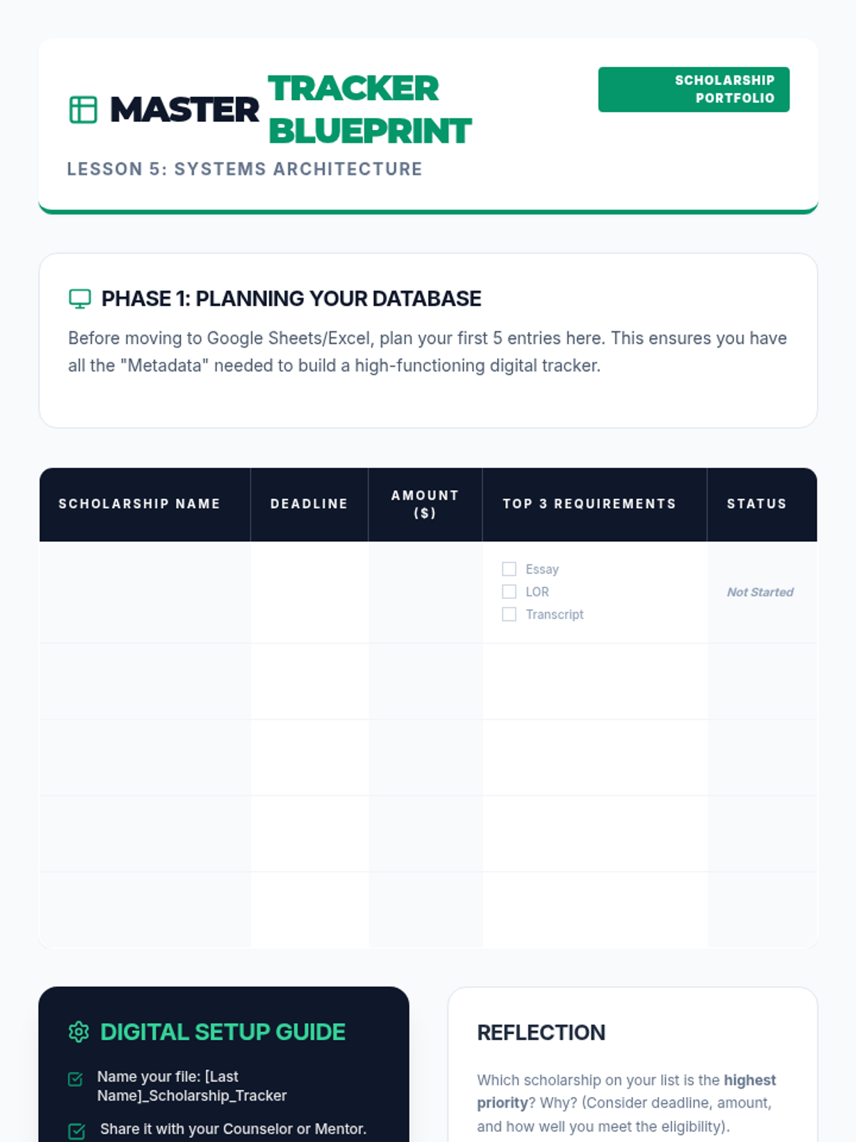 This 10th-grade sequence equips students with the skills to find and manage scholarships. Students learn to navigate databases, decode eligibility, avoid scams, and build a digital tracking system to prepare for post-secondary funding.