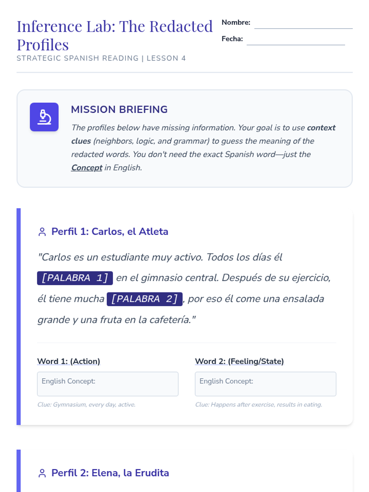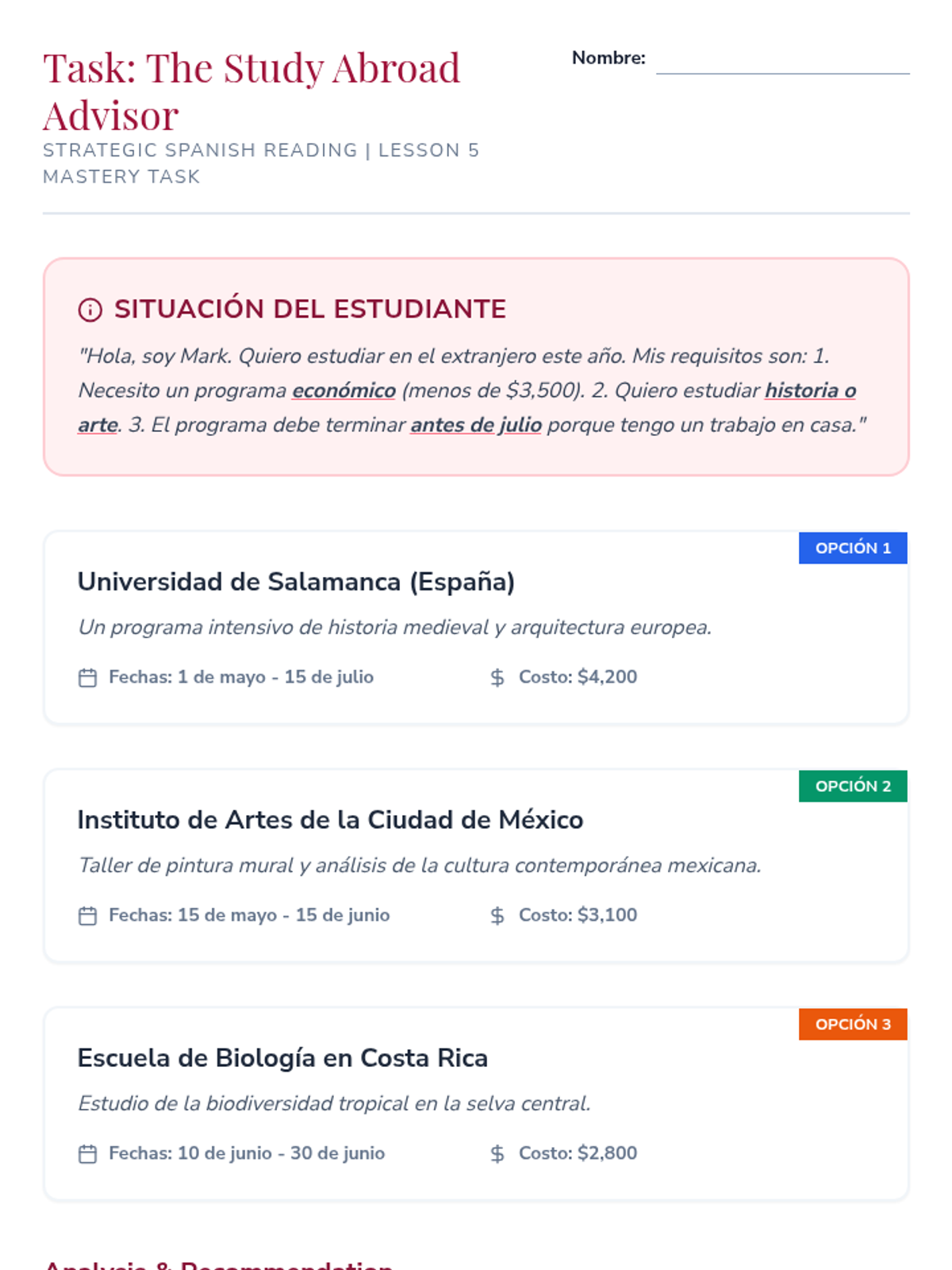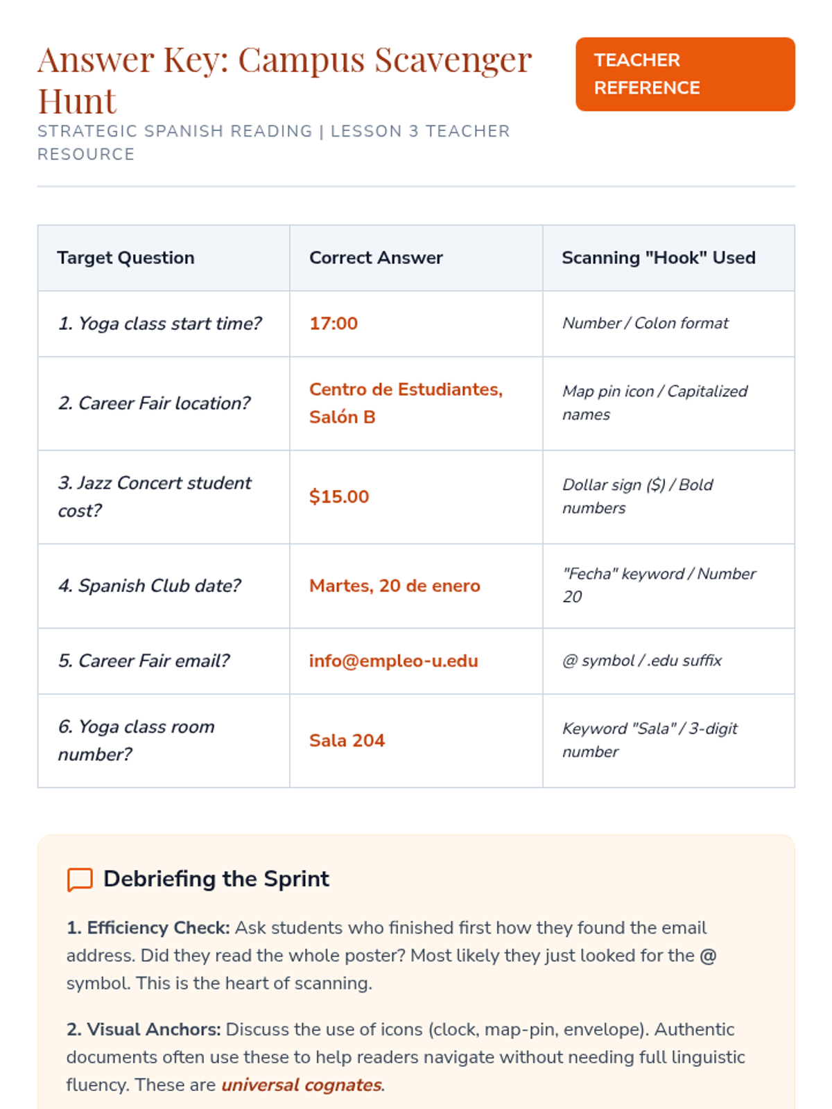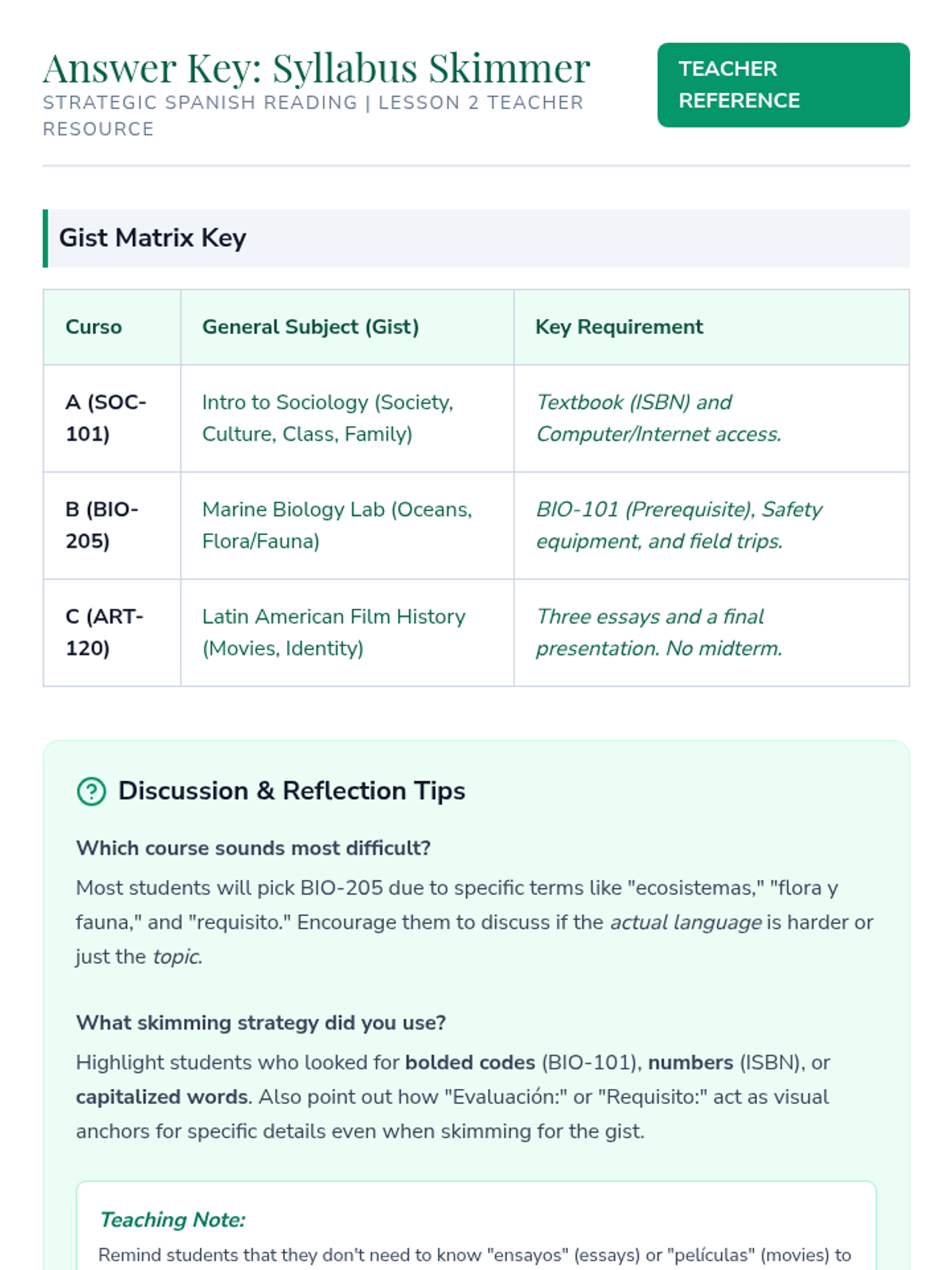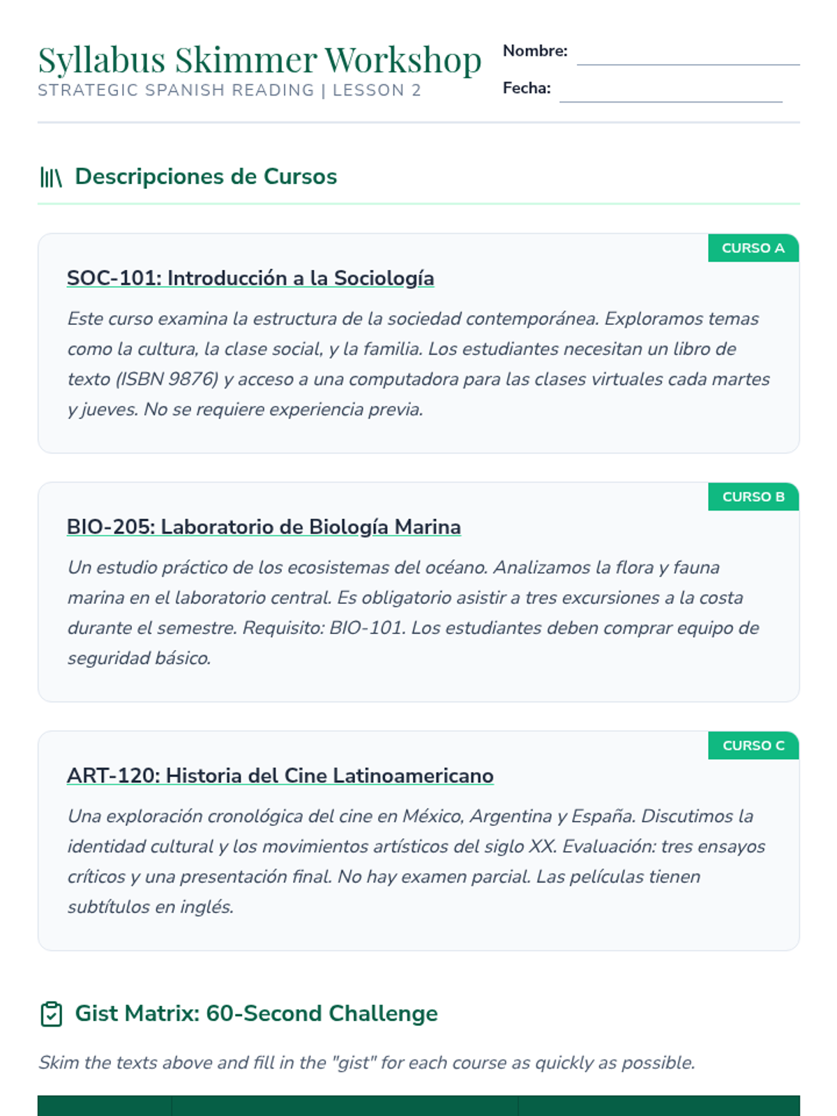 This sequence equips undergraduate Spanish students with meta-cognitive reading strategies like cognate recognition, skimming, and scanning using authentic university-themed texts. Students progress from word-level decoding to synthesizing information from multiple sources.