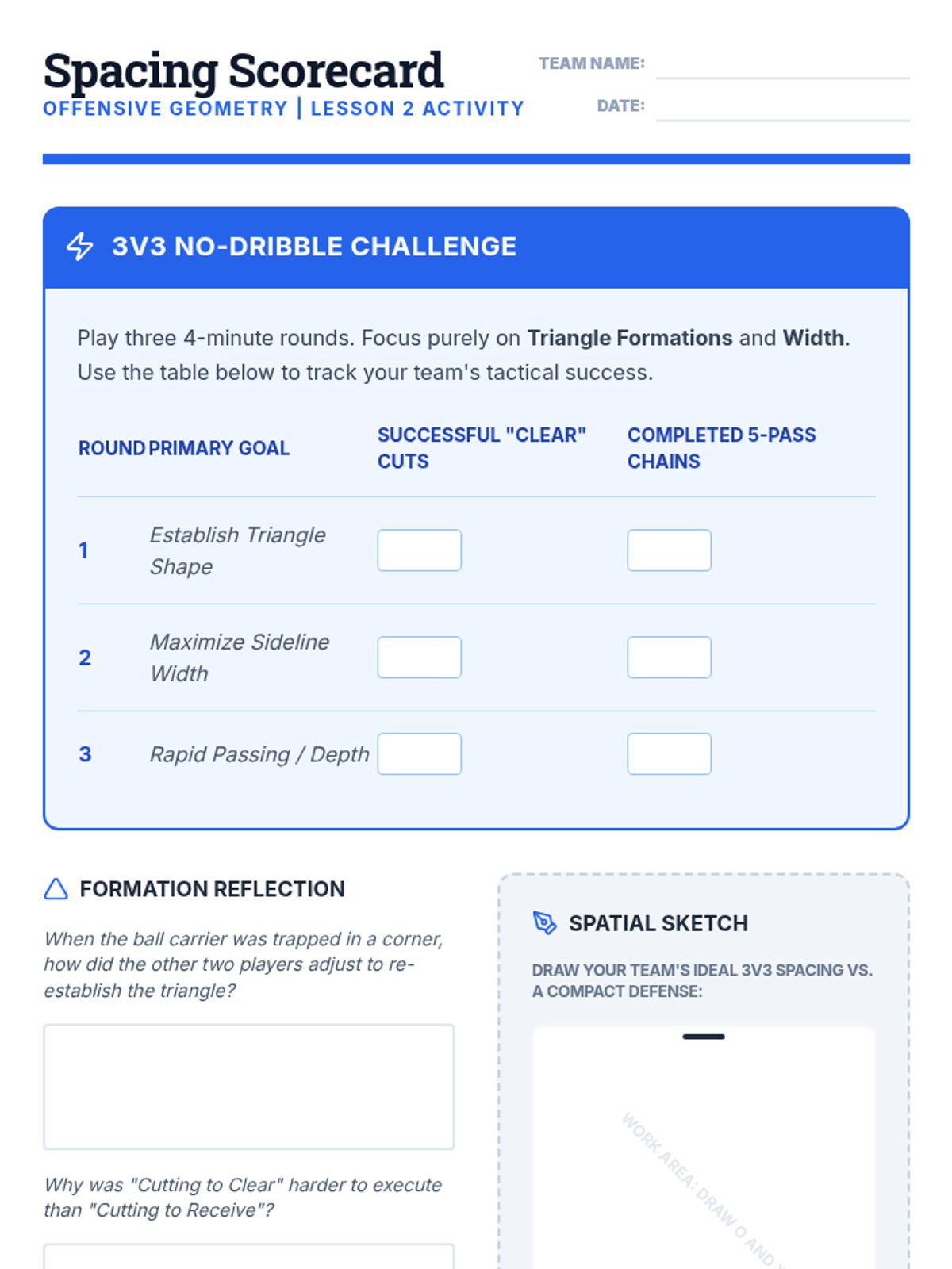An advanced physical education sequence for 11th-grade students focused on tactical spatial positioning in invasion games. Students analyze defensive geometry, offensive spacing, numerical overloads, and transition dynamics to master spatial manipulation on the field or court.