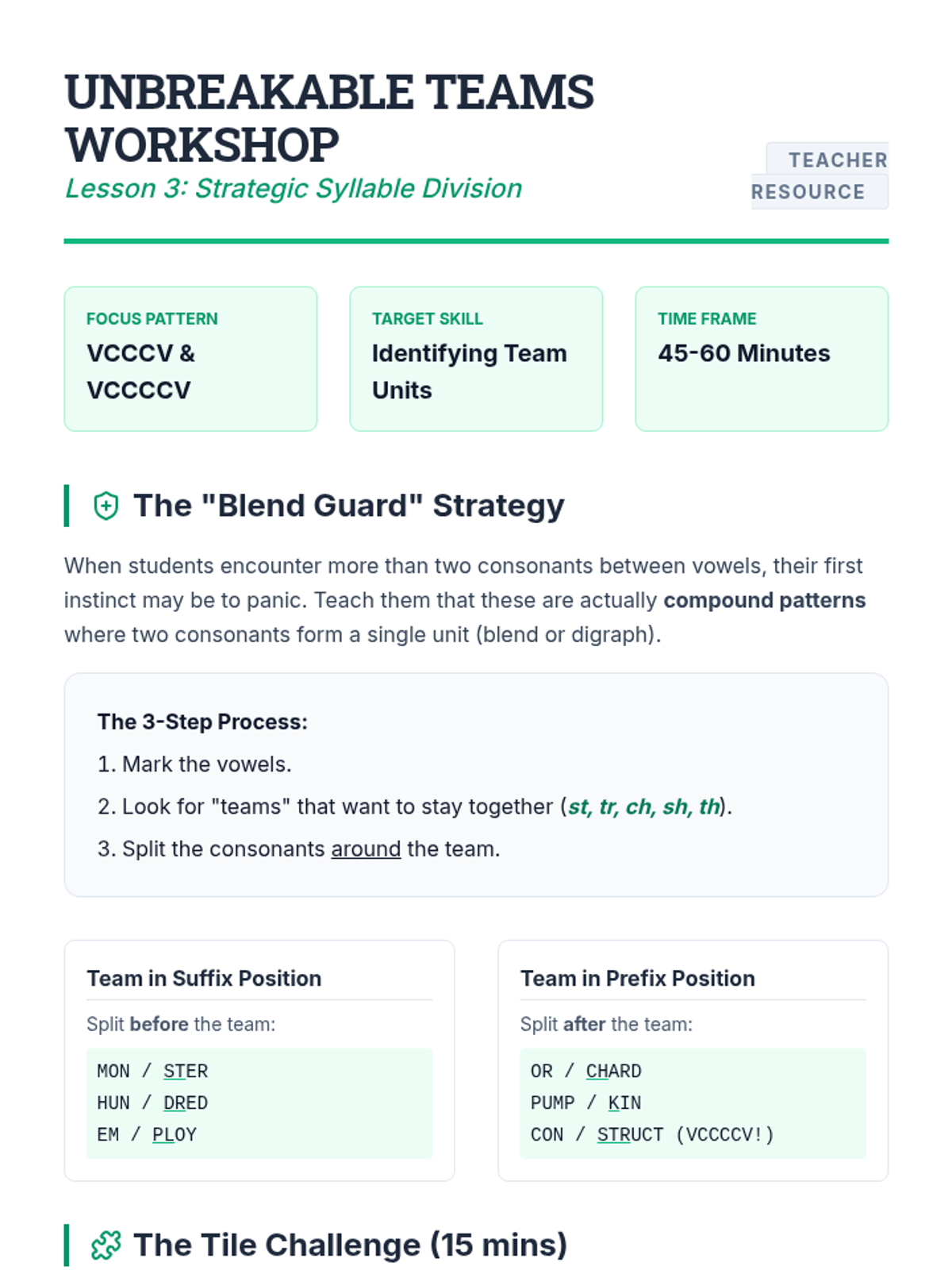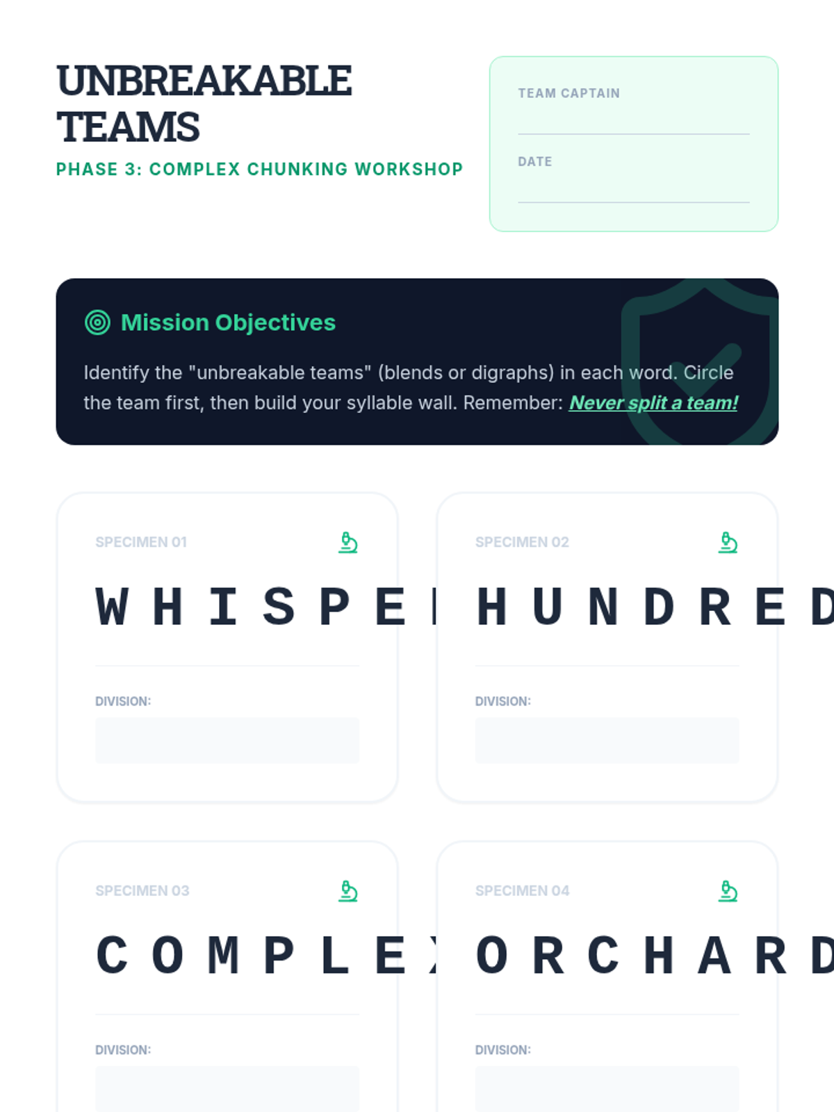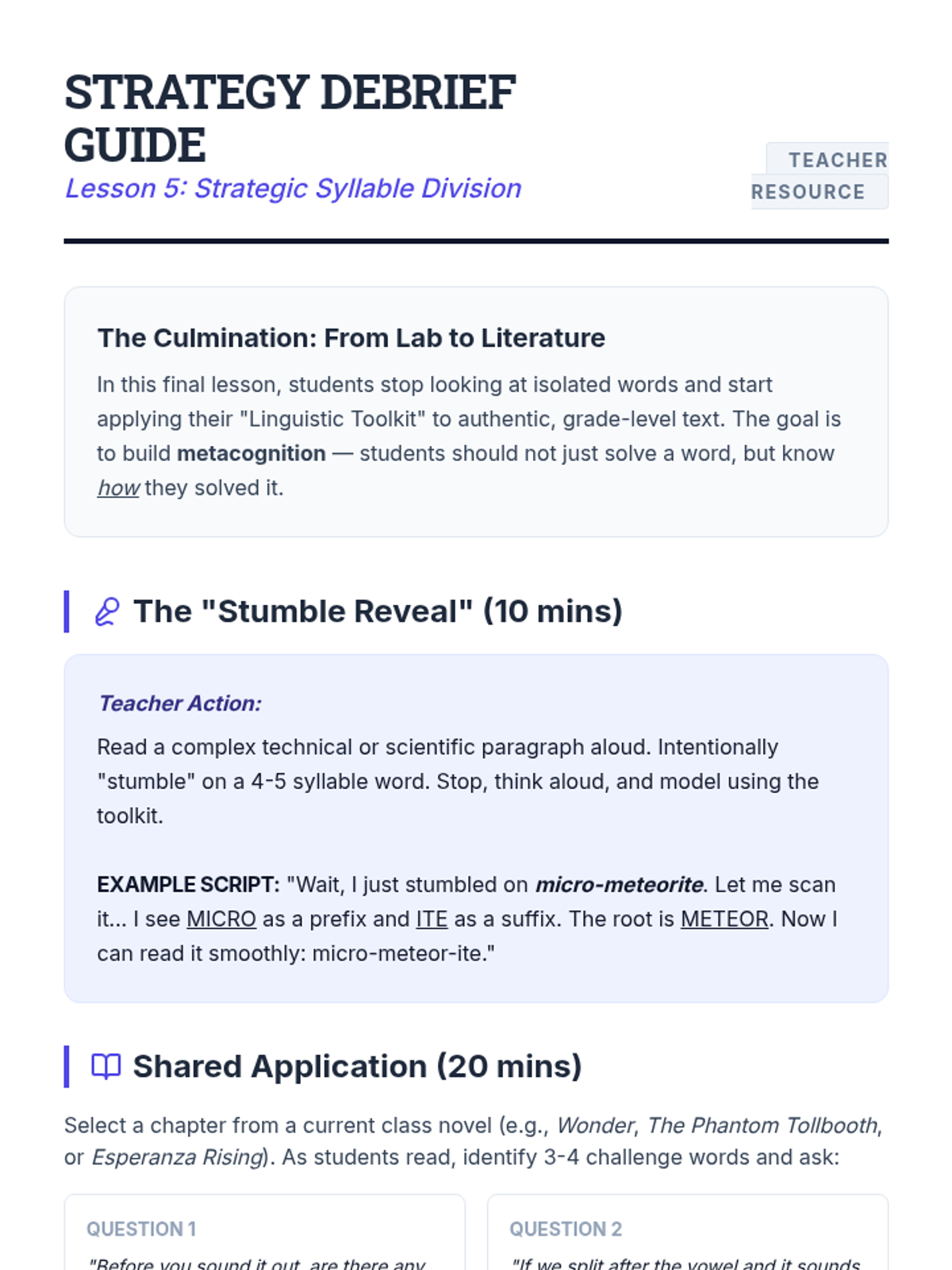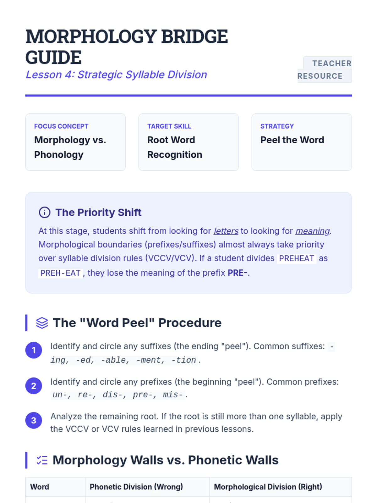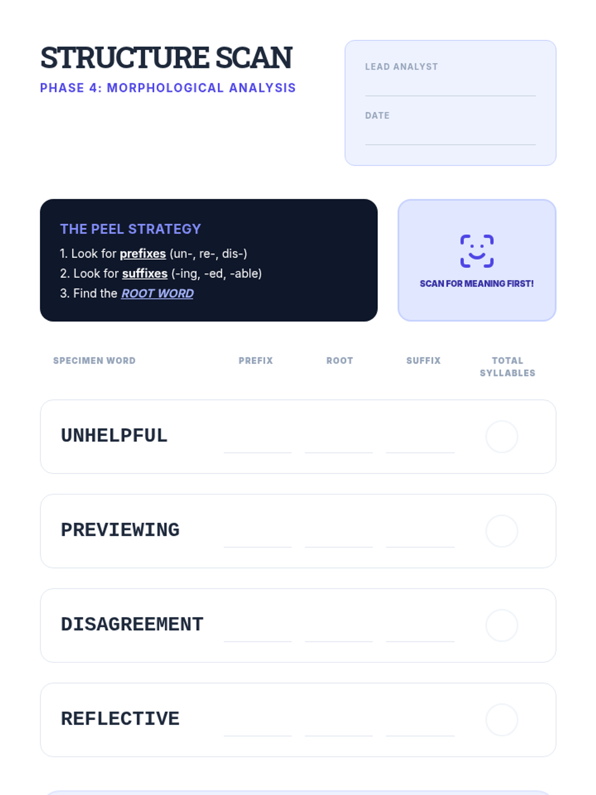 A comprehensive 5th-grade sequence that moves students from basic syllable division patterns to flexible morphological analysis. Students investigate how word structure influences pronunciation and develop strategies for decoding complex, multi-syllabic vocabulary in authentic texts.