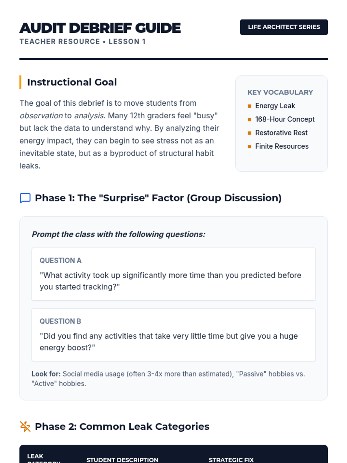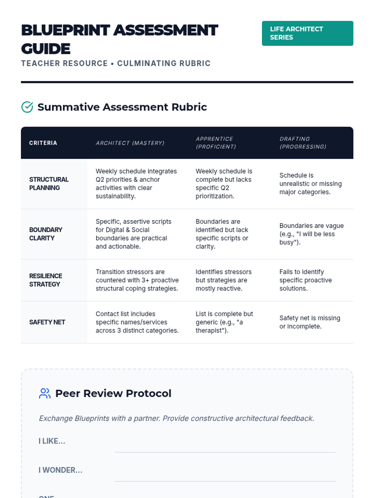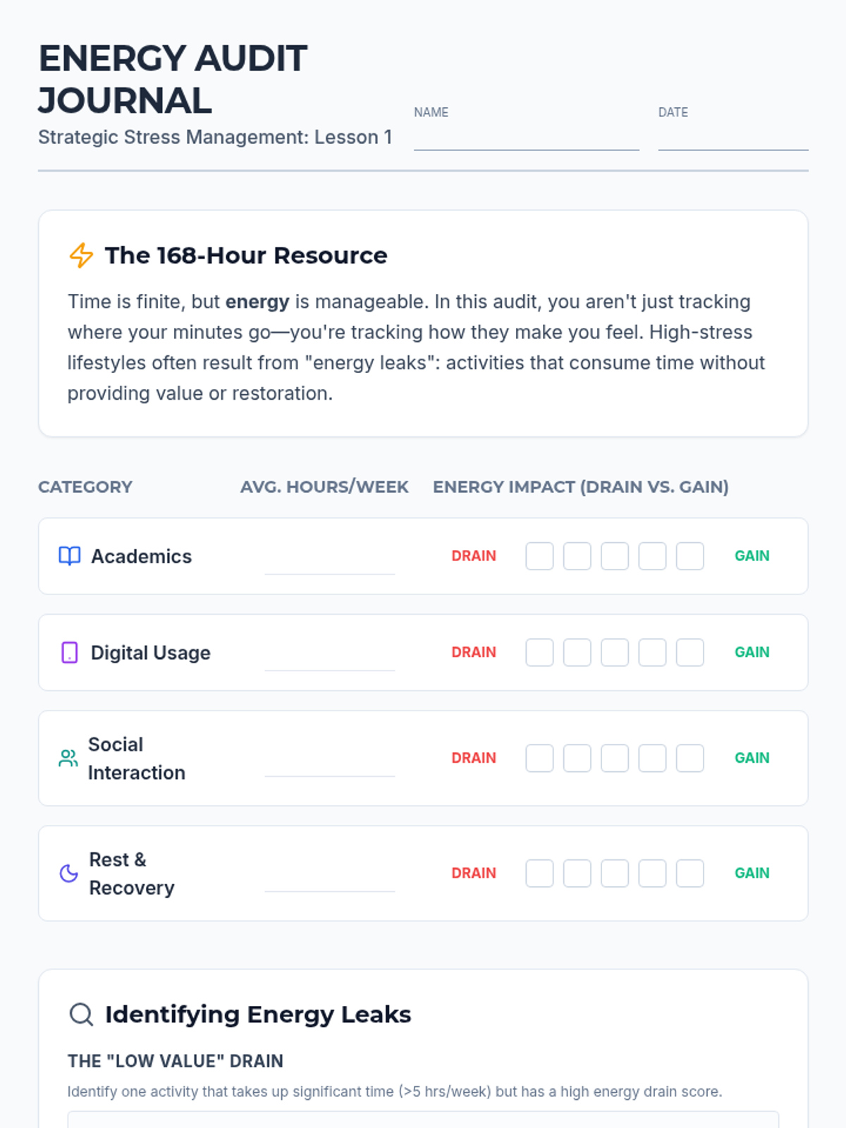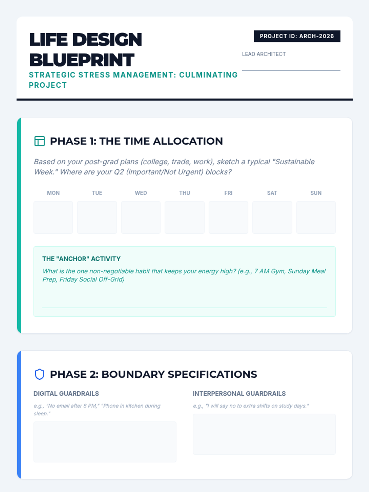 This 12th-grade sequence focuses on preventative mental health by treating time and energy as finite resources. Students learn to audit their habits, prioritize using structural frameworks, set interpersonal boundaries, and plan for the transition out of high school through a strategic life design project.