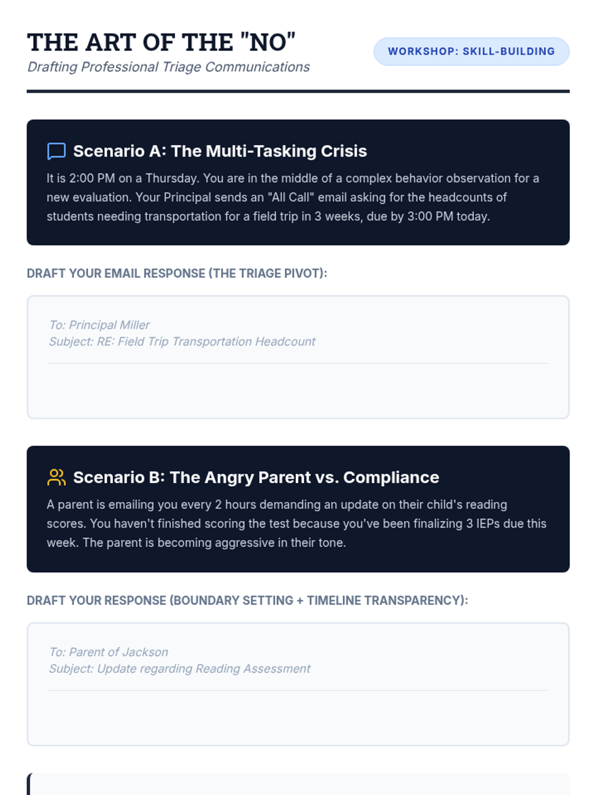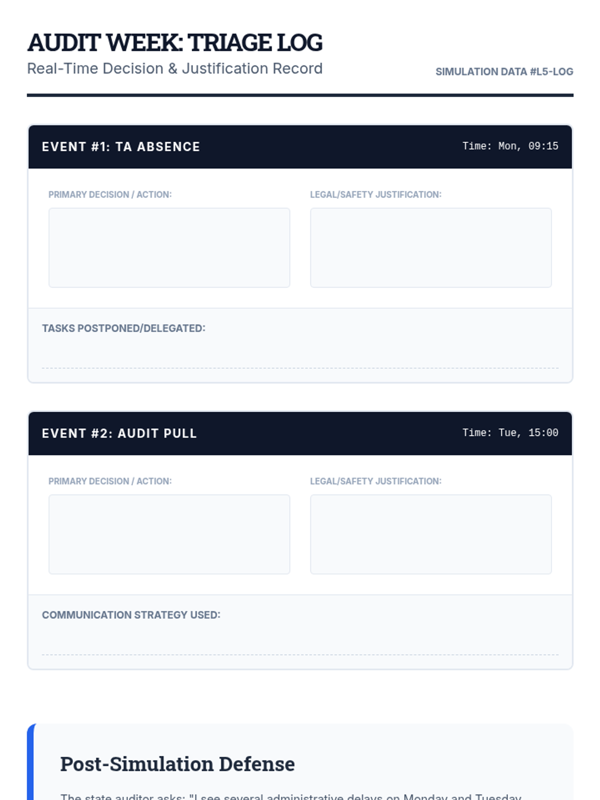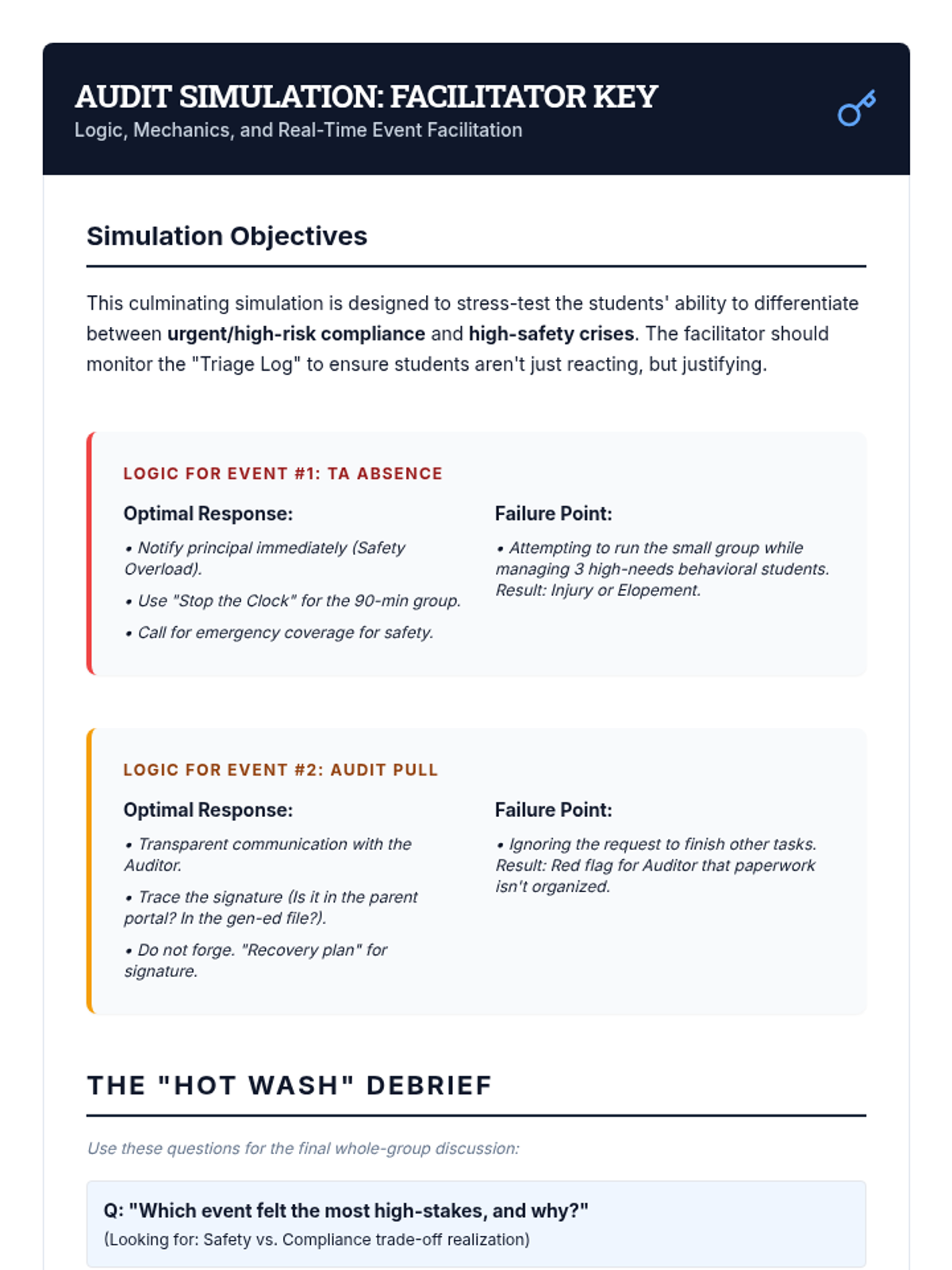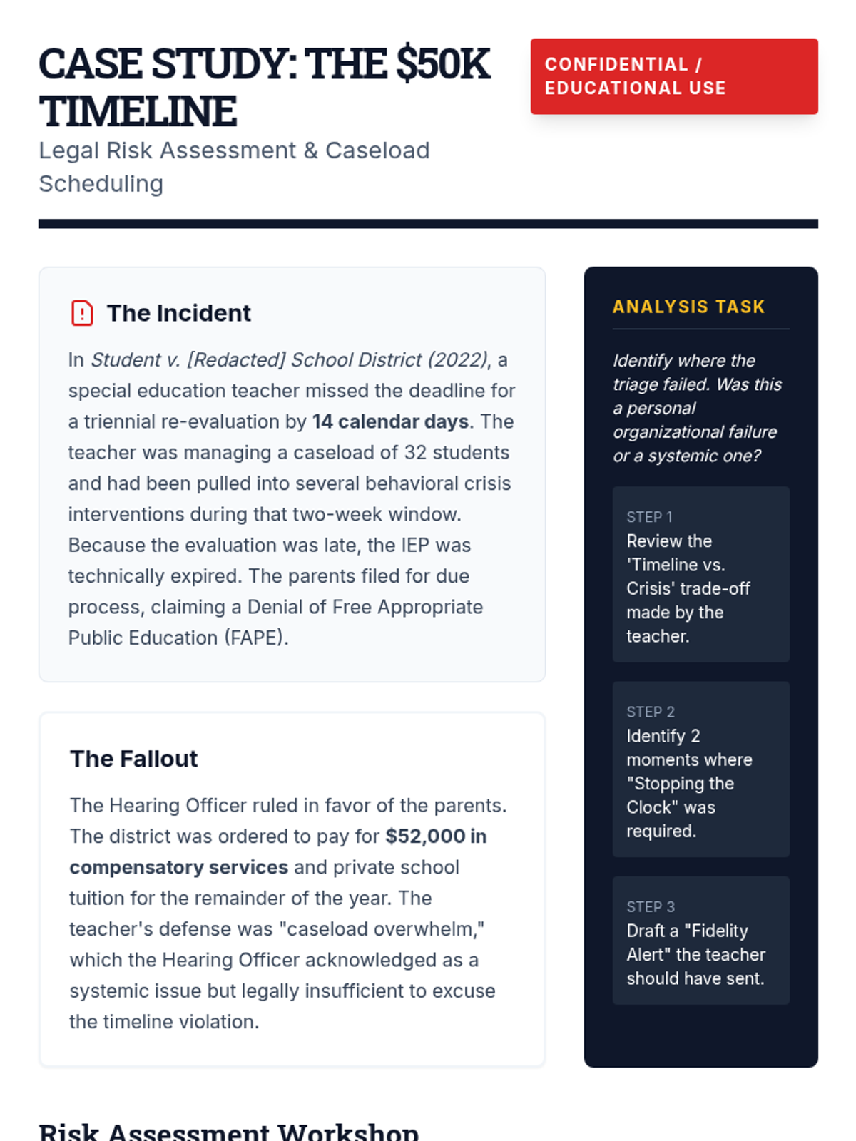 A graduate-level sequence focused on the complex task of balancing multiple commitments in special education through triage protocols, legal risk assessment, and crisis management frameworks. Students move from theoretical time management to high-stakes simulation involving caseload management and compliance fidelity.