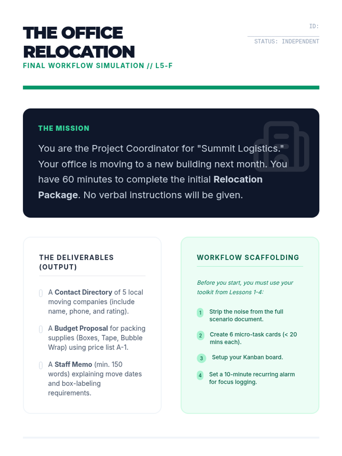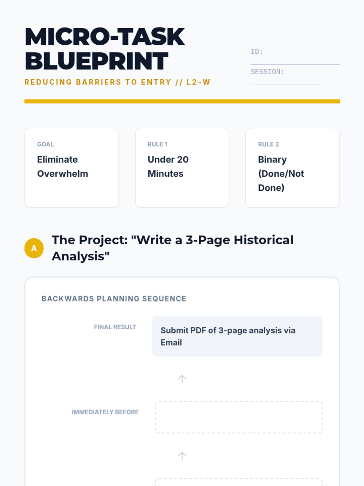 This sequence prepares 12th-grade students with working memory challenges for post-secondary life by teaching them how to deconstruct complex projects, externalize their executive functions, and monitor their own cognitive fatigue. Students progress from task analysis to a full independent workflow simulation, building a toolkit of strategies for sustained attention.