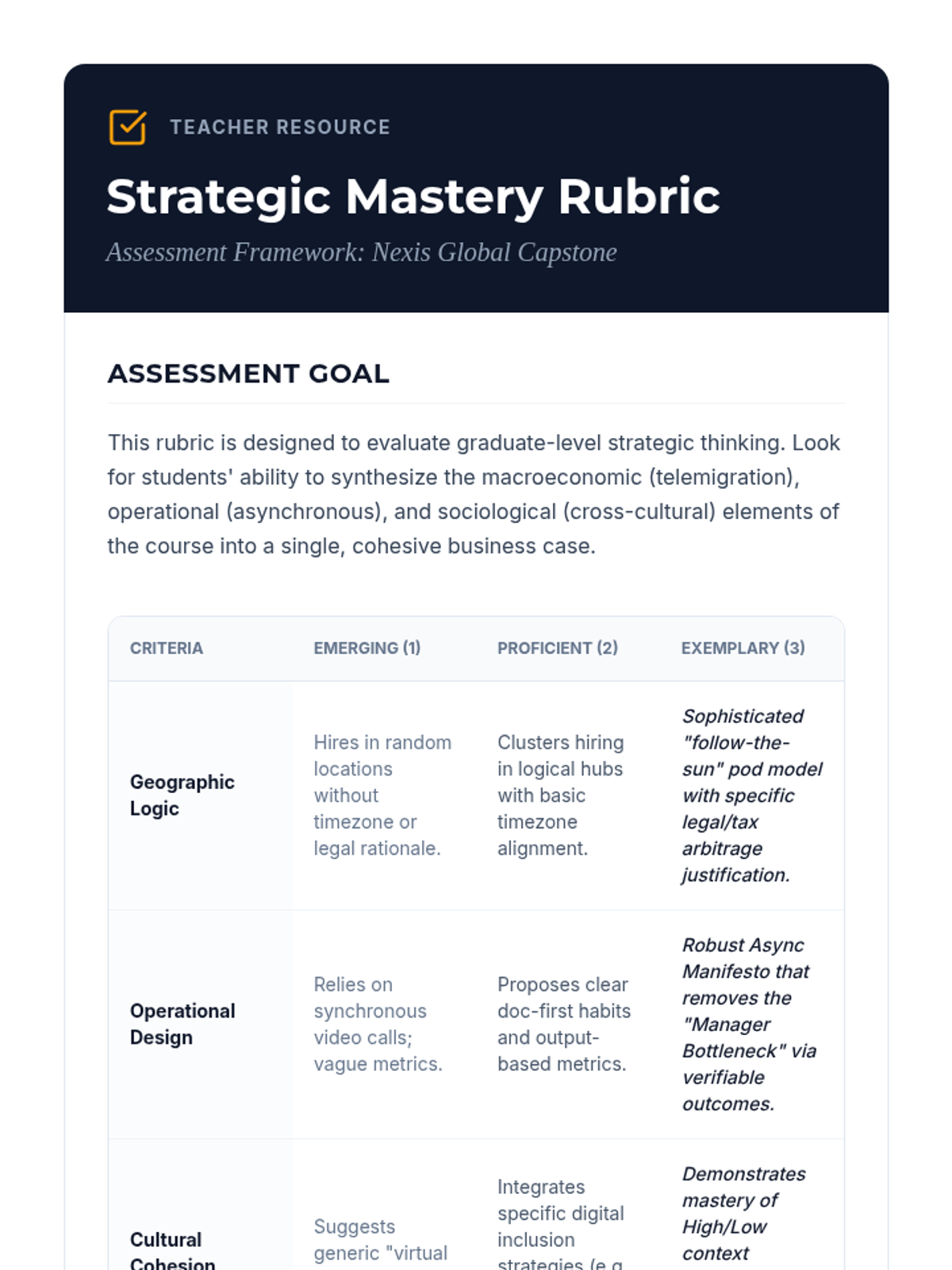 This graduate-level sequence explores the macroeconomic and organizational shifts caused by the decoupling of labor from location. It covers telemigration, asynchronous management, urban economic impacts, and cross-cultural digital leadership, culminating in a strategic workforce planning capstone.