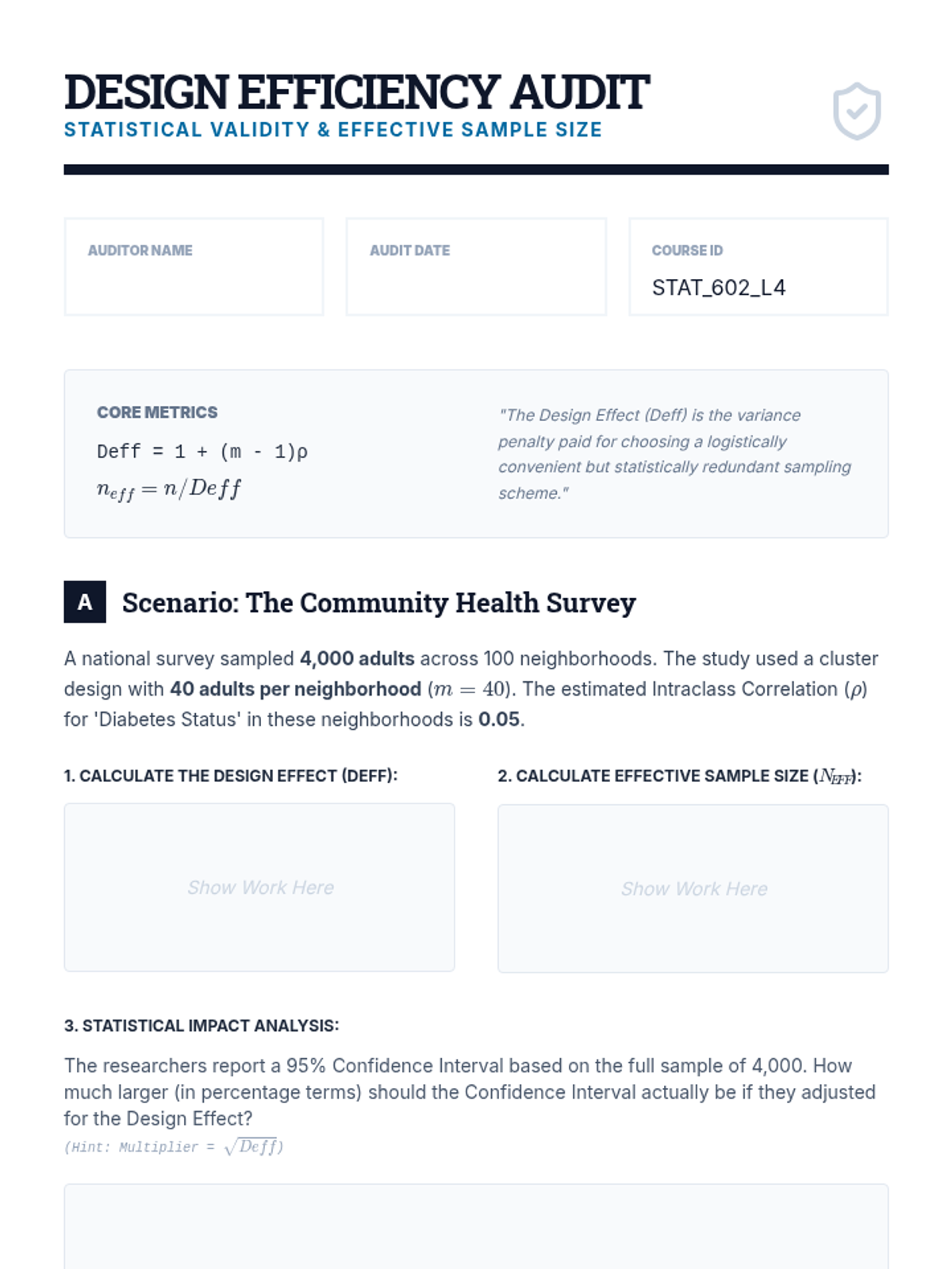 This graduate-level sequence covers advanced statistical sampling techniques, focusing on the optimization of stratified, cluster, and multi-stage designs. Students learn to navigate the trade-offs between precision and cost, calculate design effects, and mitigate biases like periodicity.
