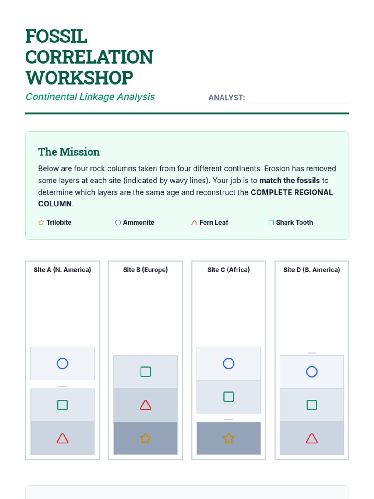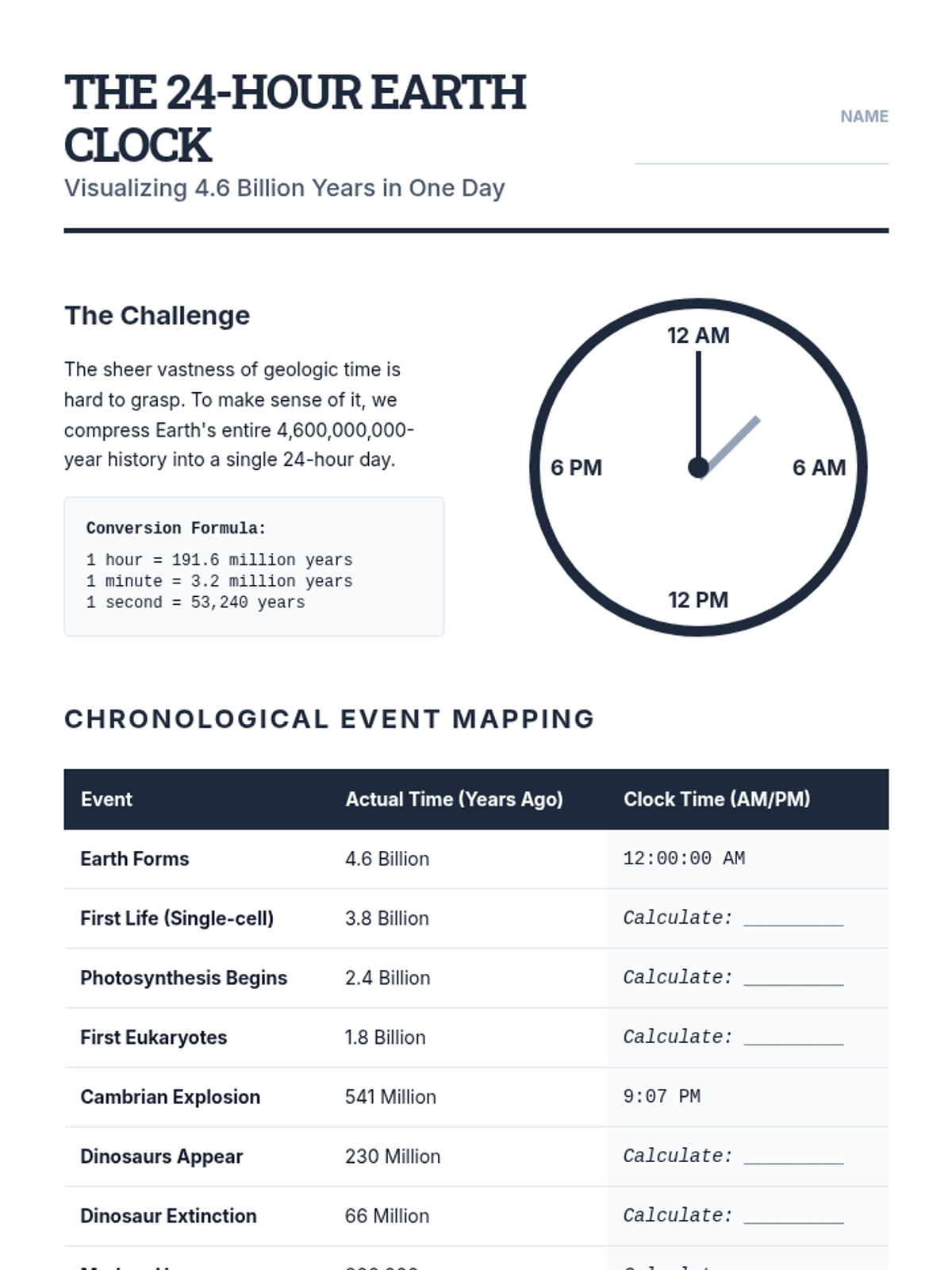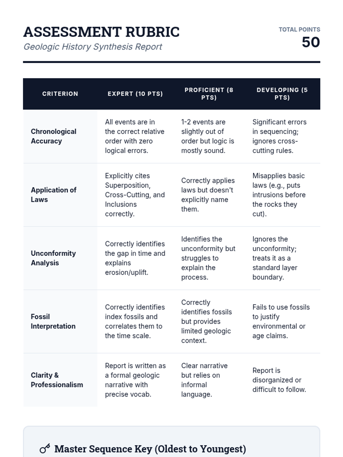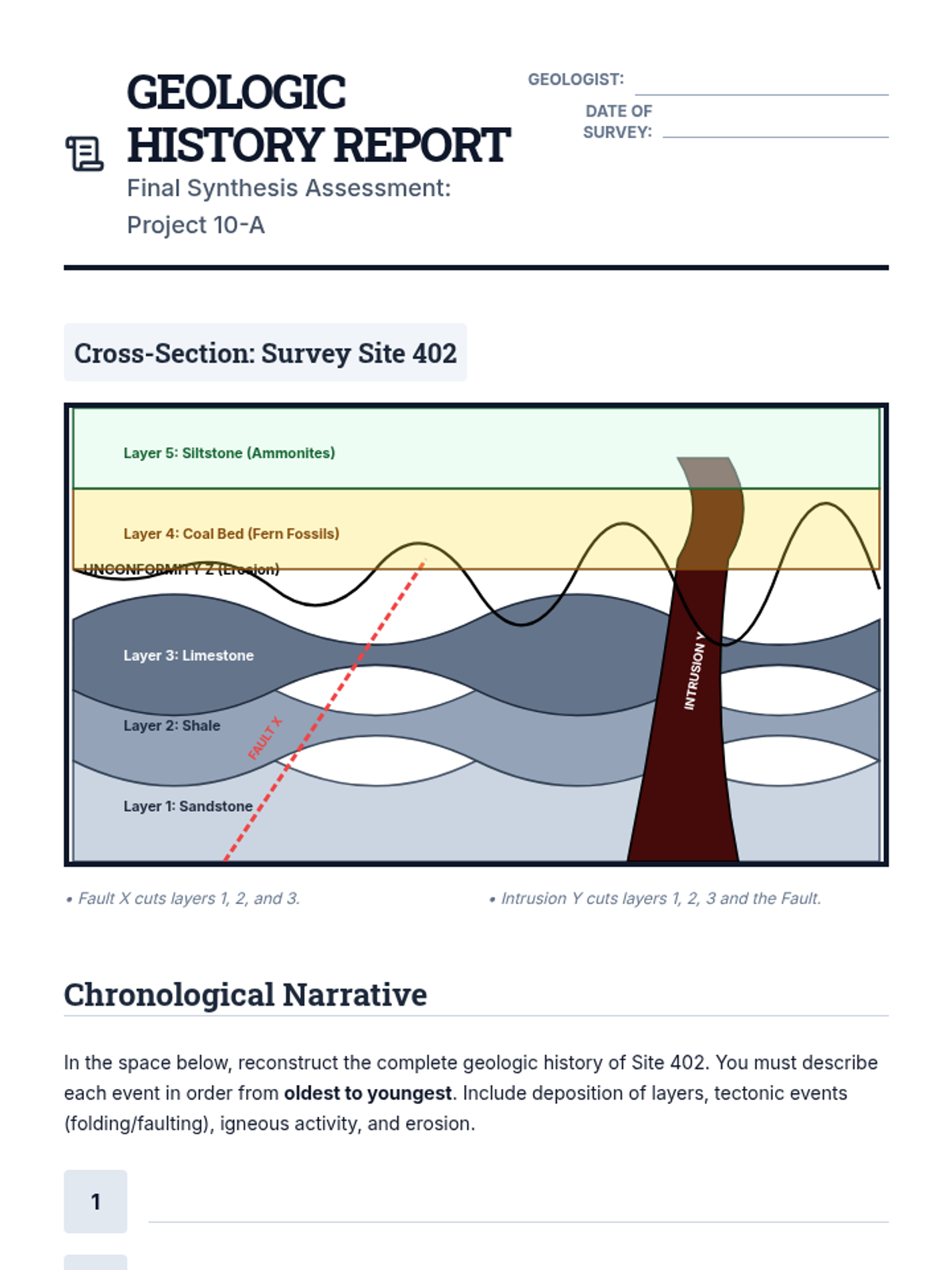 A comprehensive 10th-grade earth science unit where students act as geologists to reconstruct Earth's history. Students master relative and absolute dating, correlate strata using index fossils, and analyze mass extinctions to interpret the narrative of the Geologic Time Scale.