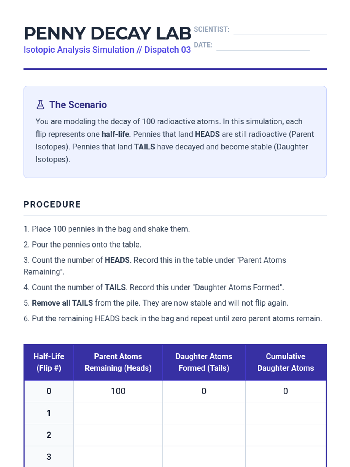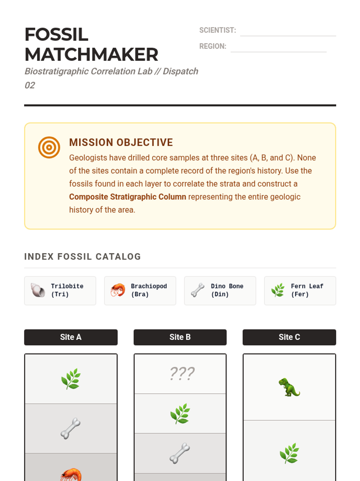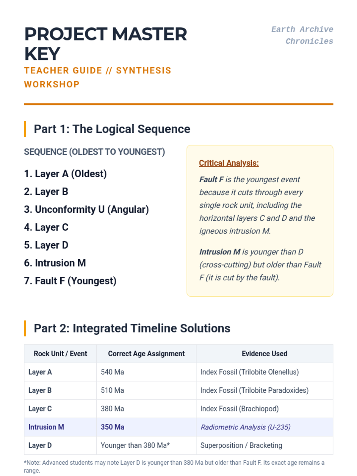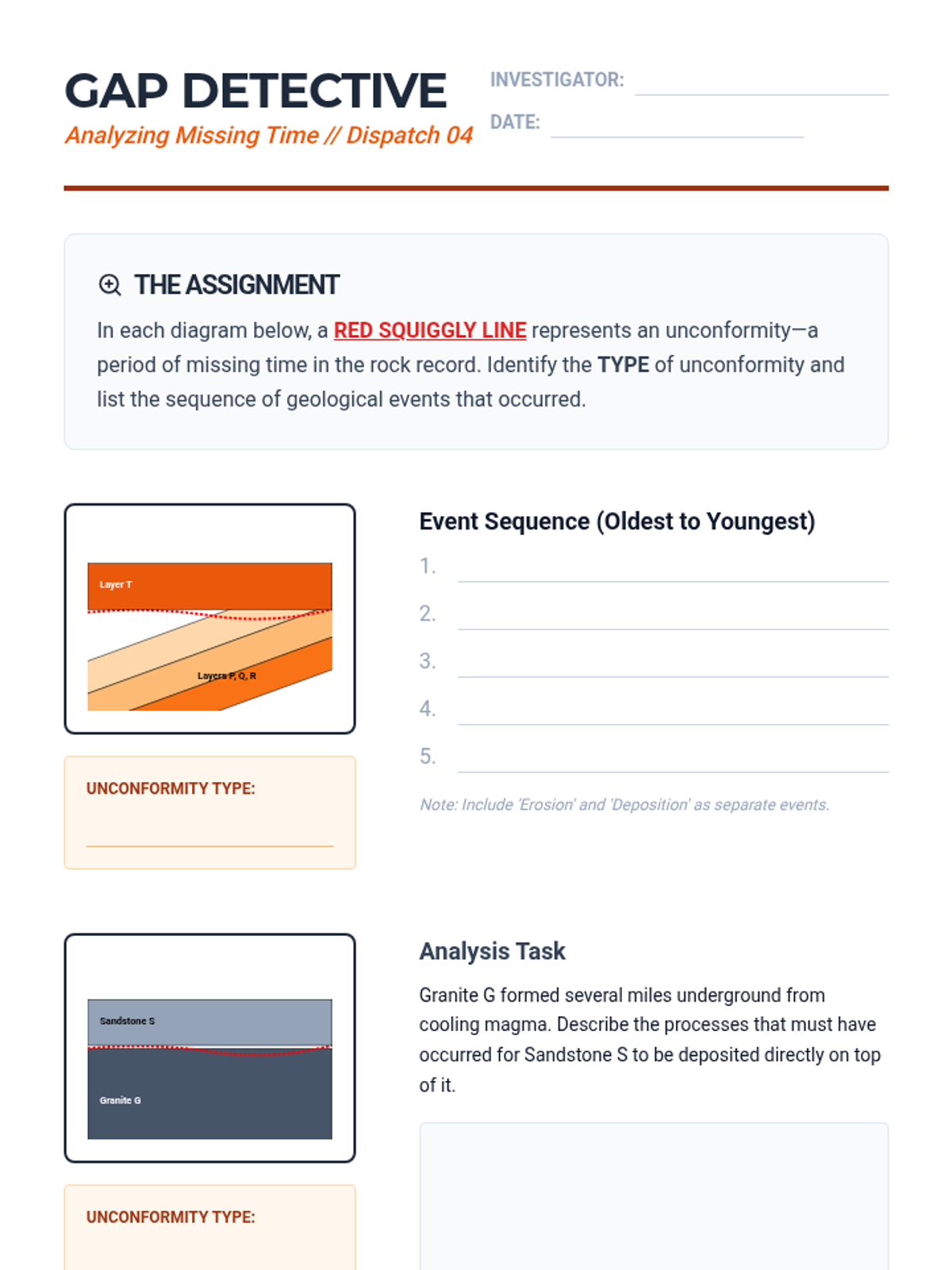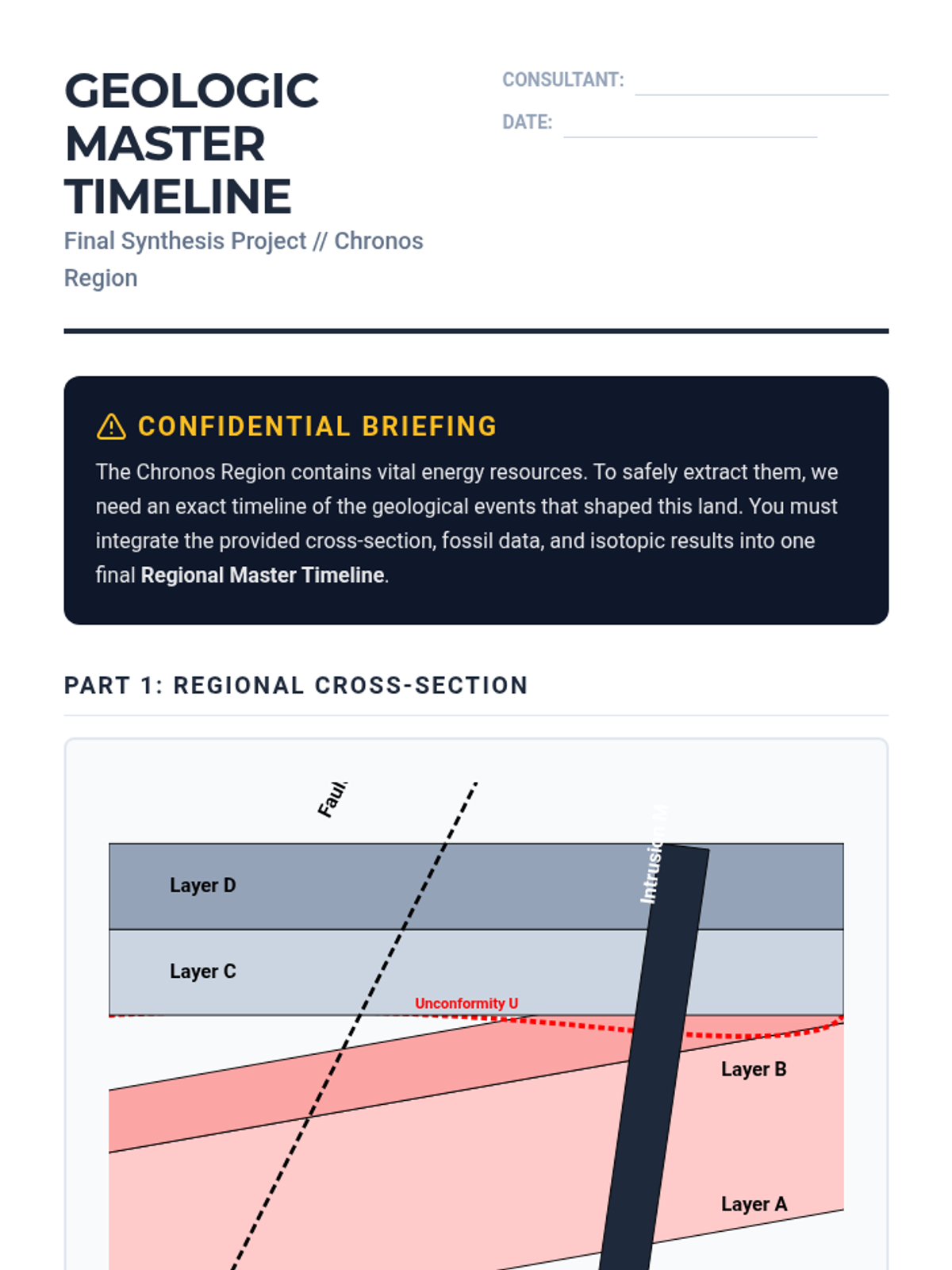 A comprehensive 5-lesson sequence on stratigraphy and geochronology, moving from qualitative relative dating to quantitative radiometric analysis. Students act as geological detectives to reconstruct Earth's history using Steno's laws, index fossils, and radioactive decay.