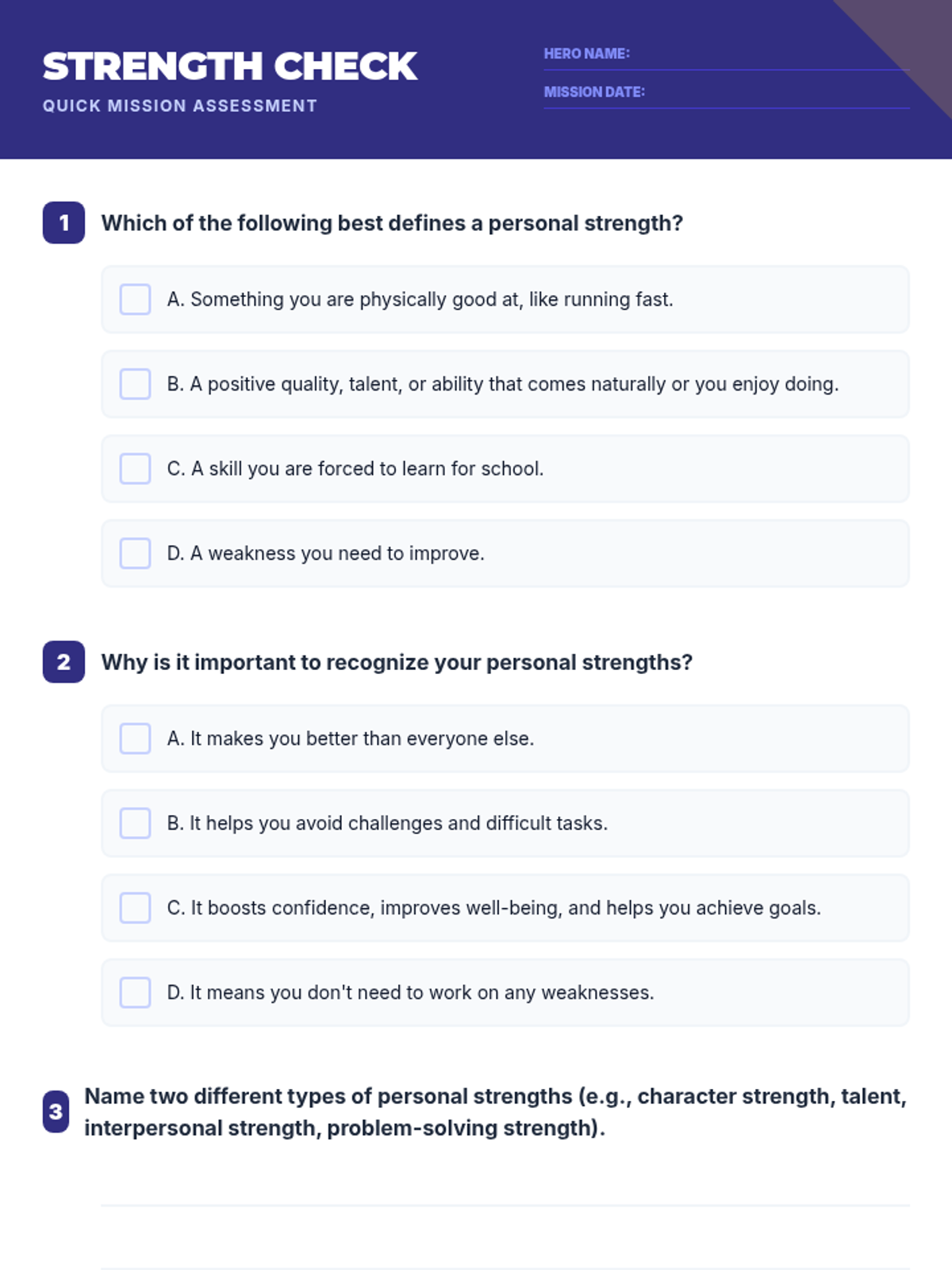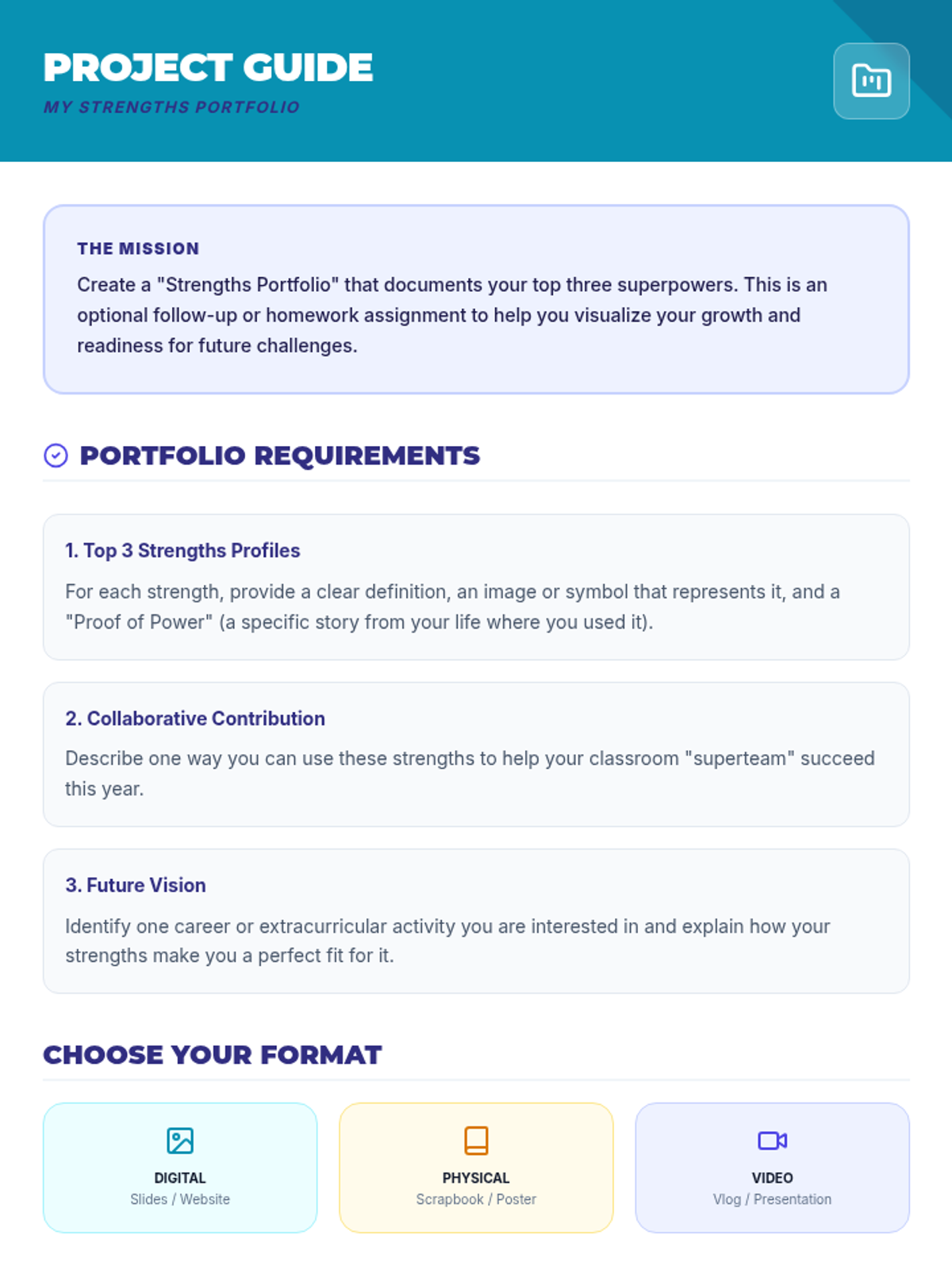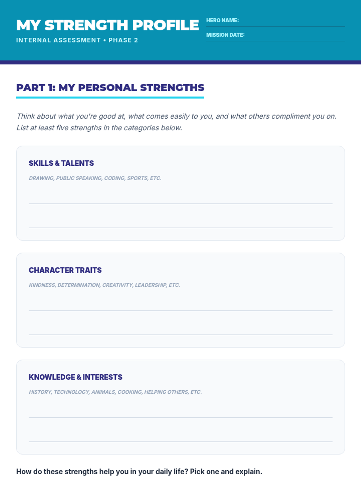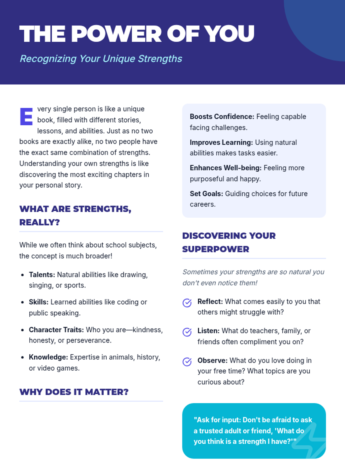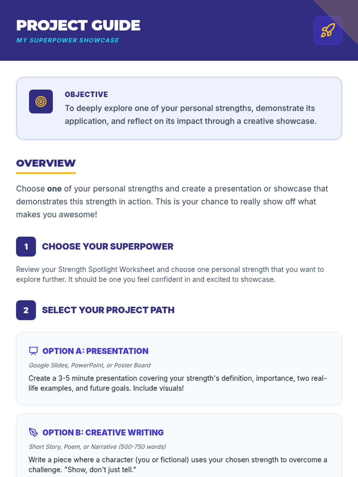 A comprehensive high school sequence focused on helping students identify, understand, and apply their personal strengths to foster self-awareness and confidence. Students explore their unique superpowers through interactive activities, reflections, and creative projects.