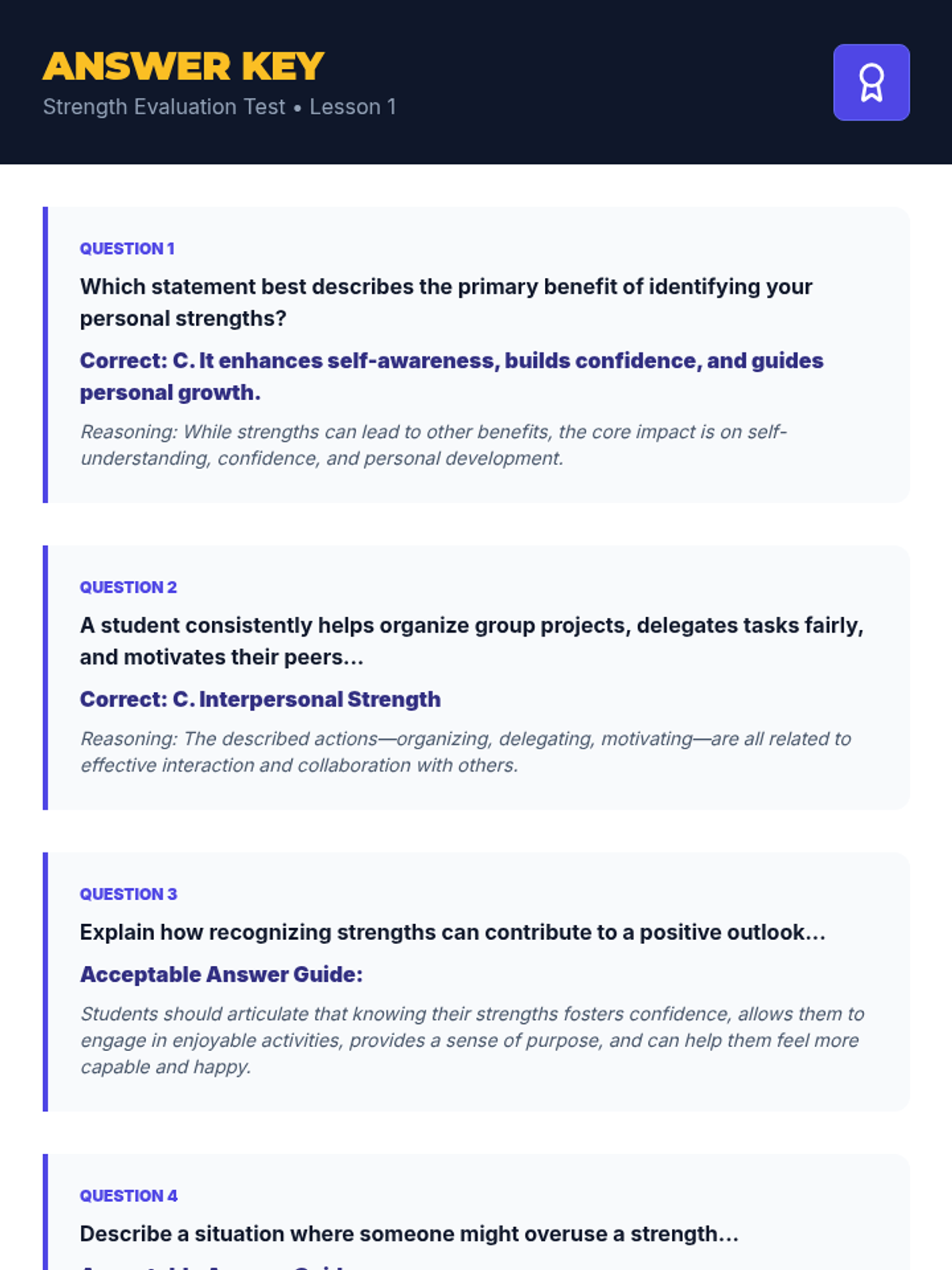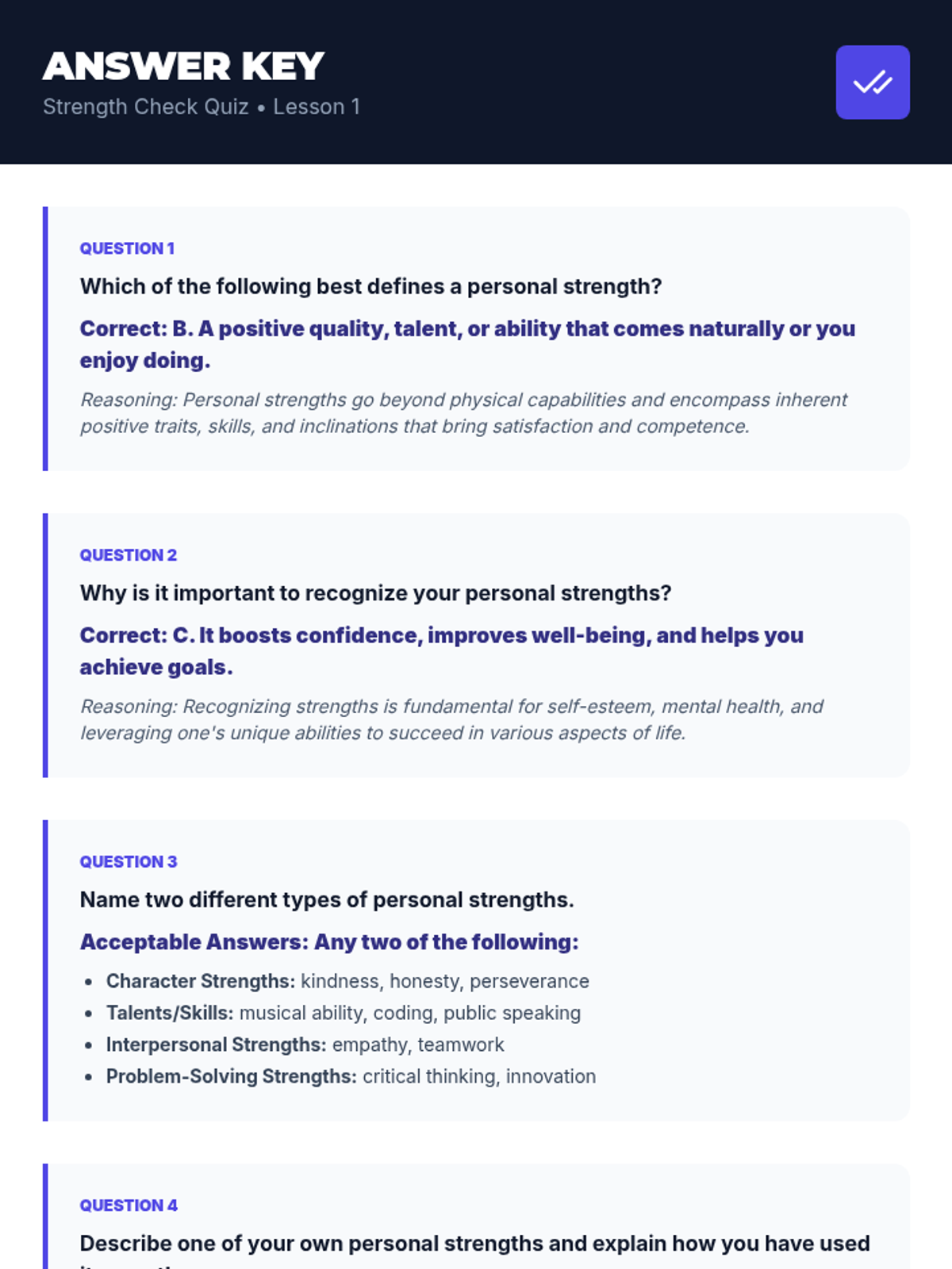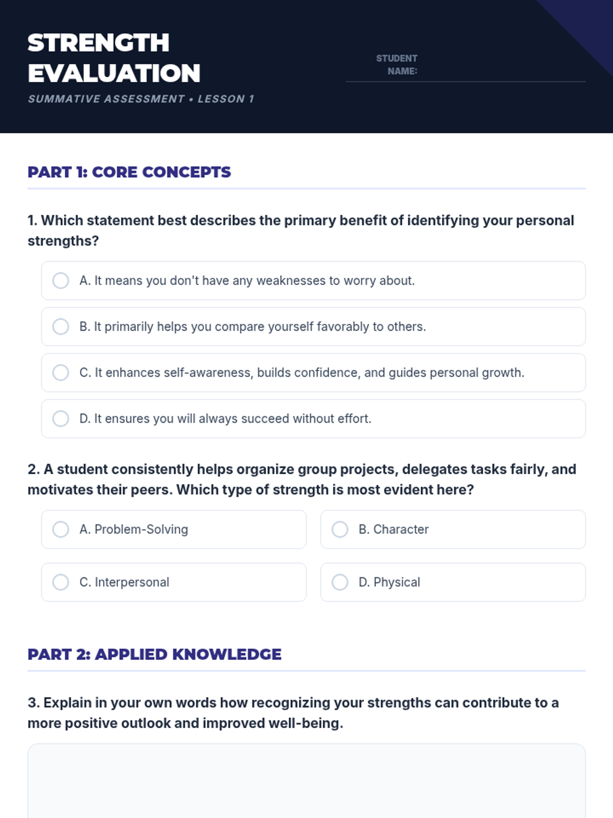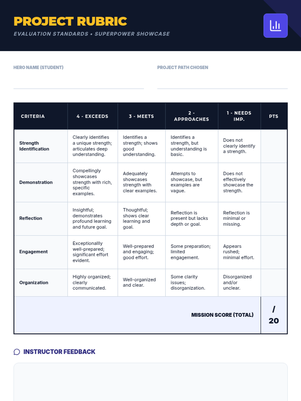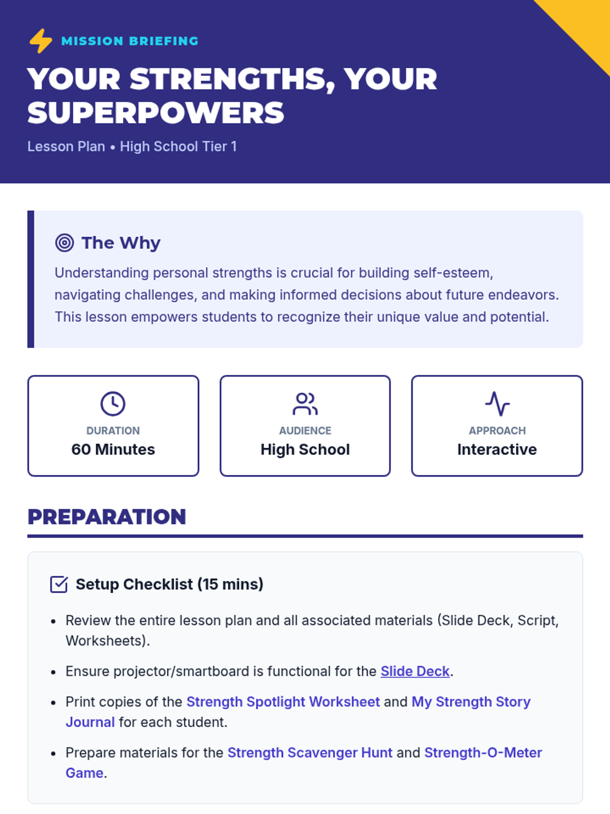 A comprehensive high school sequence focused on helping students identify, understand, and apply their personal strengths to foster self-awareness and confidence. Students explore their unique superpowers through interactive activities, reflections, and creative projects.