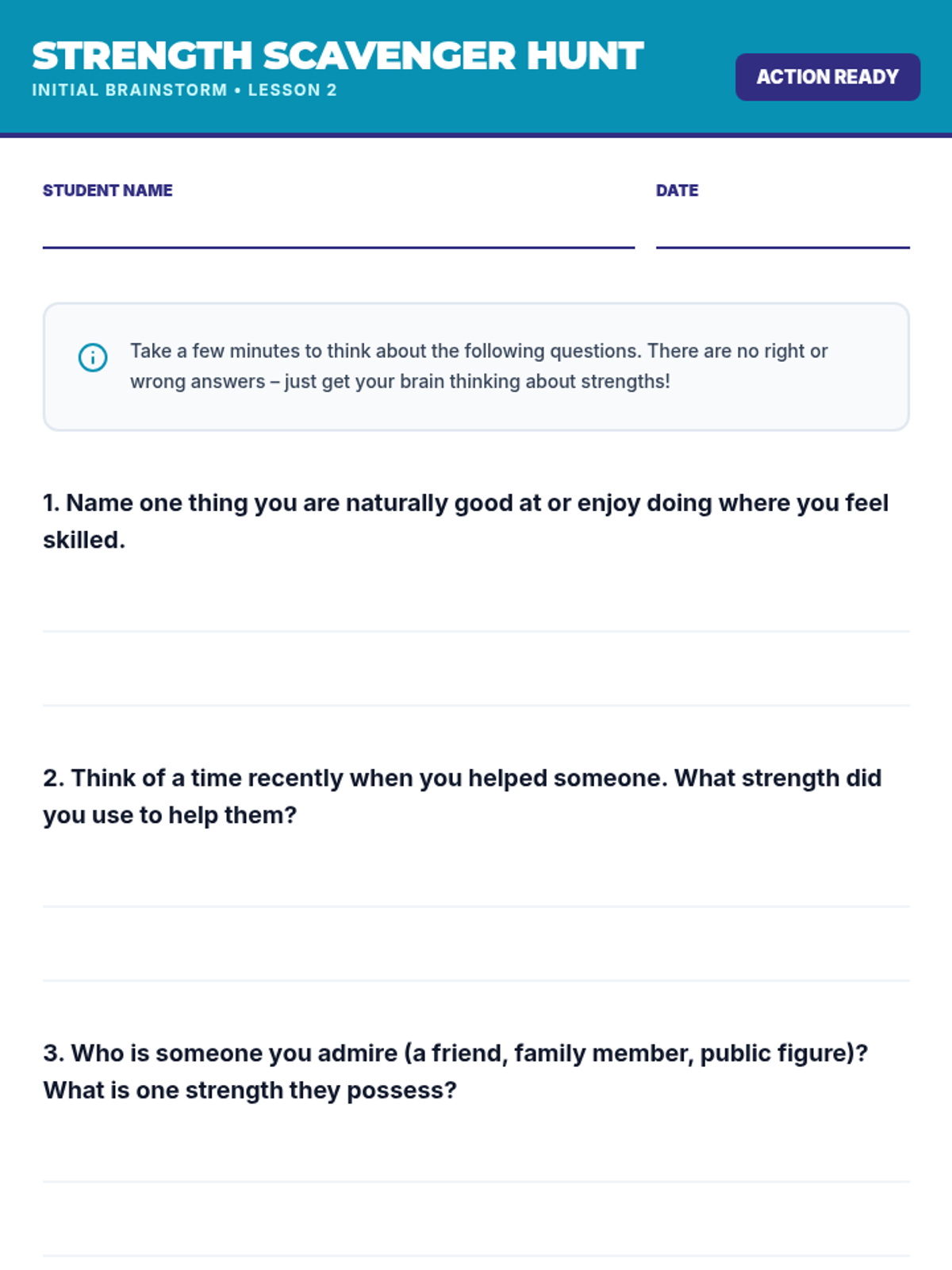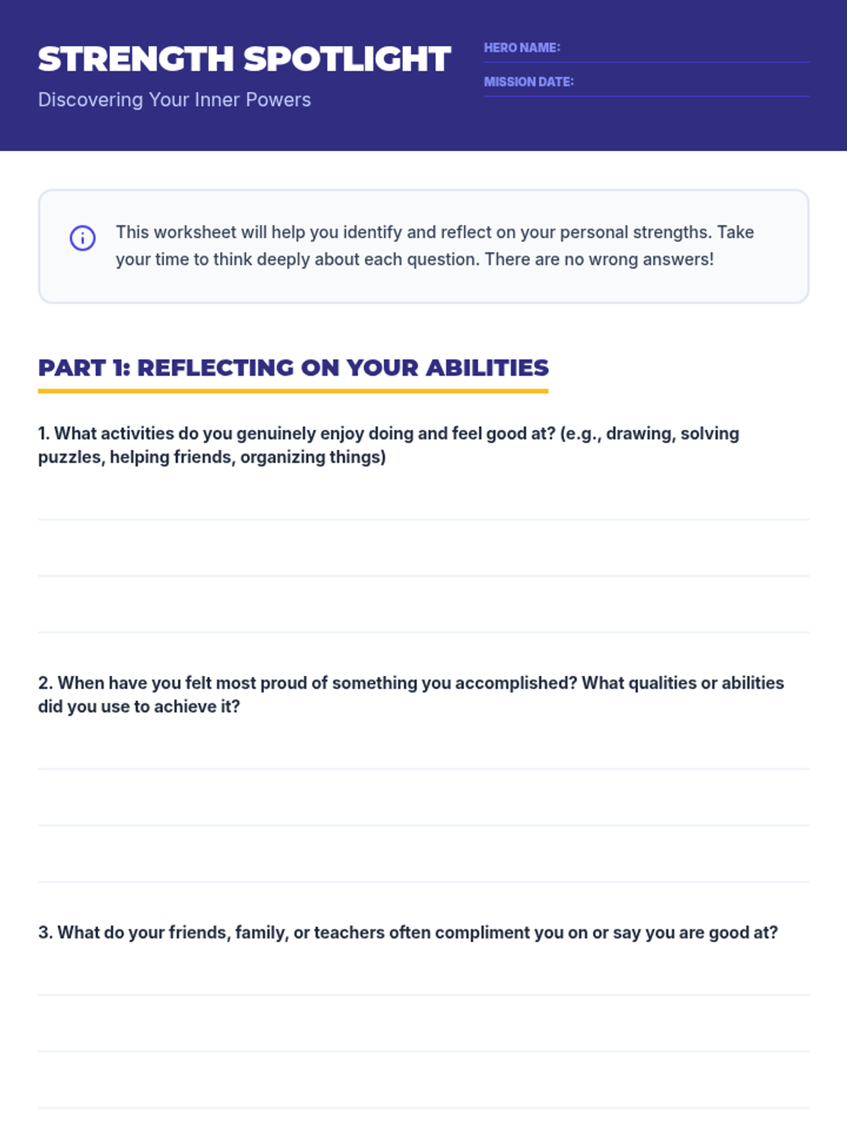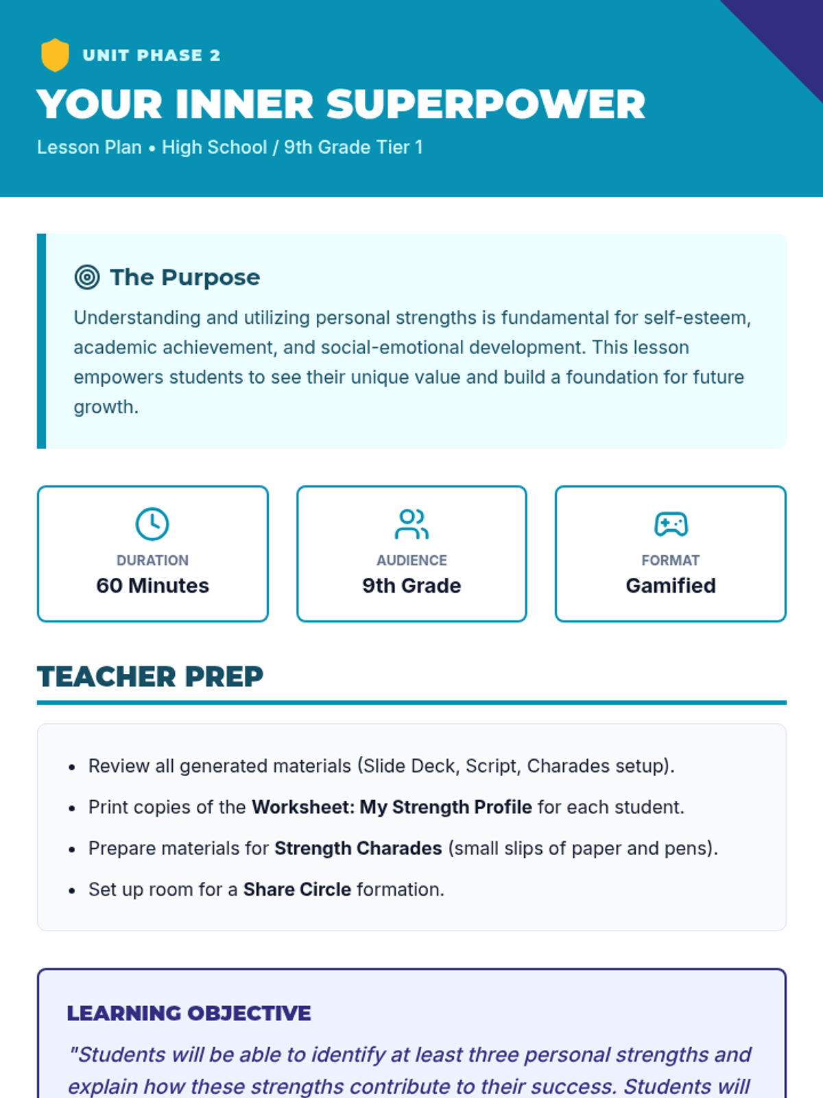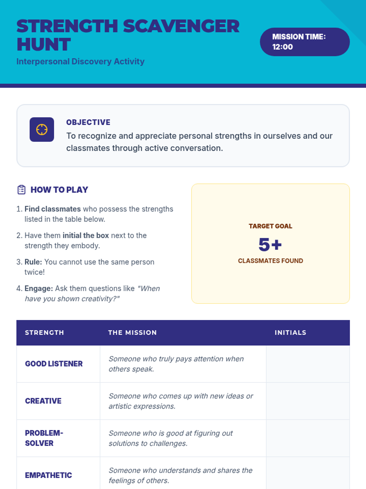 A comprehensive high school sequence focused on helping students identify, understand, and apply their personal strengths to foster self-awareness and confidence. Students explore their unique superpowers through interactive activities, reflections, and creative projects.