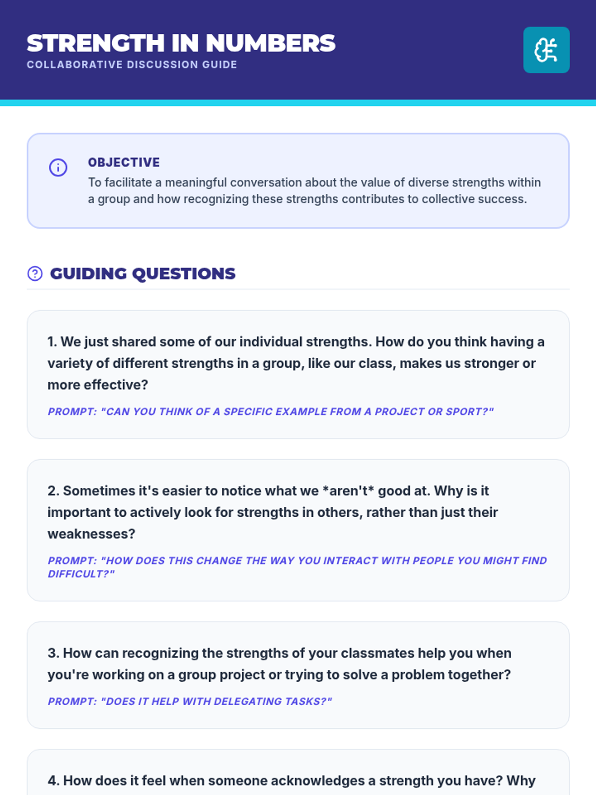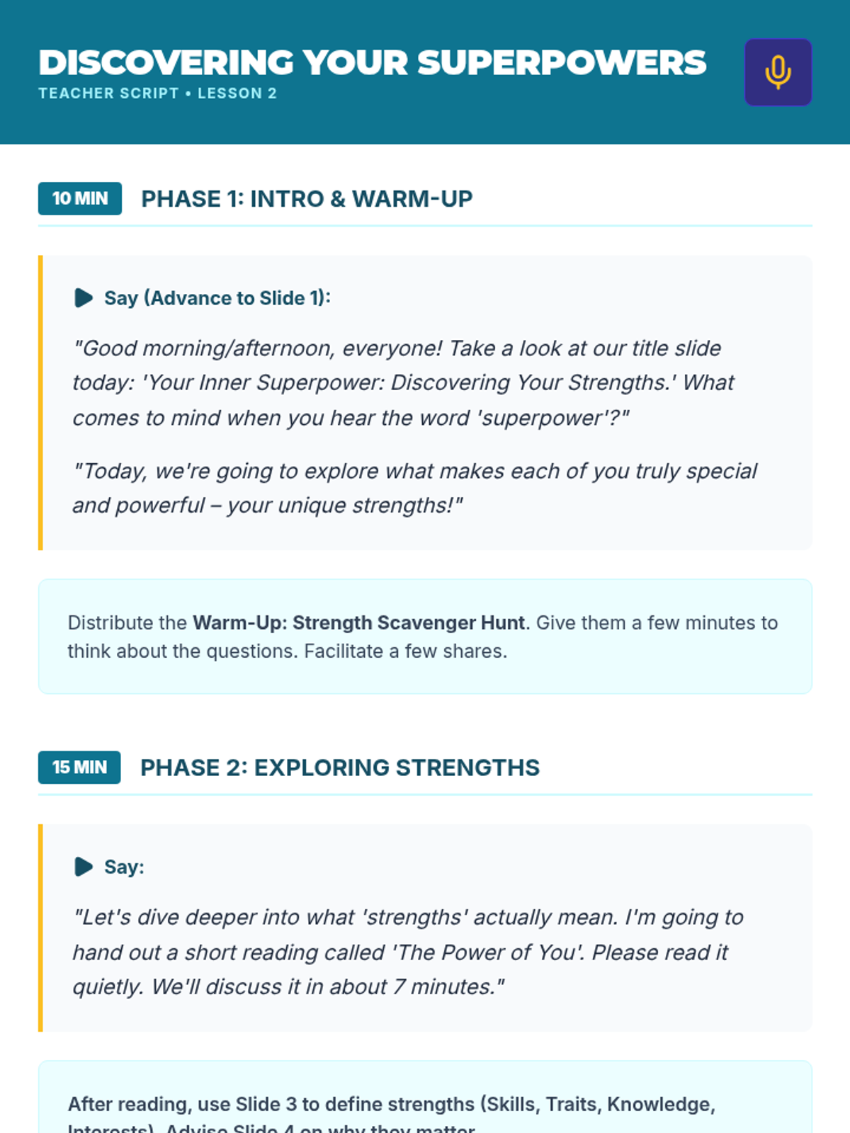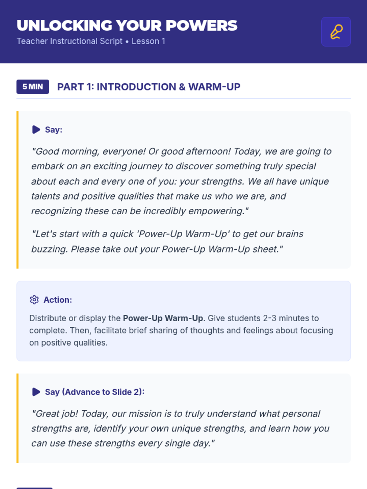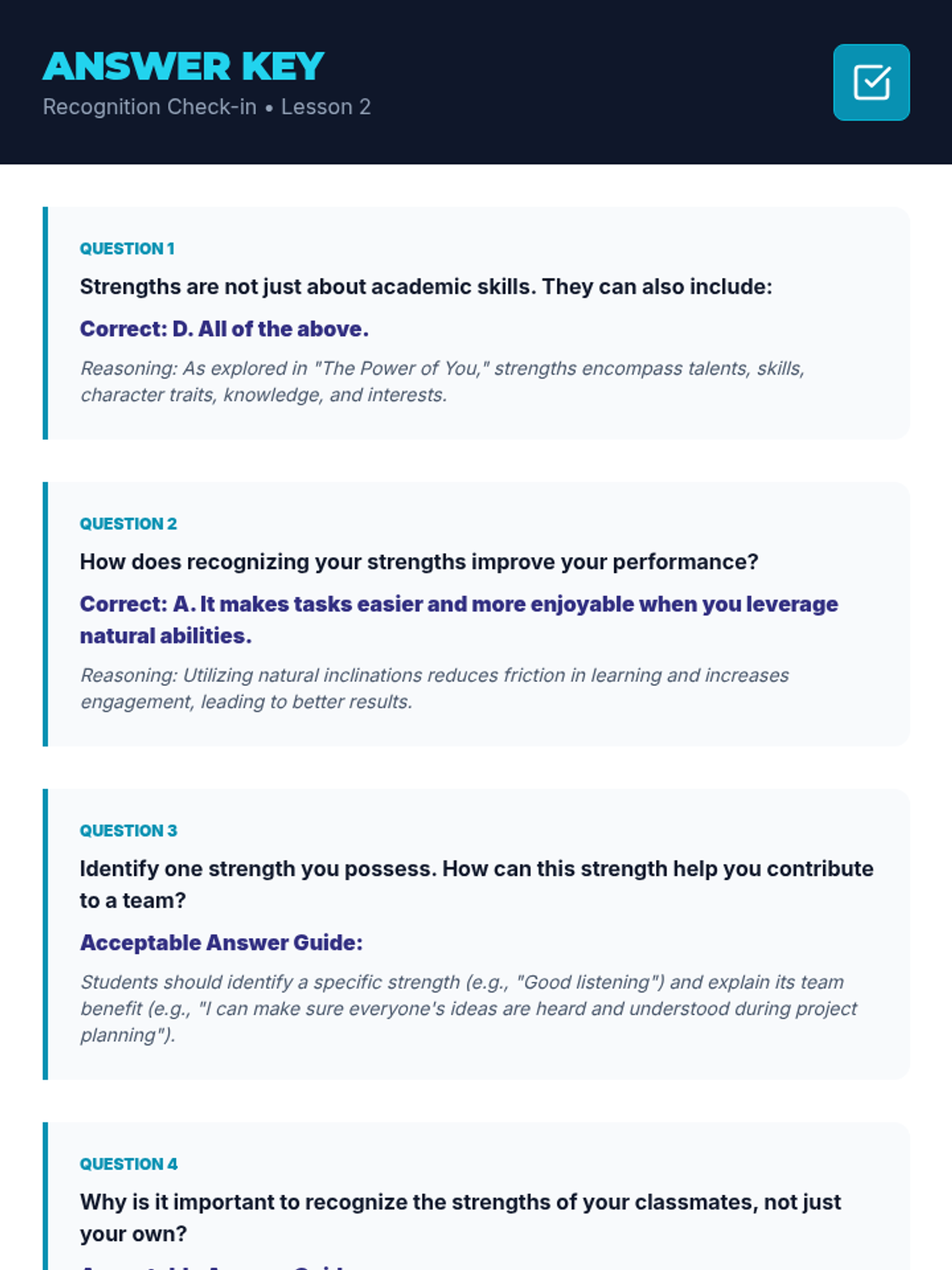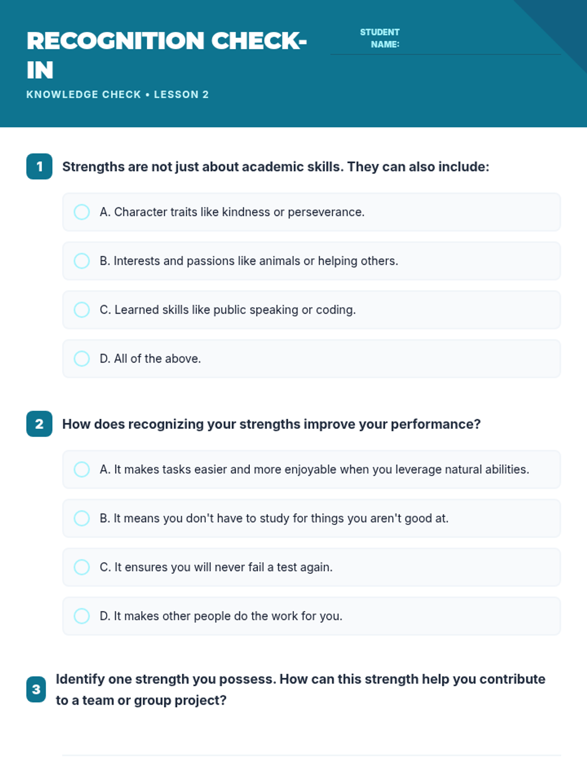 A comprehensive high school sequence focused on helping students identify, understand, and apply their personal strengths to foster self-awareness and confidence. Students explore their unique superpowers through interactive activities, reflections, and creative projects.