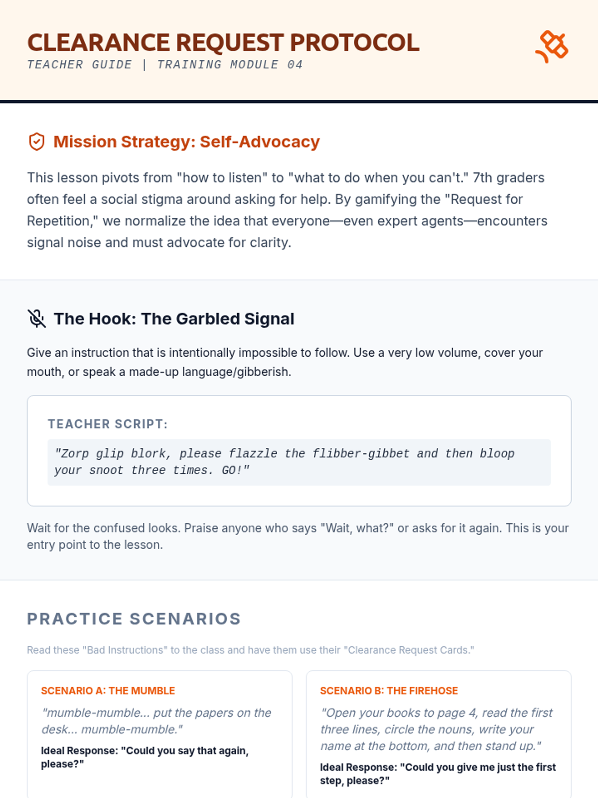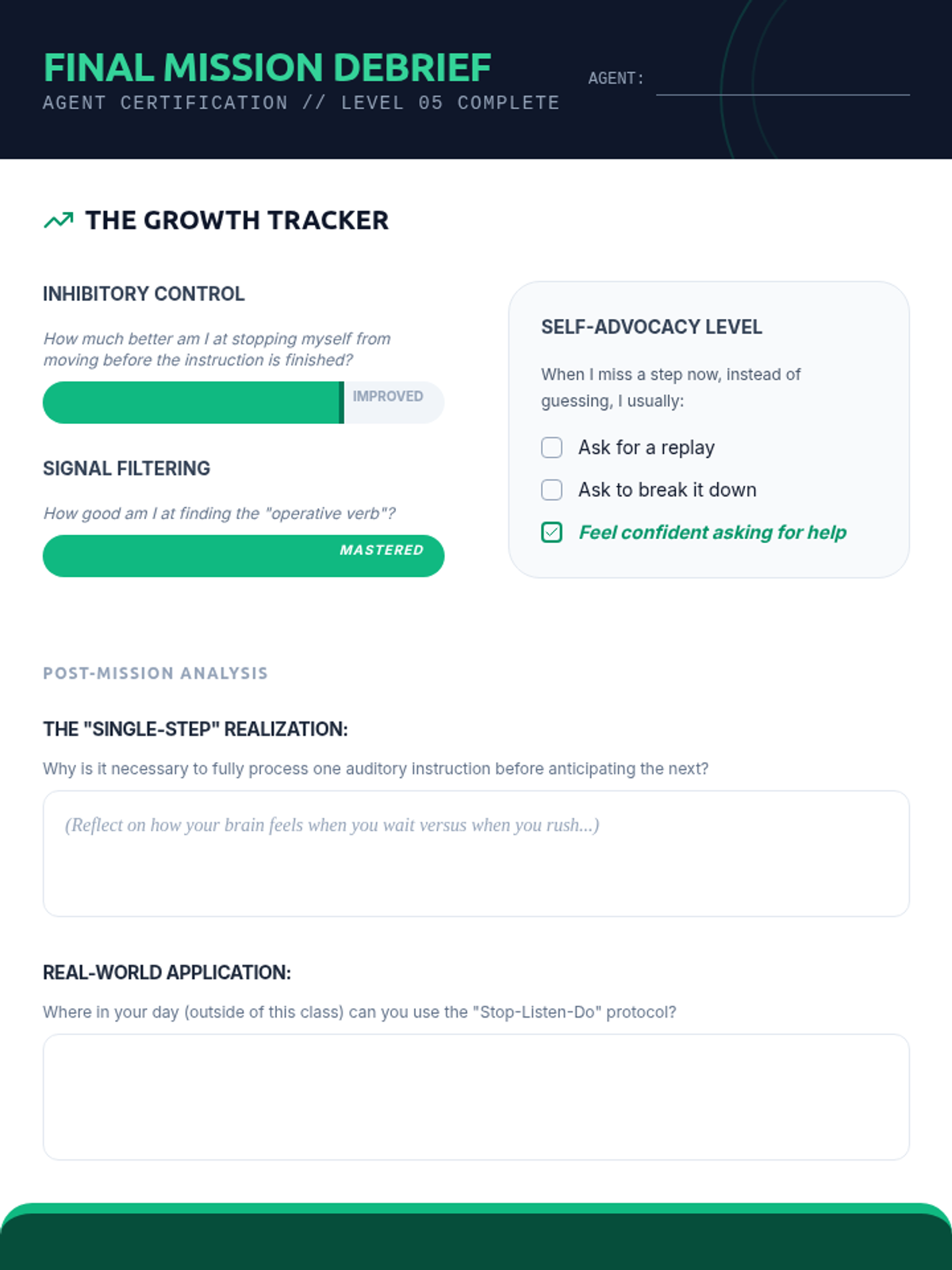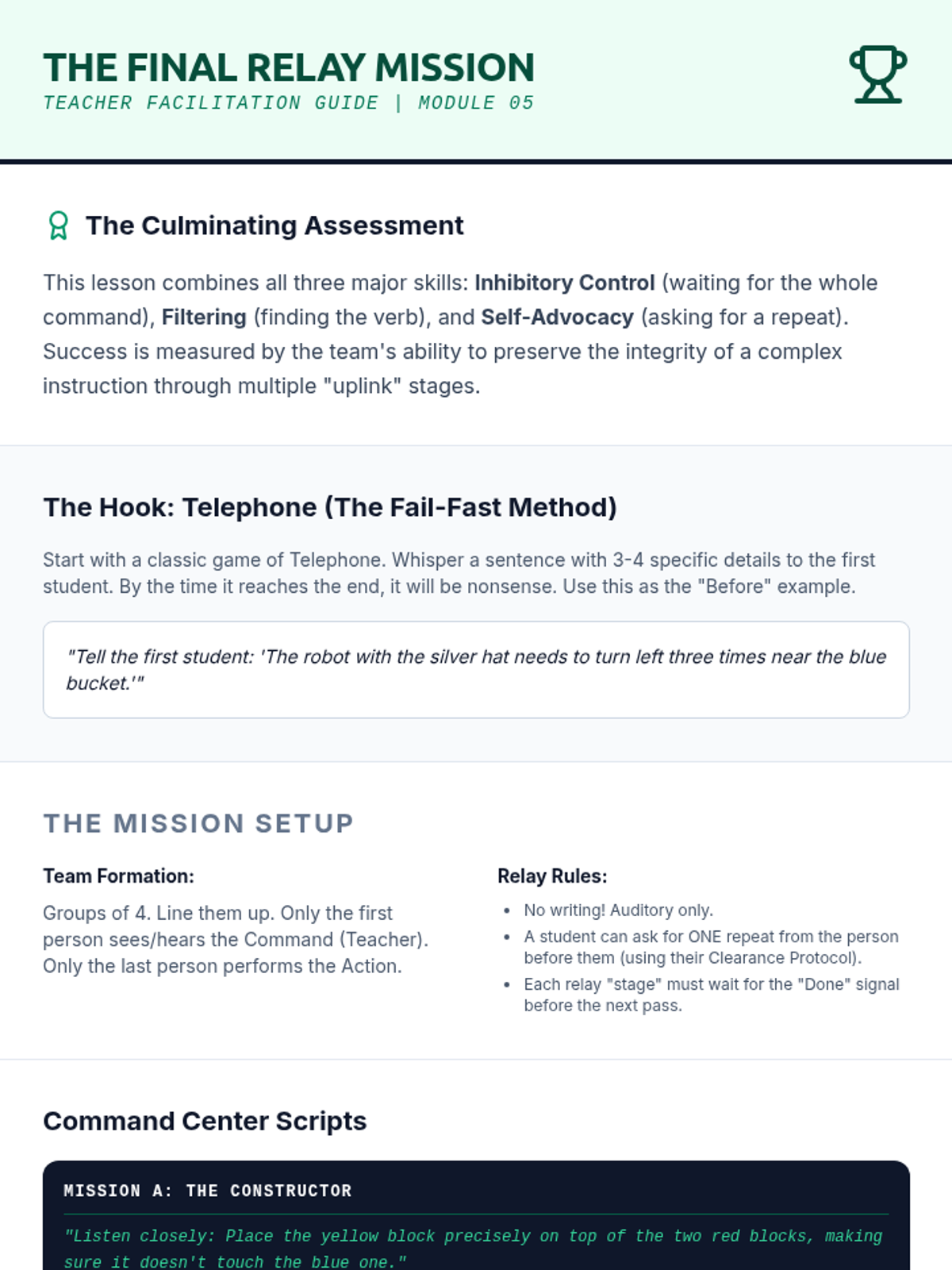 A 5-lesson series designed for 7th-grade students to build auditory working memory and inhibitory control. Students progress through gamified challenges that emphasize processing single-step directions, filtering verbal information, and advocating for clarity.