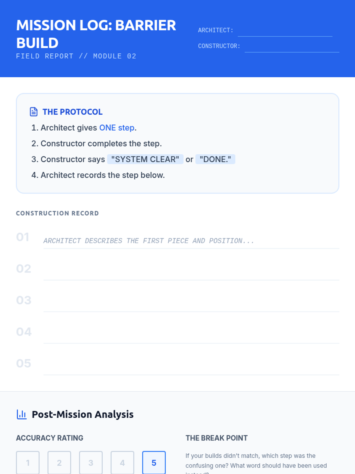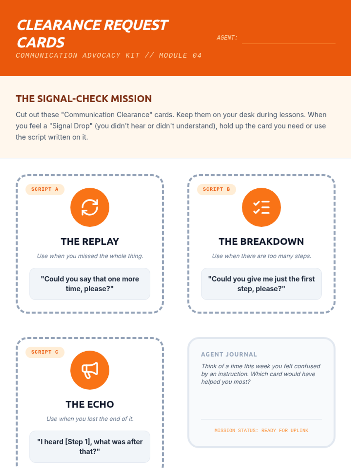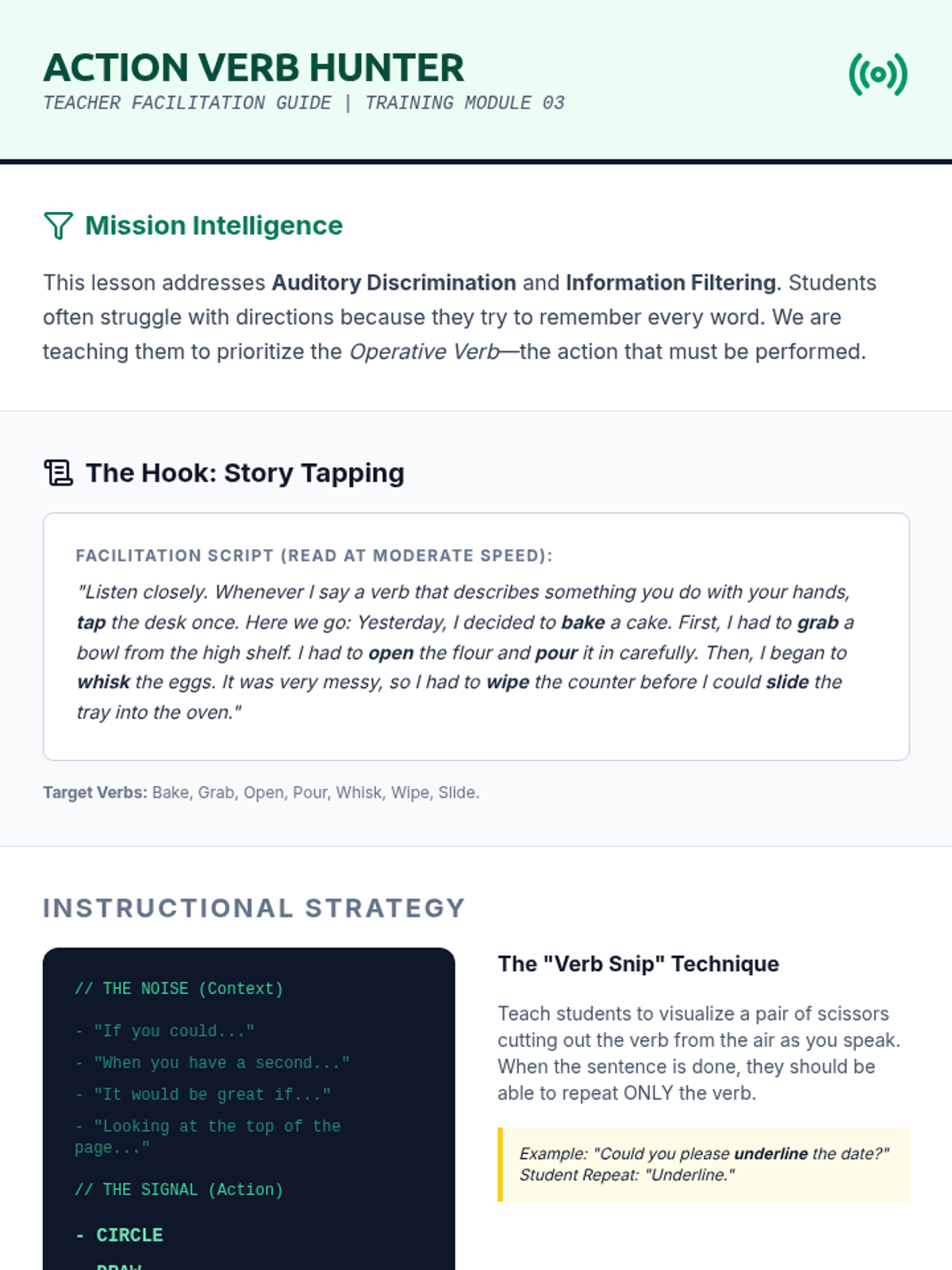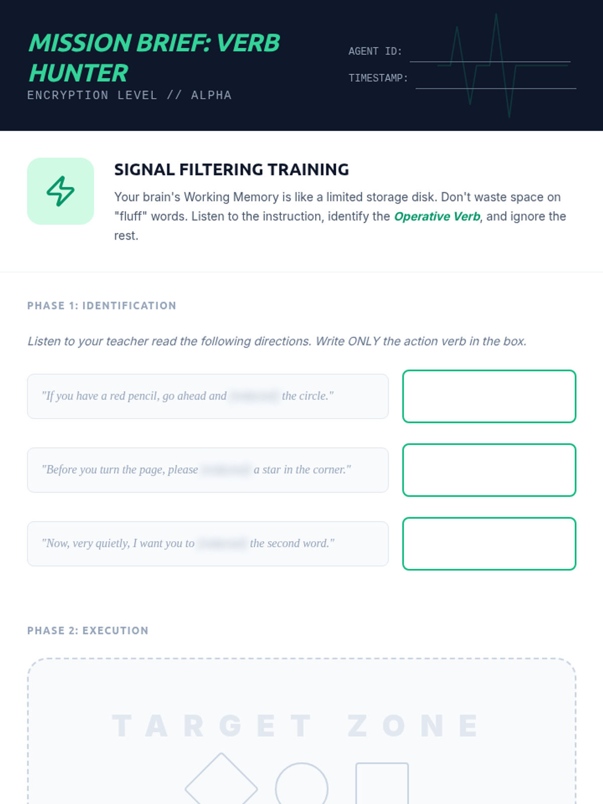A 5-lesson series designed for 7th-grade students to build auditory working memory and inhibitory control. Students progress through gamified challenges that emphasize processing single-step directions, filtering verbal information, and advocating for clarity.