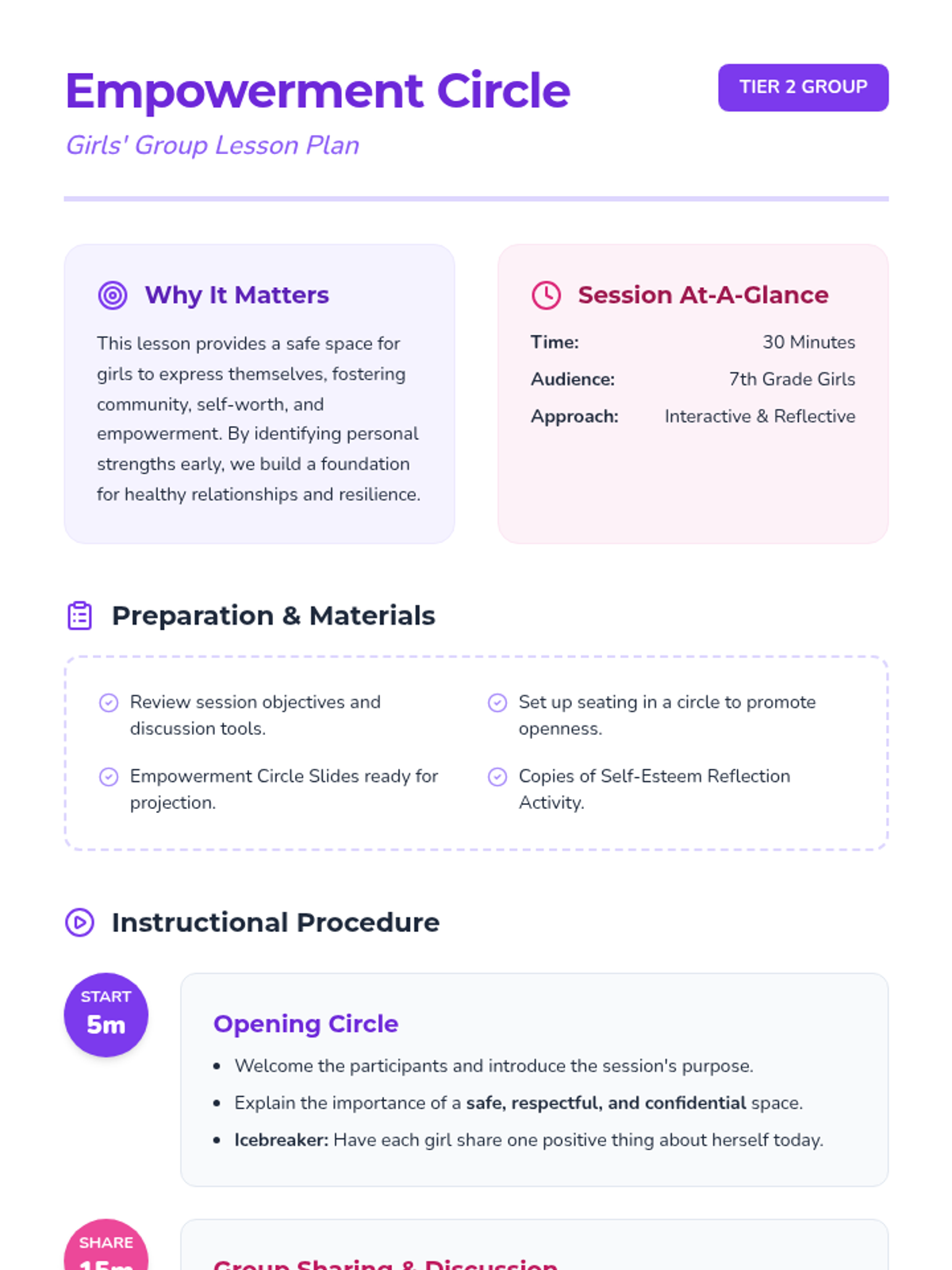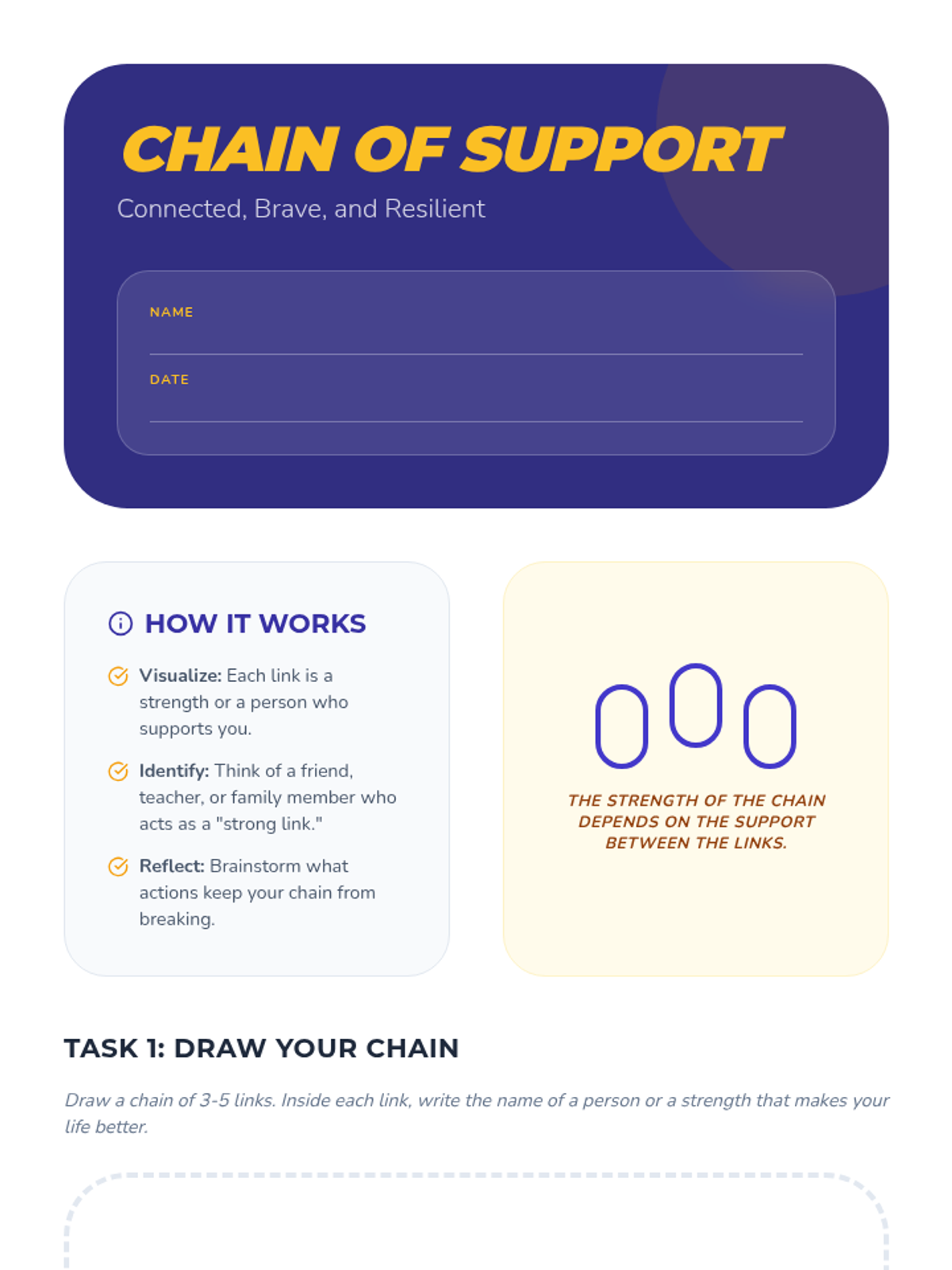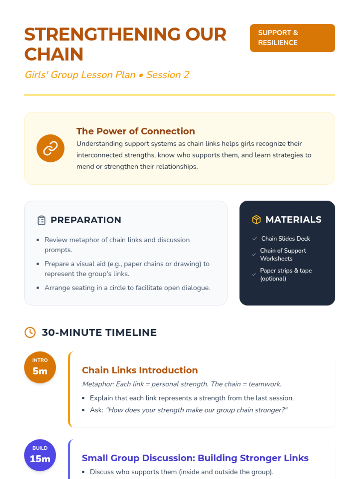 A two-session sequence for 7th-grade girls focused on building self-esteem and exploring support systems through the metaphor of a chain. Girls identify personal strengths and learn to cultivate resilient connections within their group.