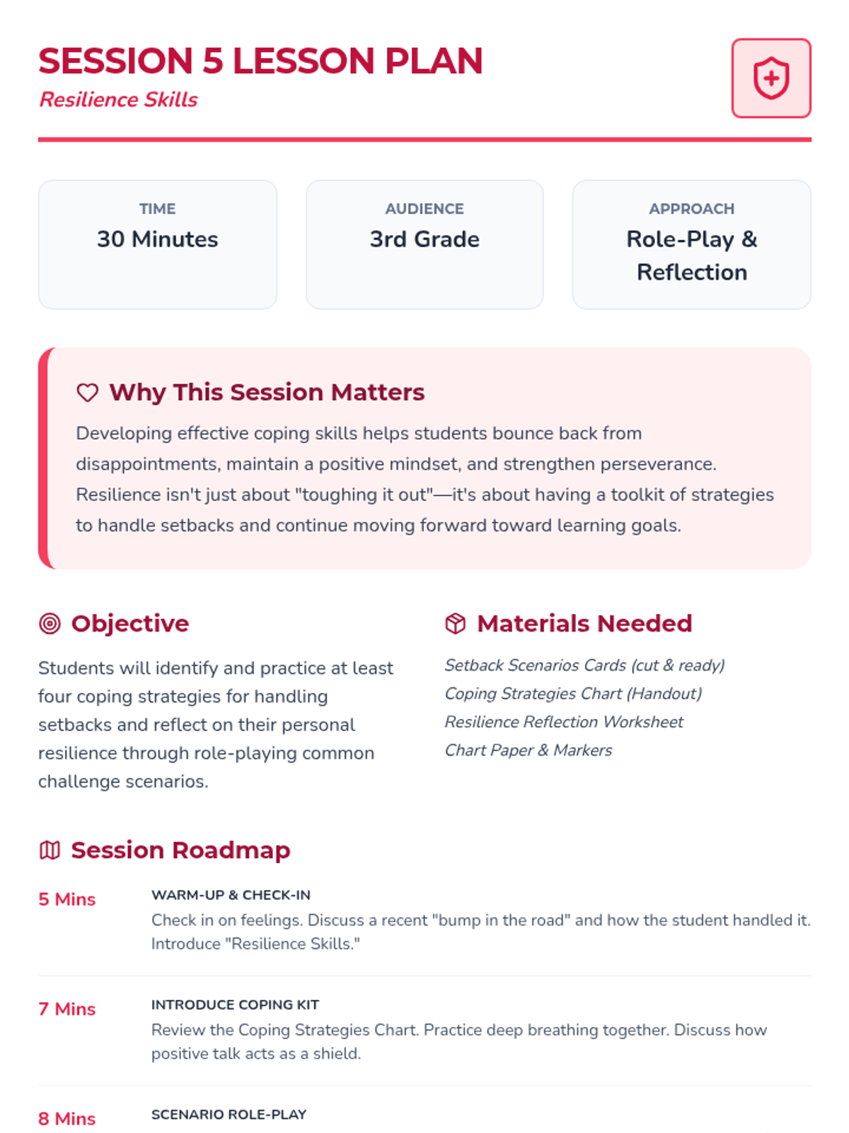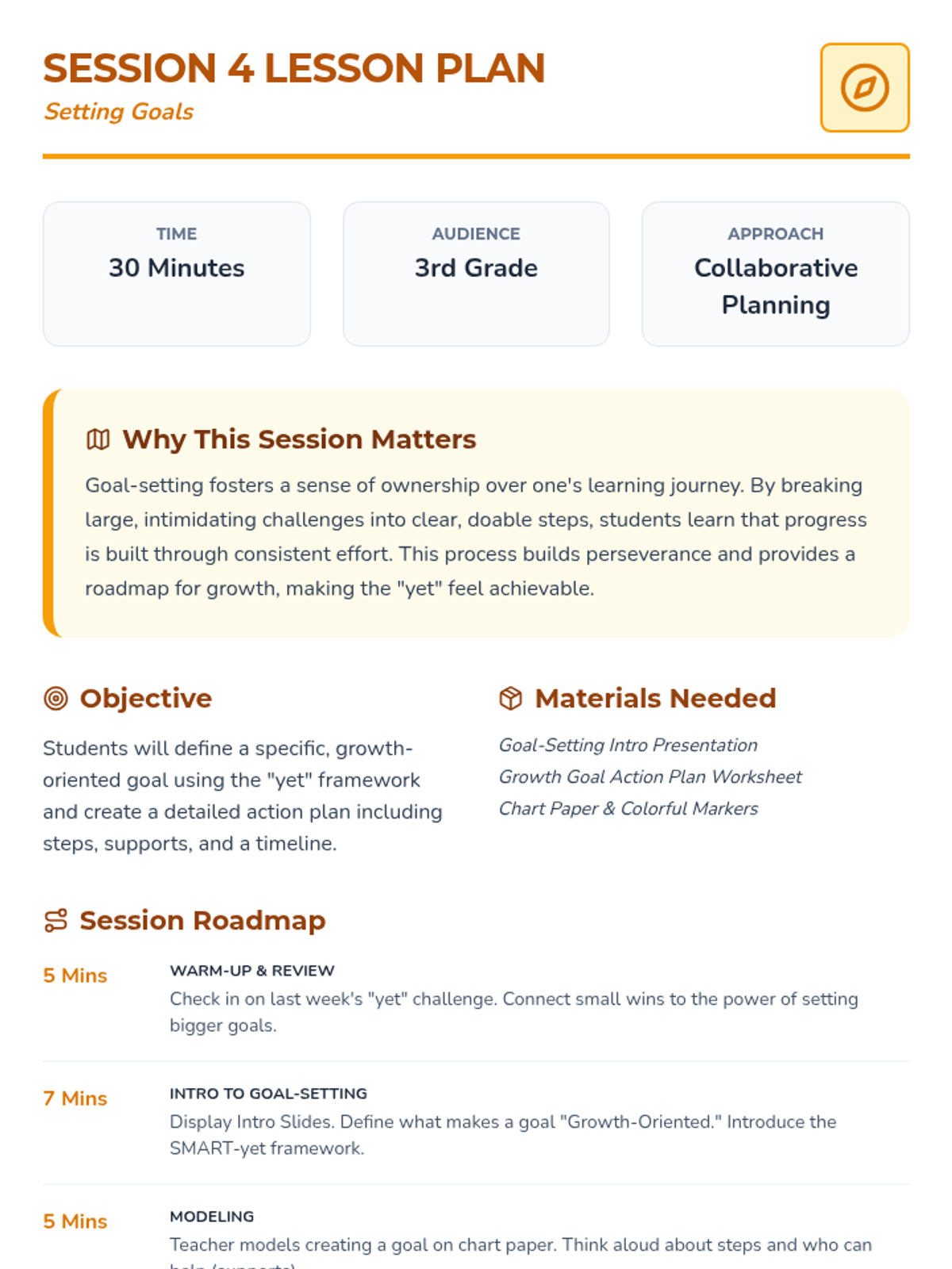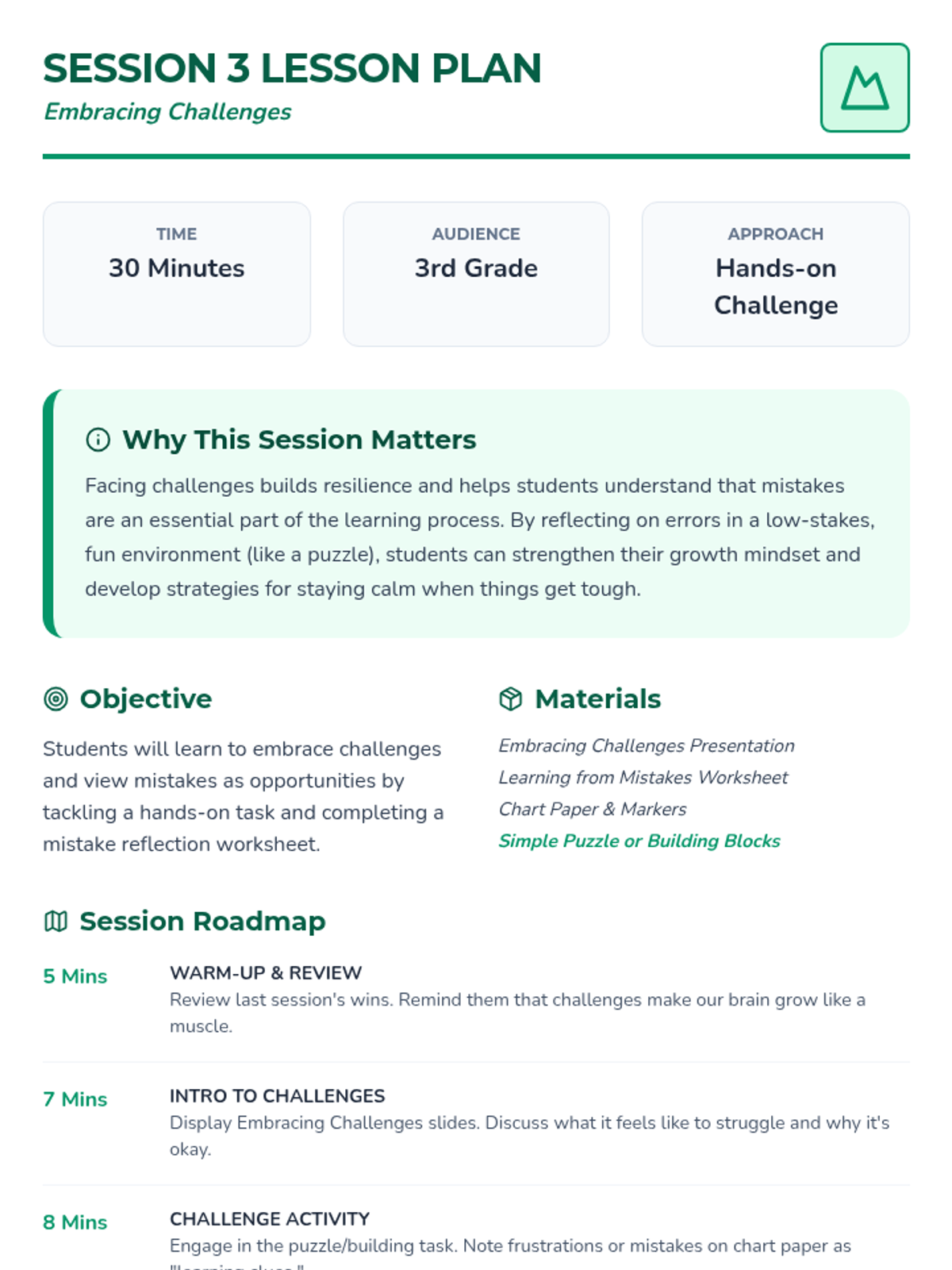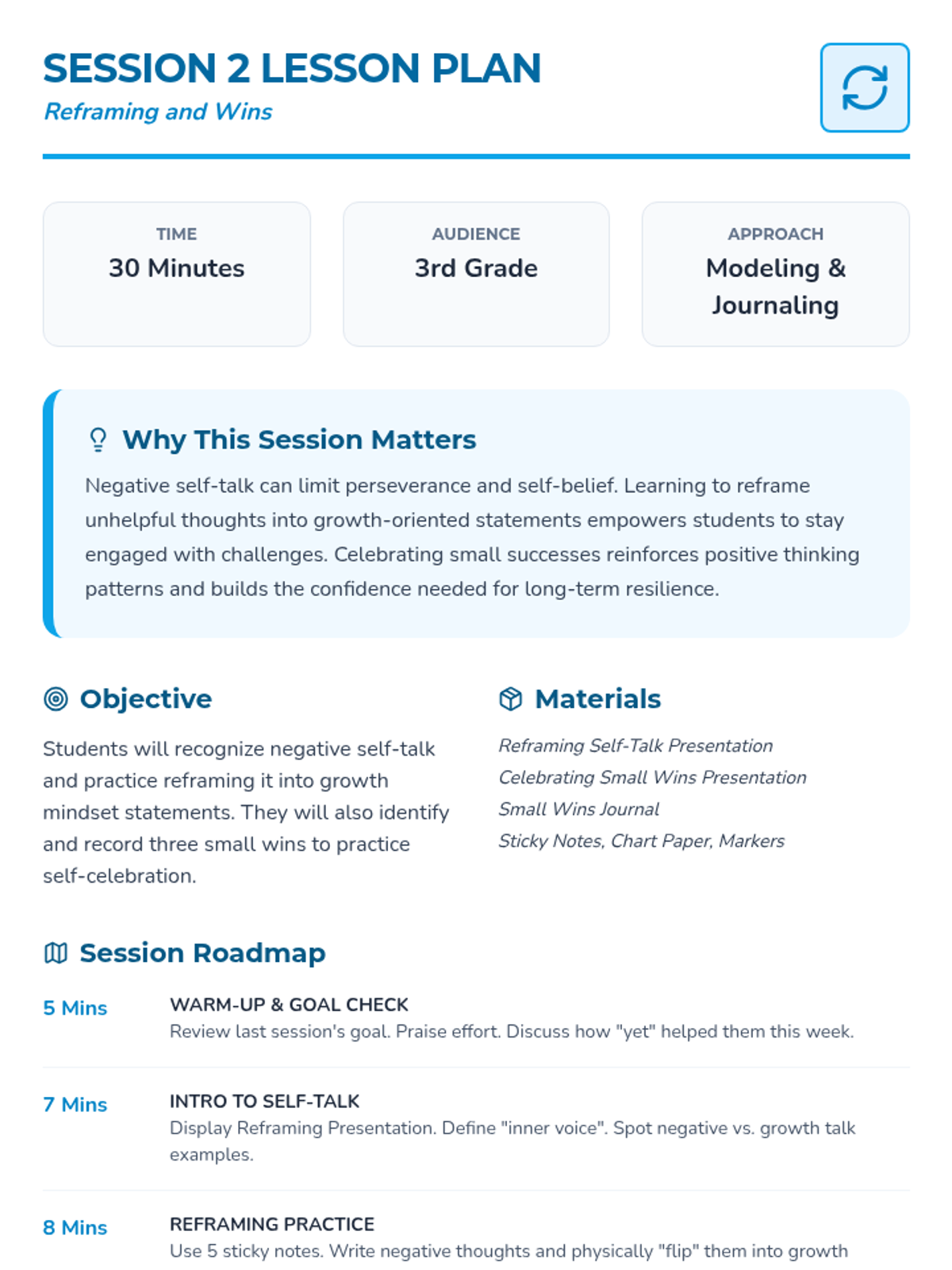 A 12-week Tier 3 individual growth mindset sequence for 3rd graders, focusing on personal strengths, reframing challenges, and building resilience through 30-minute interactive sessions.