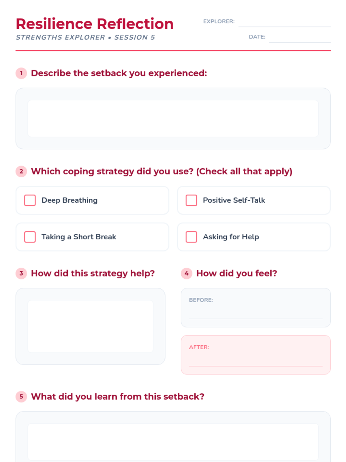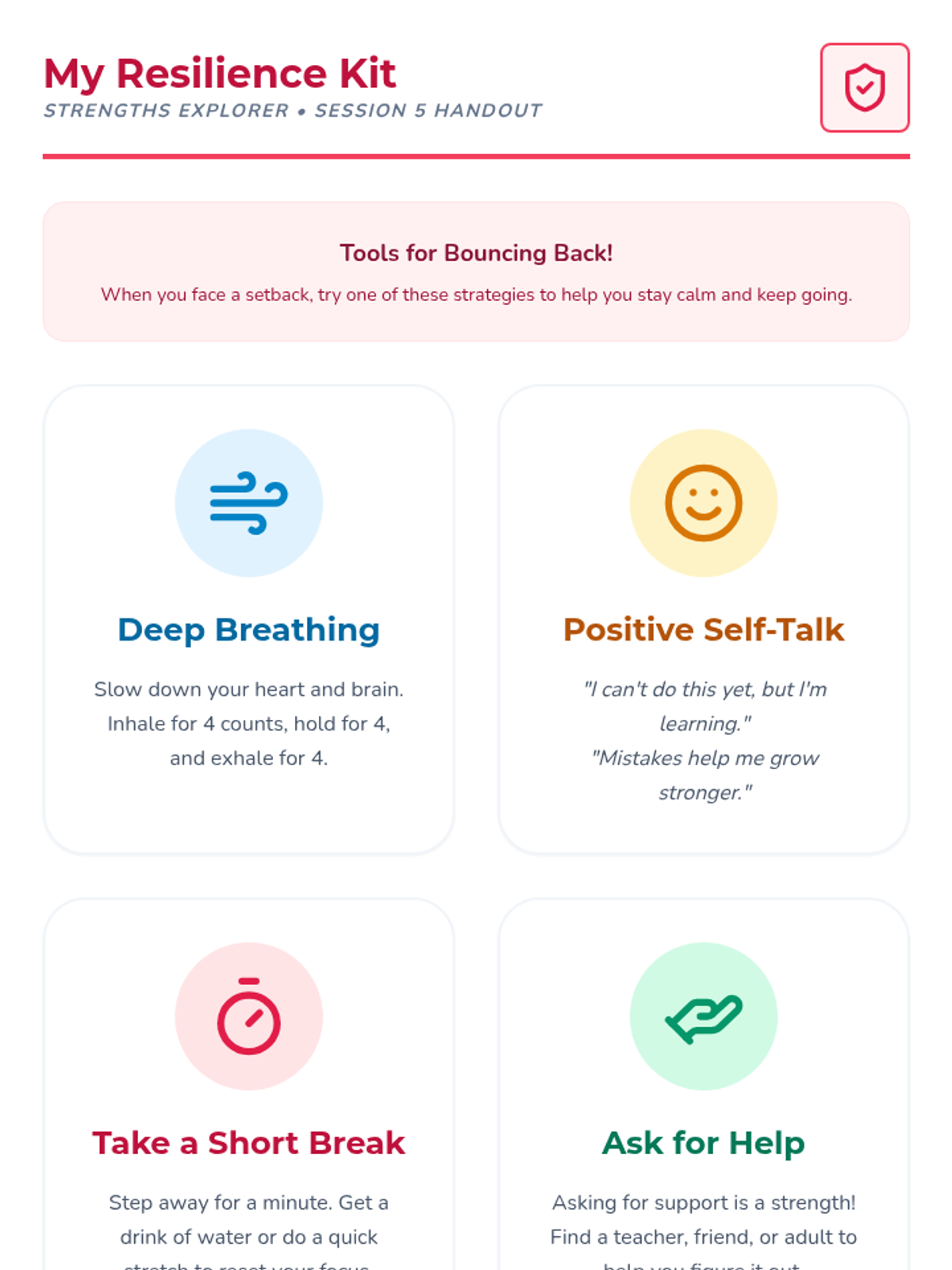 A 12-session emotional intelligence and literacy program designed for K-6 students. Using a 'Trailblazer' theme, Pathfinders develop self-awareness, confidence, and critical decision-making skills to replace impulsive reactions with thoughtful choices. Includes safety scenarios and practical tools for managing exam stress.