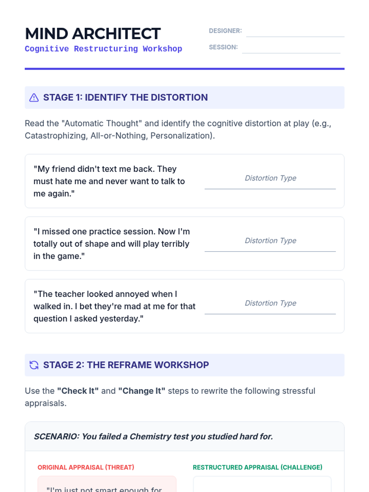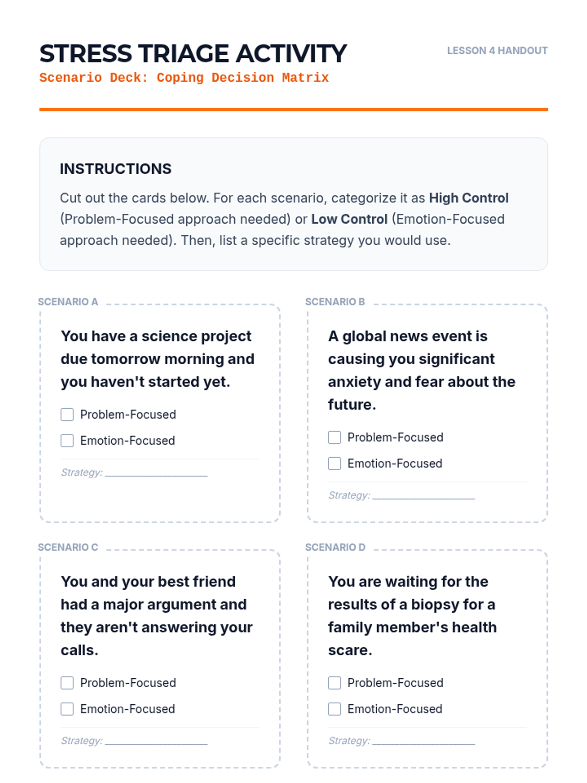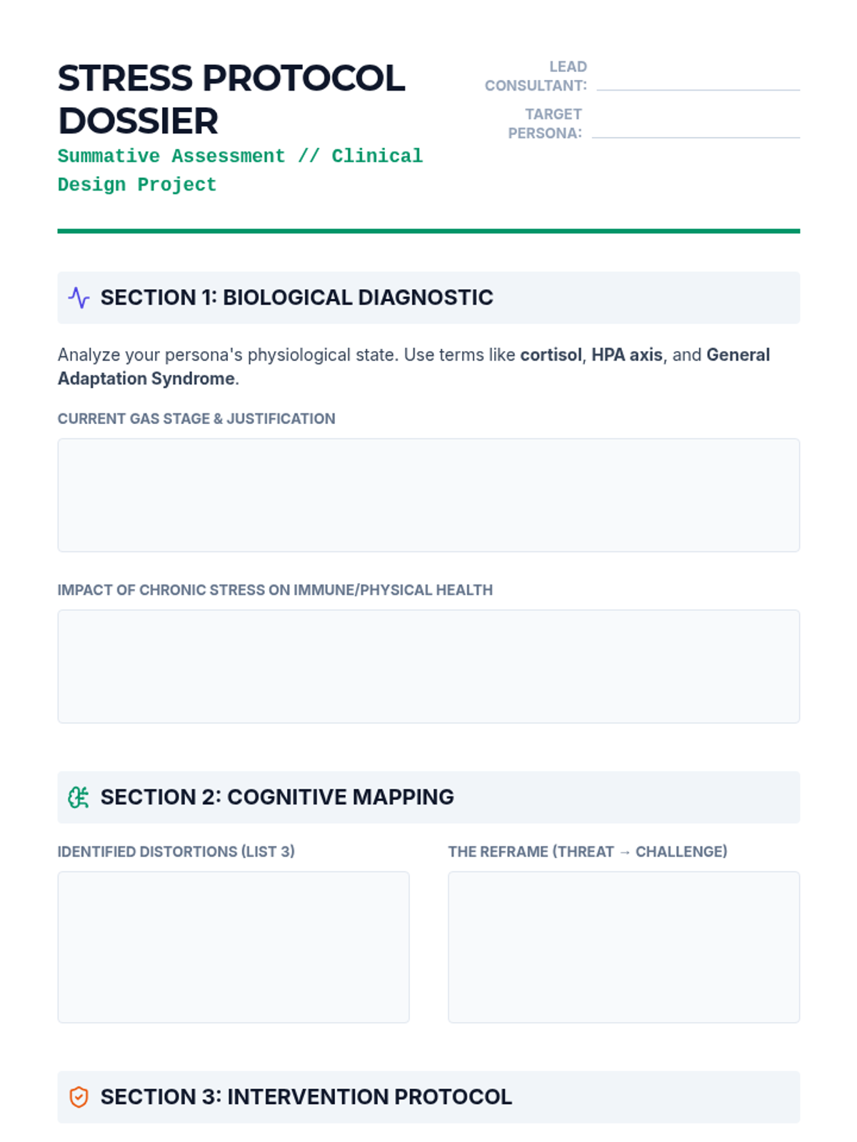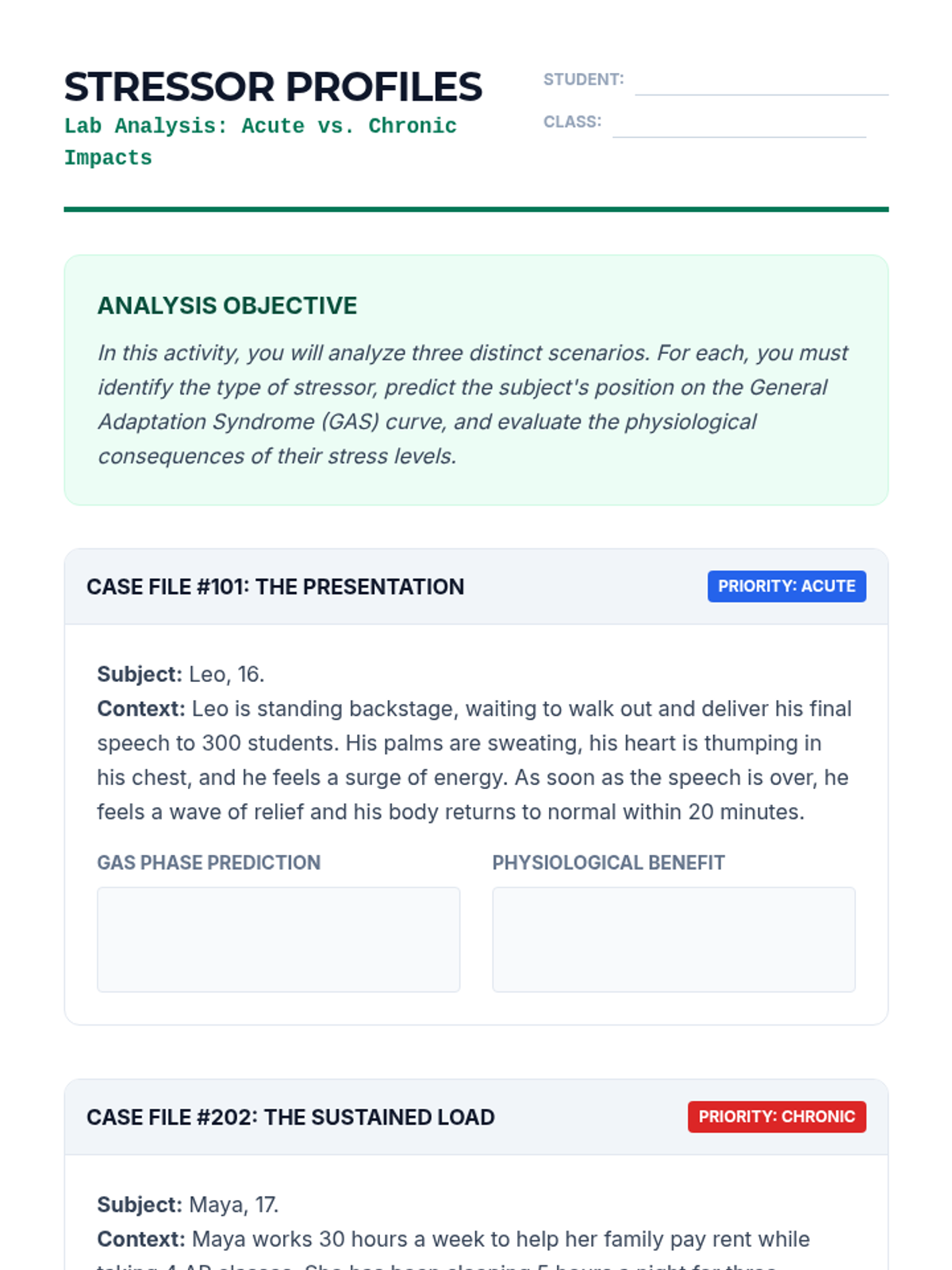 This sequence explores the biological and psychological dimensions of stress. Students move from understanding the 'fight-or-flight' physiological response to mastering cognitive restructuring and emotion-regulation strategies, culminating in the design of personalized stress management protocols.