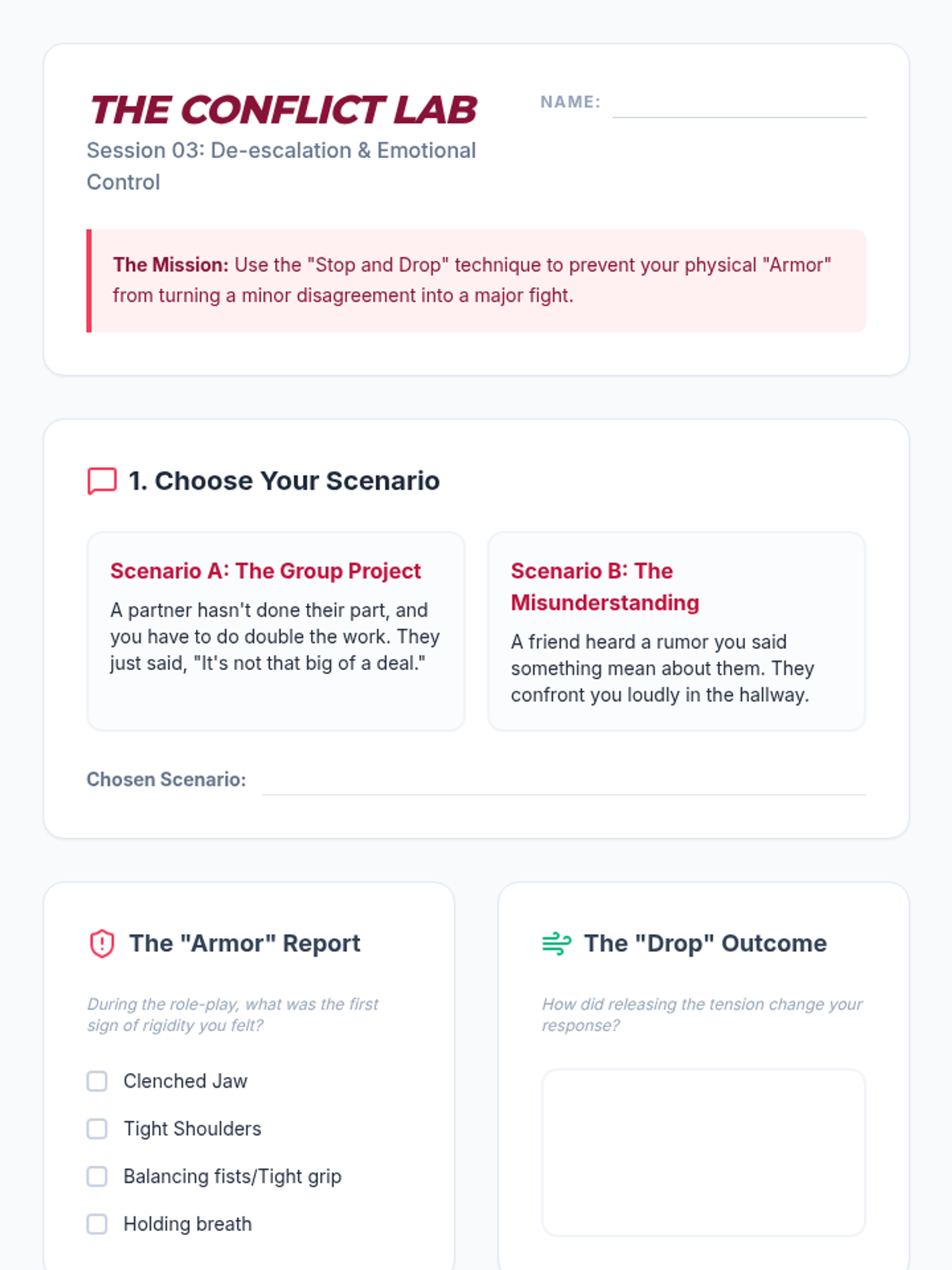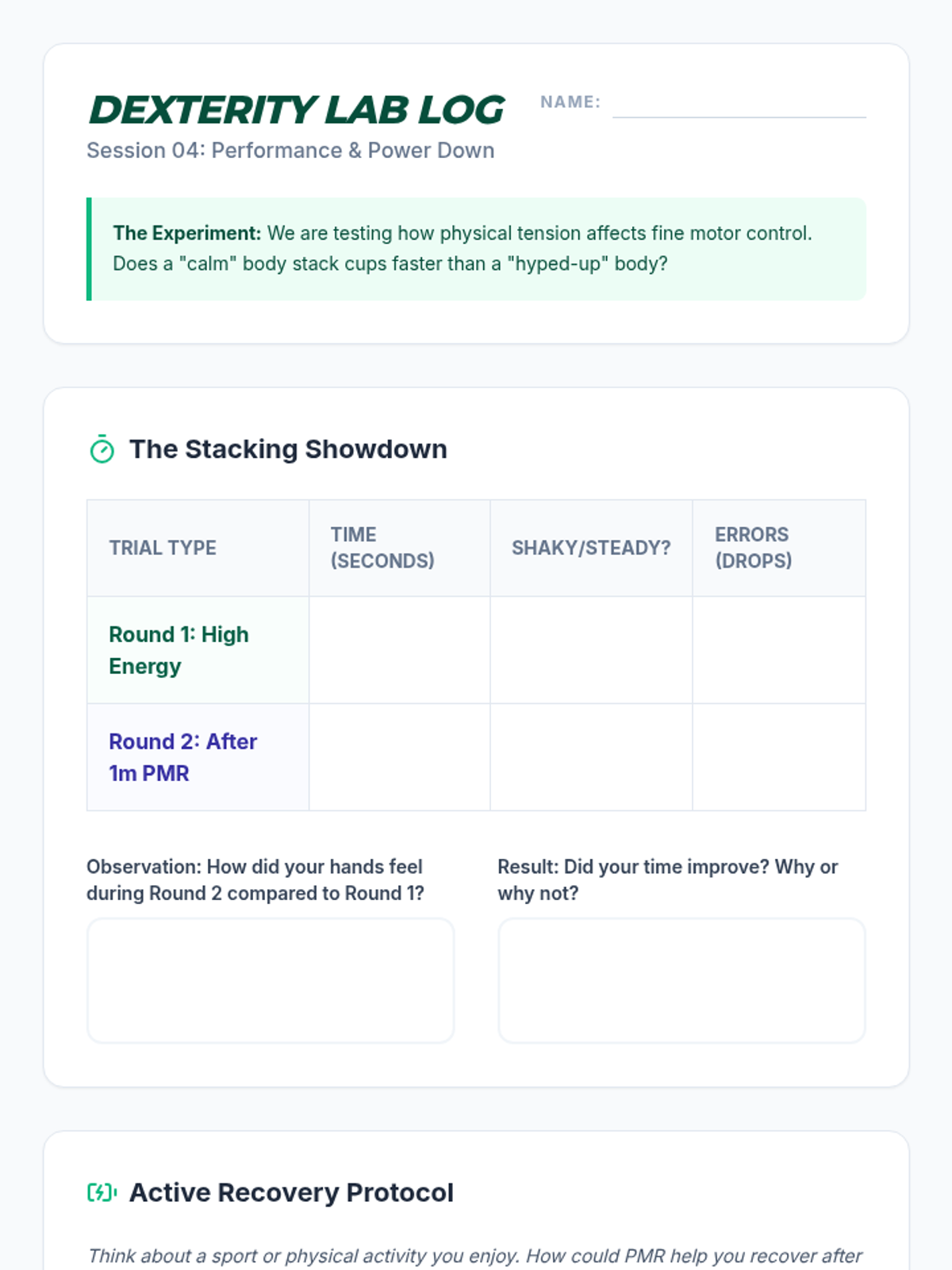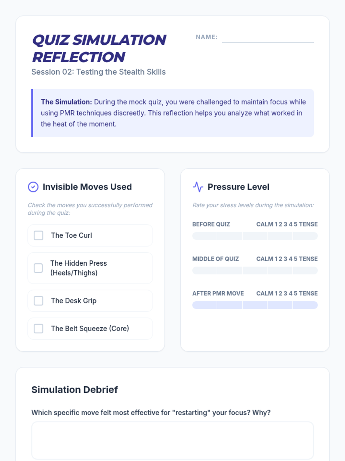 This 7th-grade sequence teaches Progressive Muscle Relaxation (PMR) through real-world applications. Students move from identifying physiological stress triggers to mastering discreet relaxation techniques for tests, social conflicts, and sports performance, culminating in a personalized mental health 'User Manual'.
