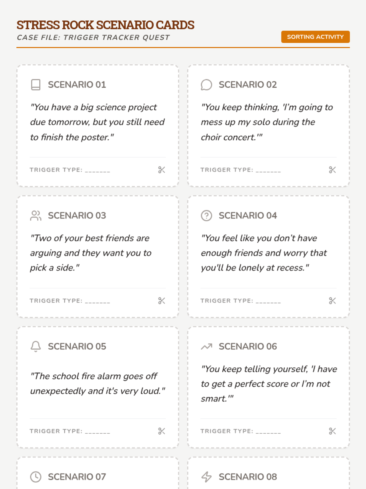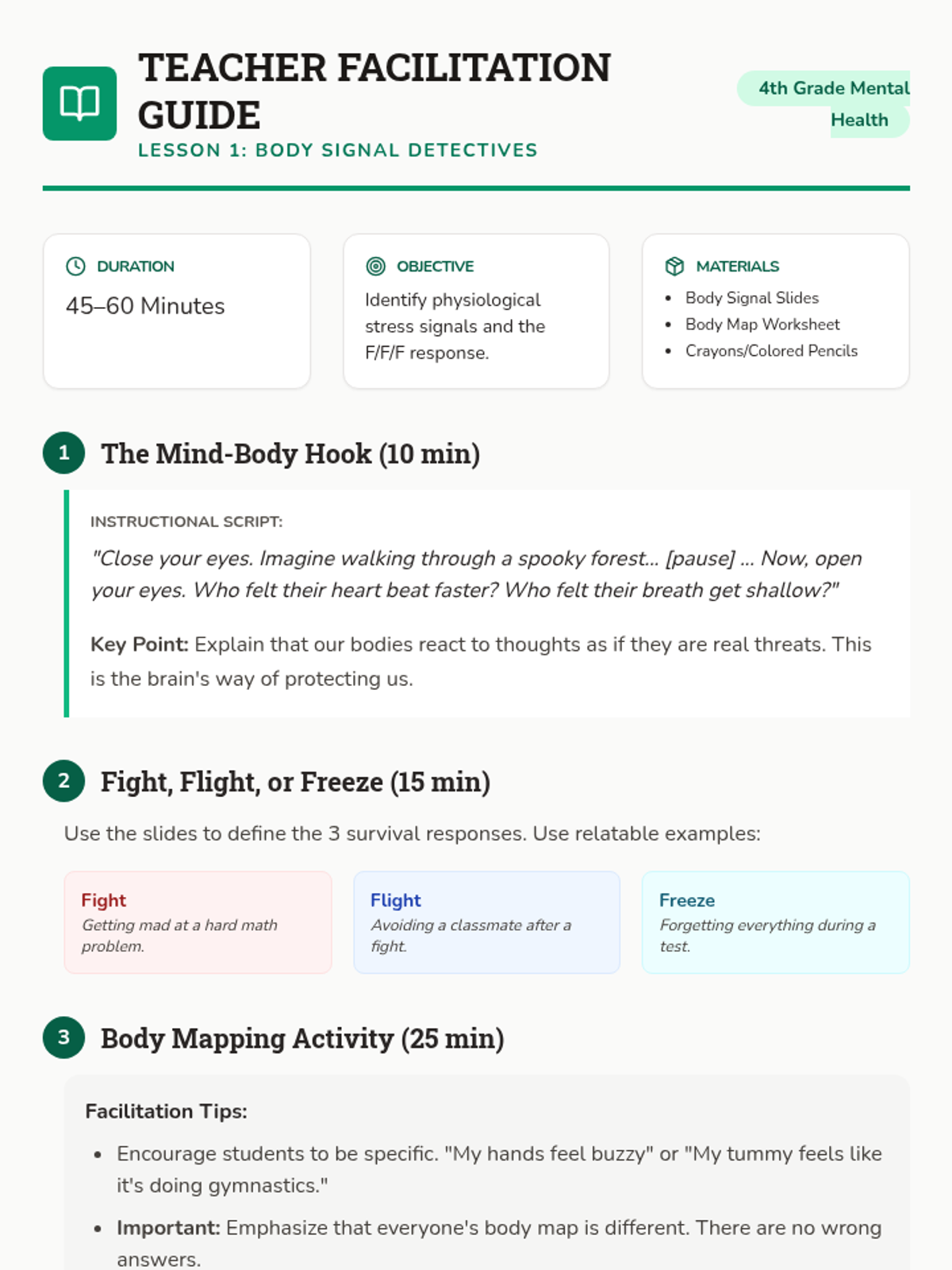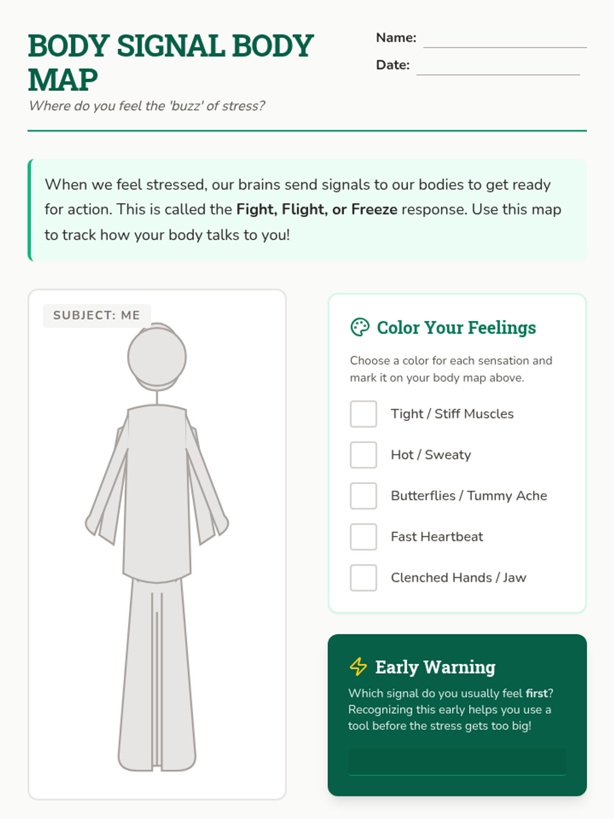 This 4th-grade sequence empowers students to identify physical stress responses, categorize internal and external triggers, and develop a personalized library of coping mechanisms. Through body mapping, mindfulness workshops, and organizational simulations, students build a 'Stress Survival Toolkit' to navigate real-world challenges like testing and peer conflict.
