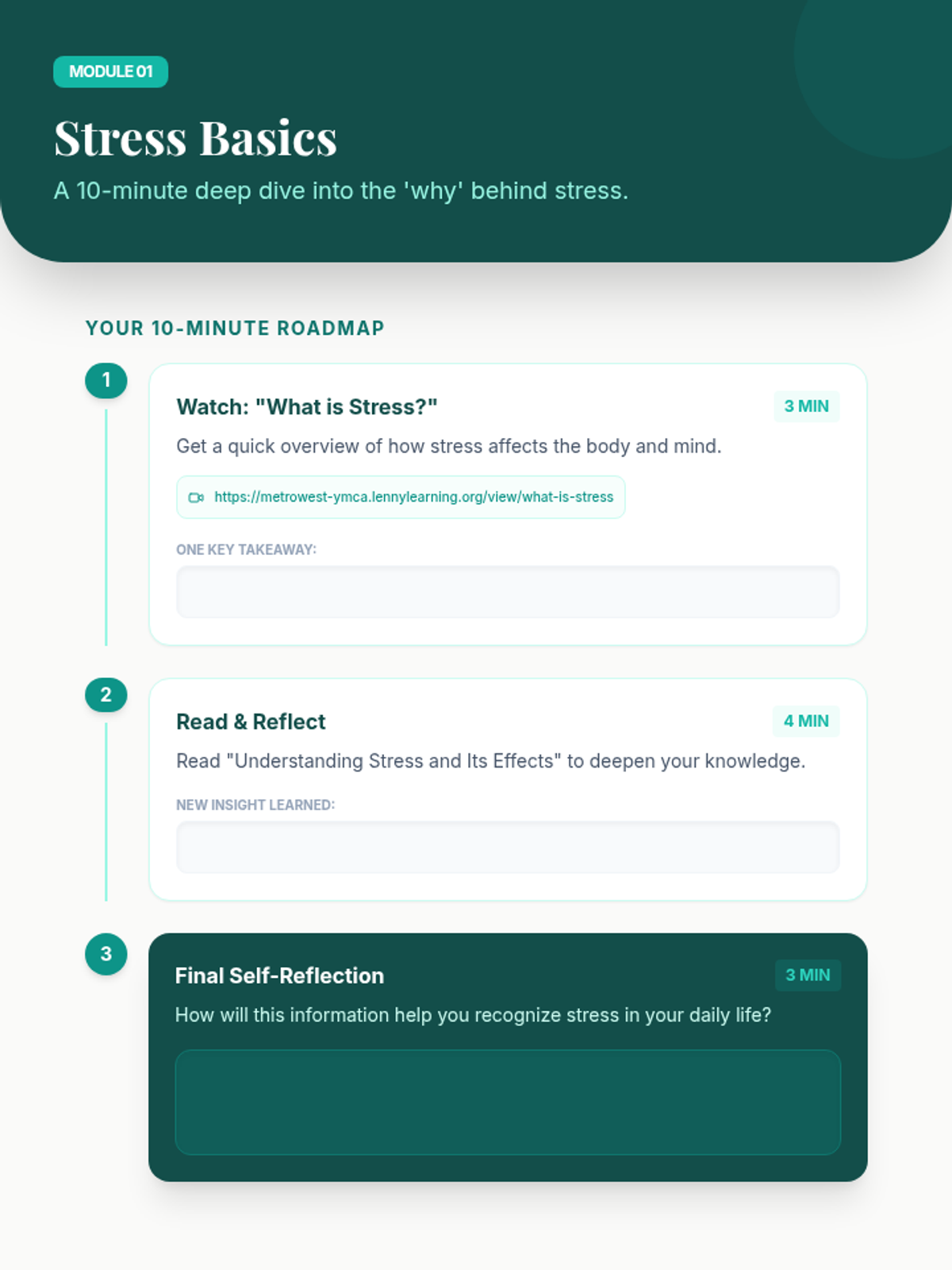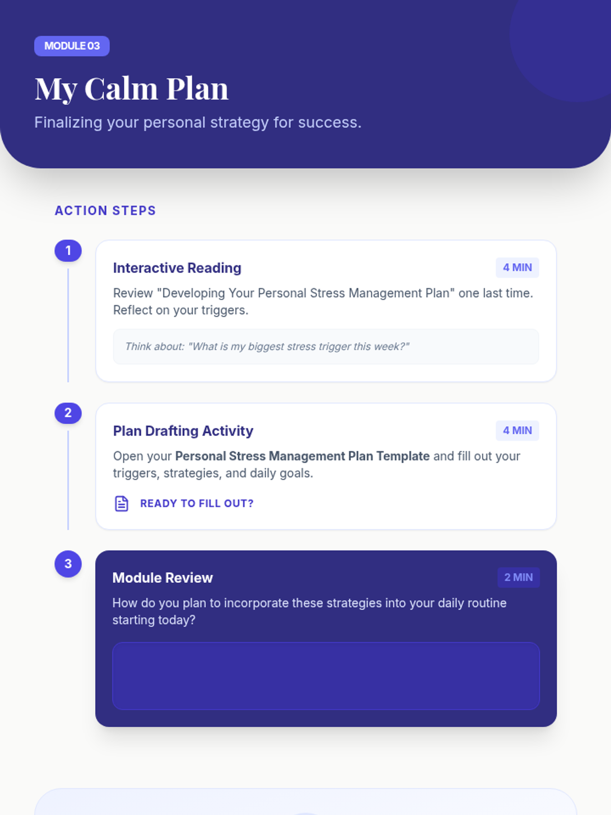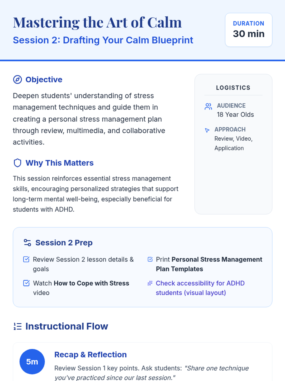 A comprehensive stress management series for 18-year-olds, featuring classroom sessions and self-led 10-minute modules. The series covers stress mechanics, practical coping techniques, and the creation of personalized management plans with ADHD-friendly structures.