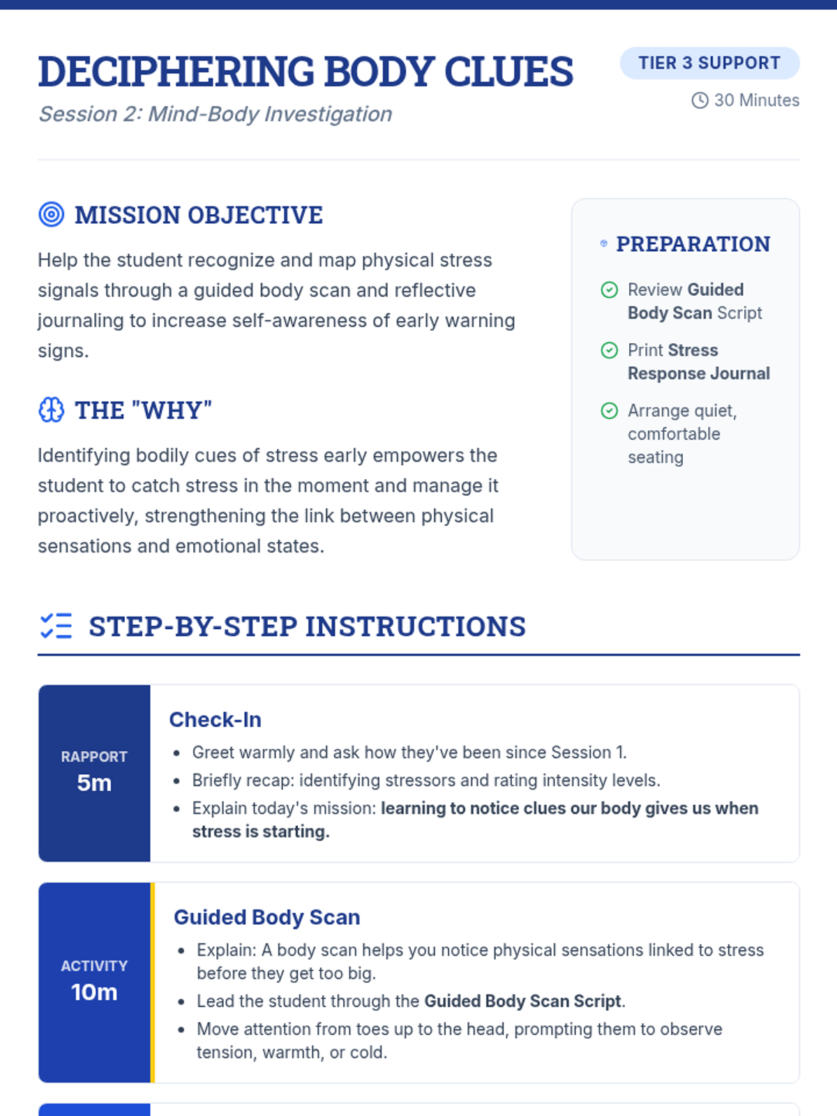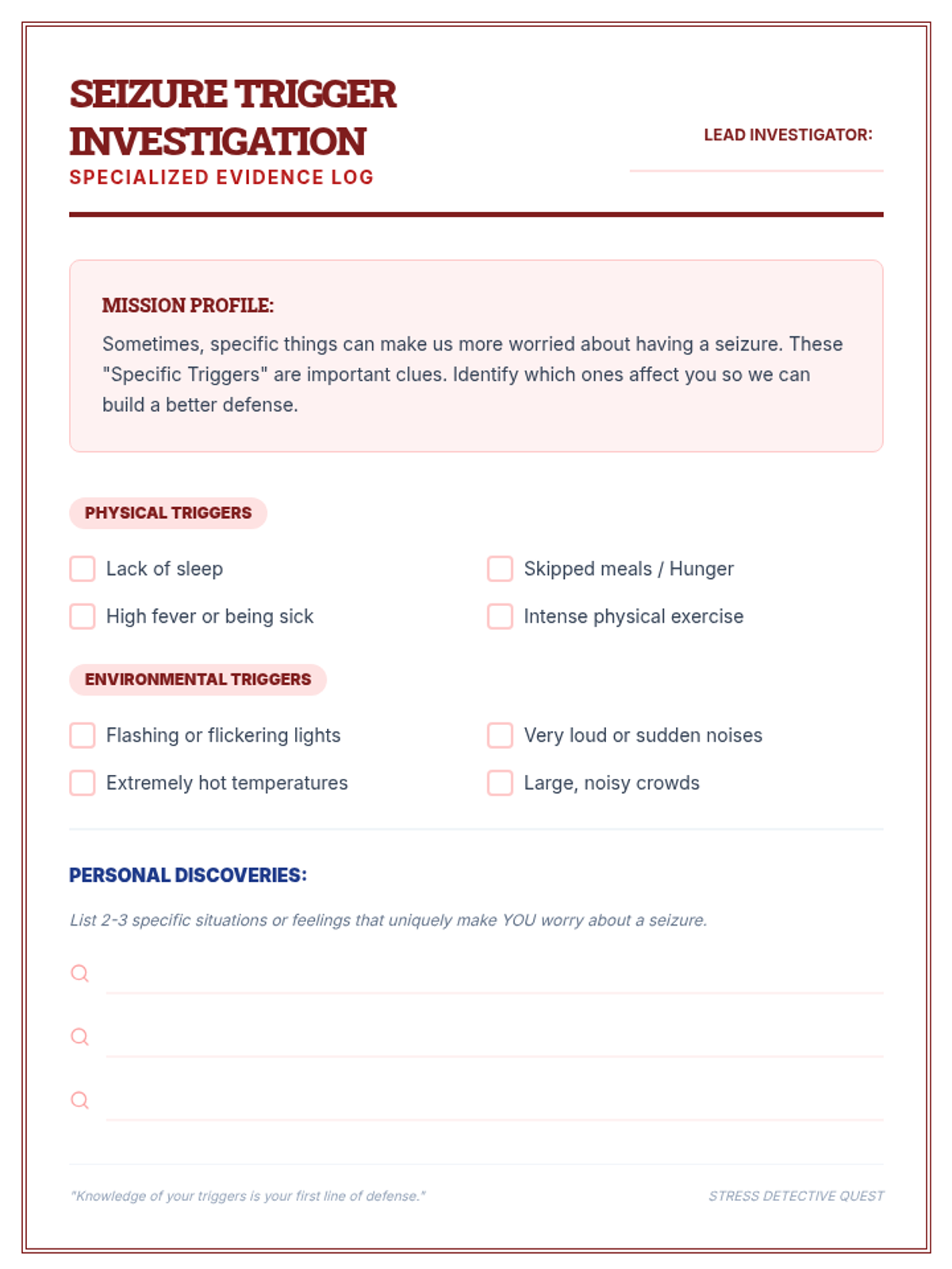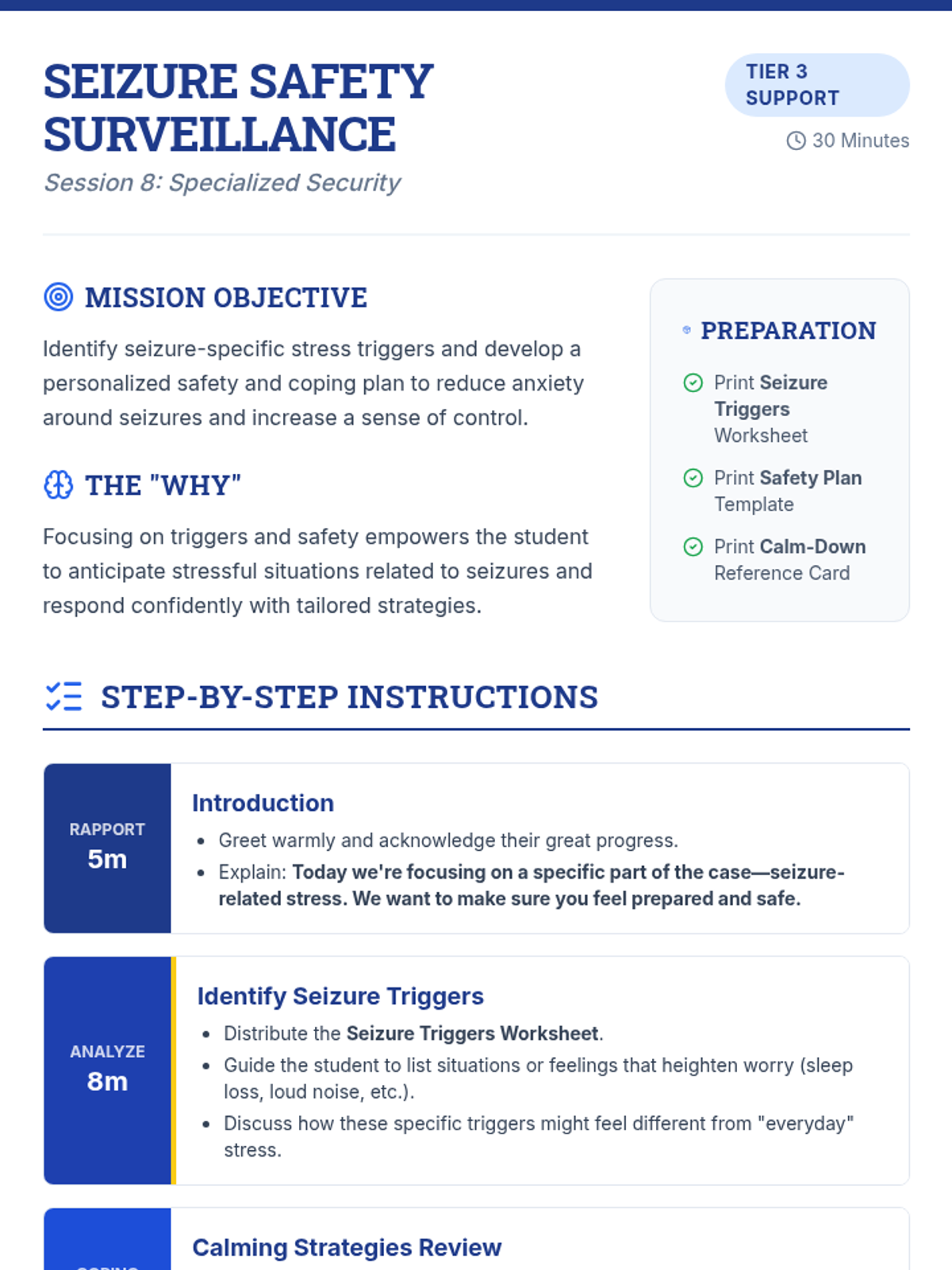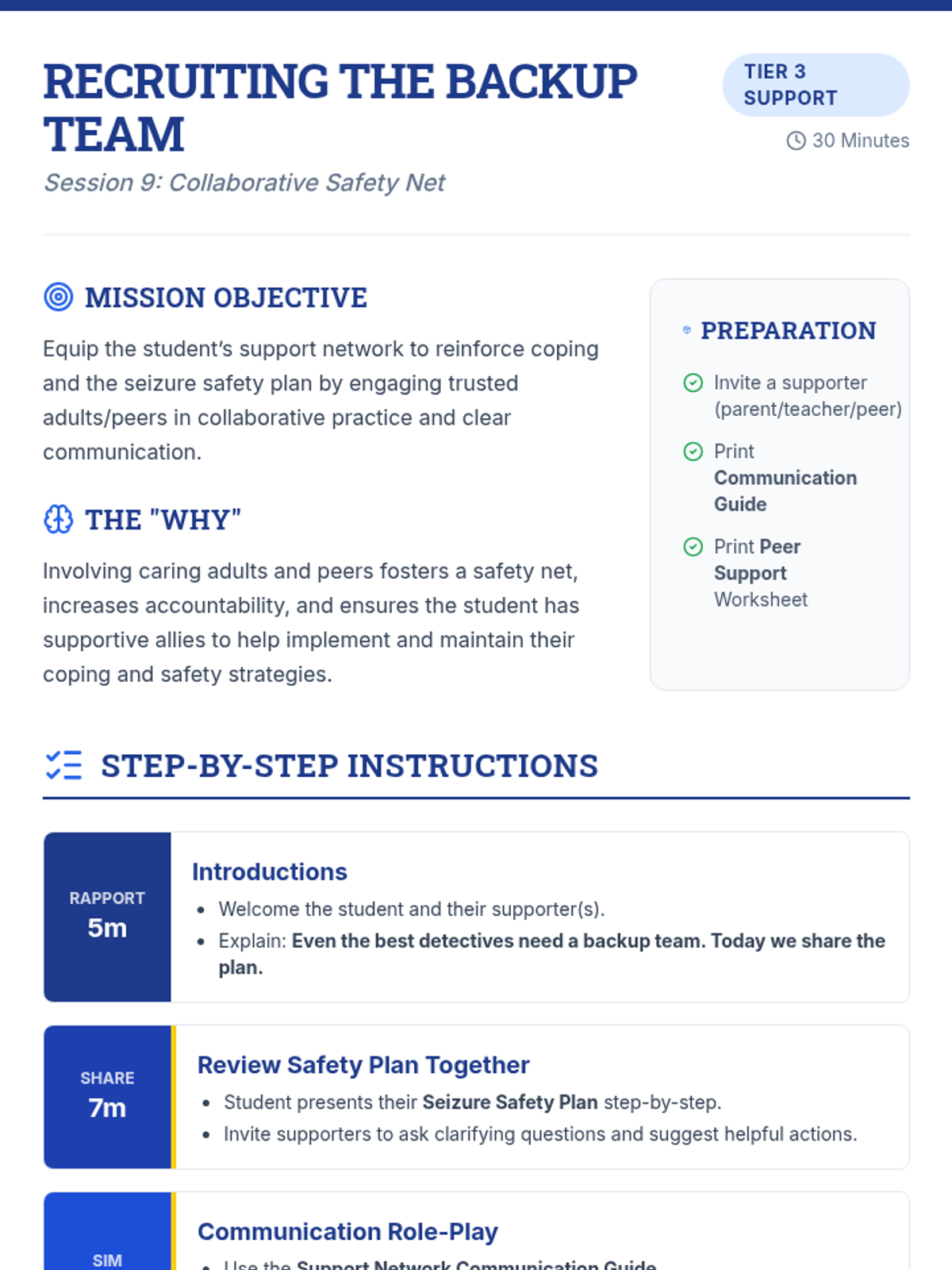 A 10-session Tier 3 support program for 7th-grade students with seizure histories, focusing on identifying stressors, physical cues, and evidence-based coping mechanisms through a 'Detective Quest' theme.